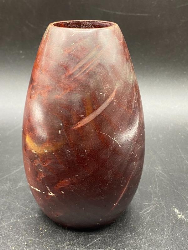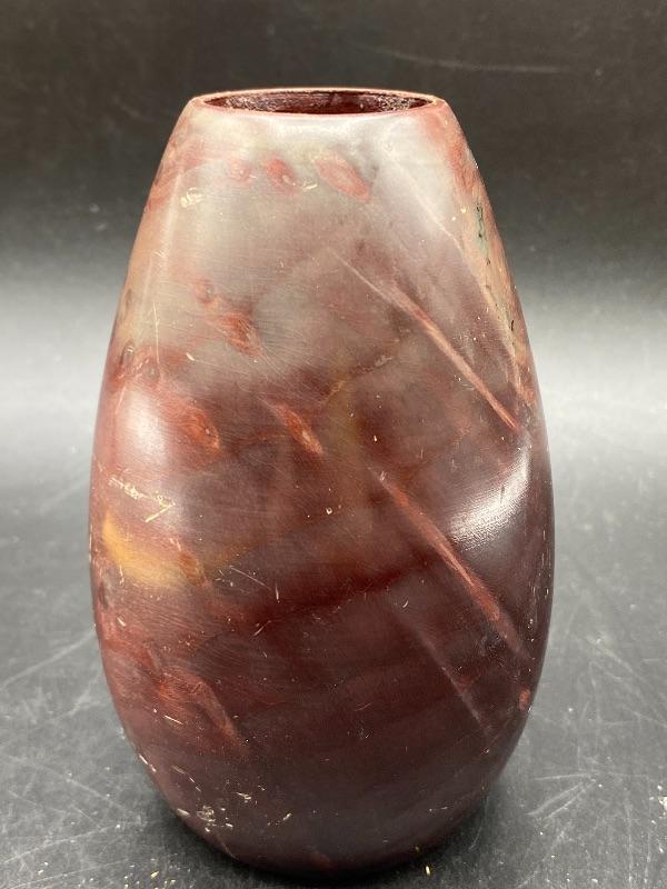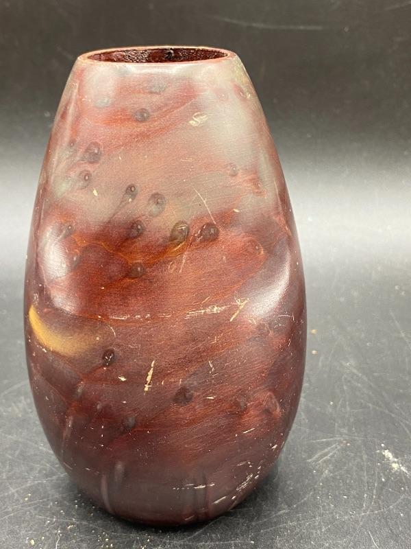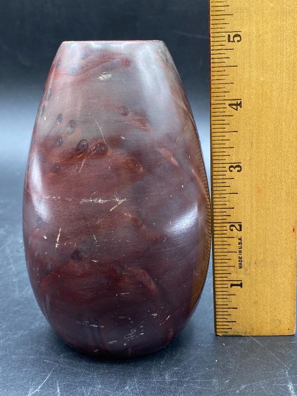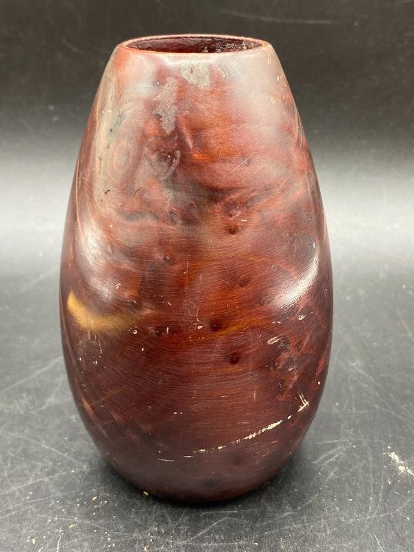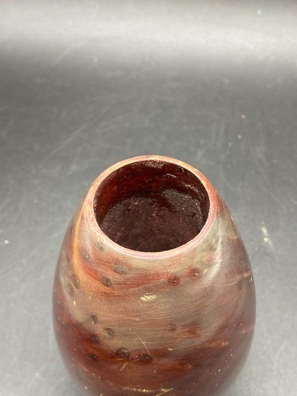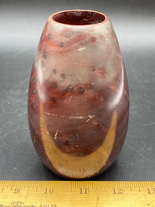 Small 5" vase made from California redwood burl. Has some nice color markings. Unfortunately it does have some scratches from storage.