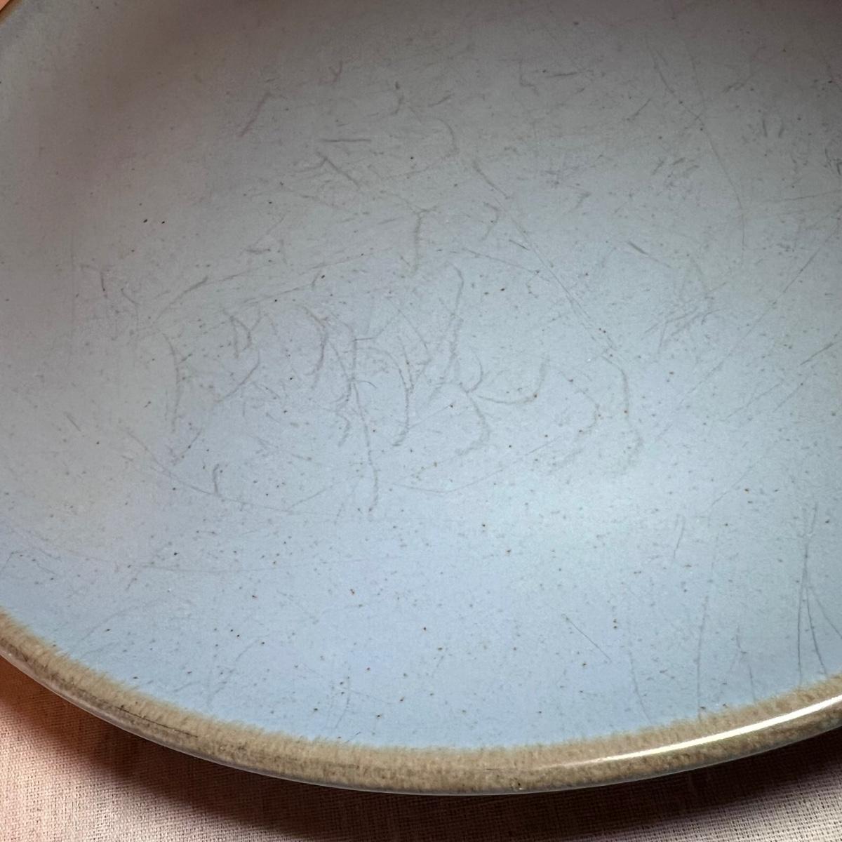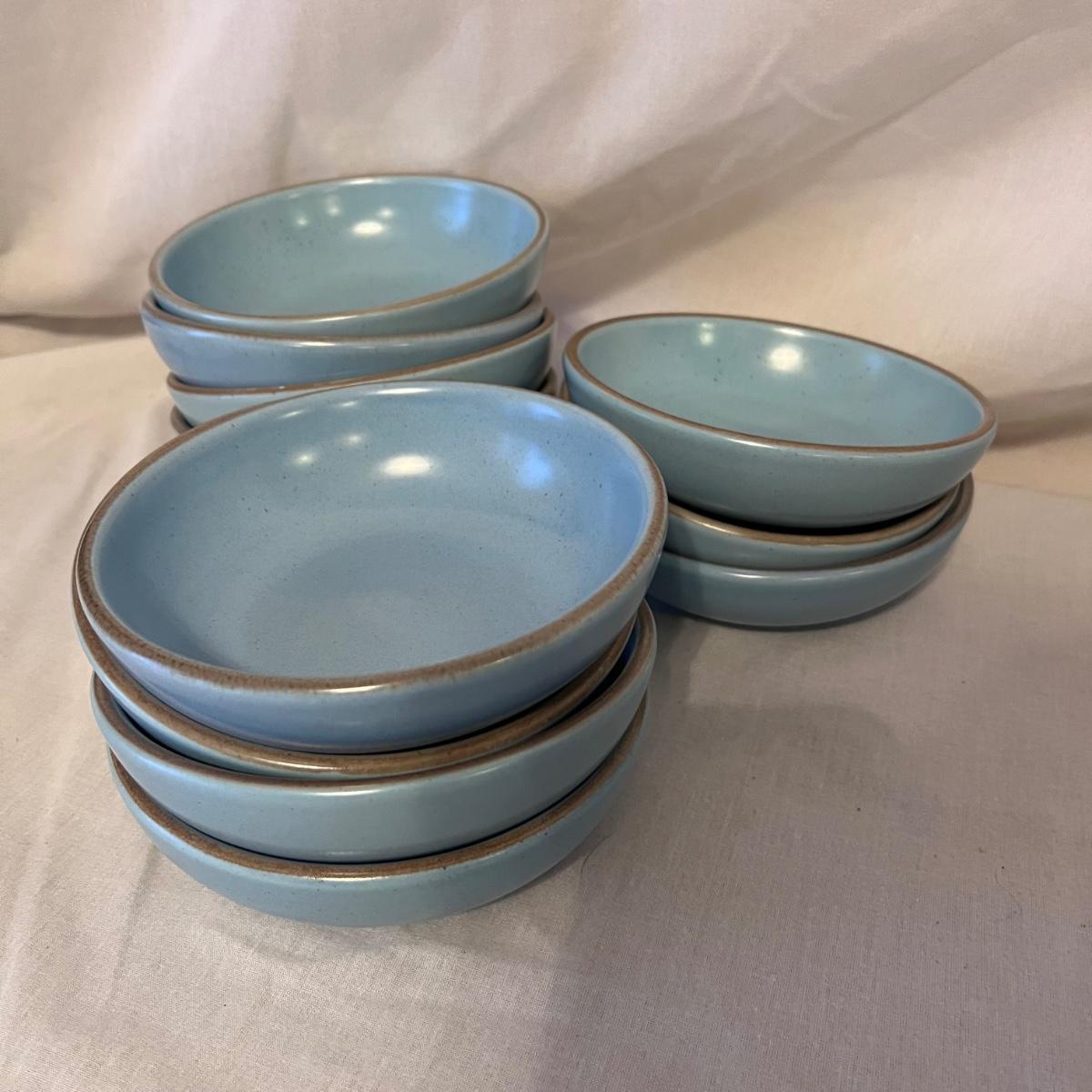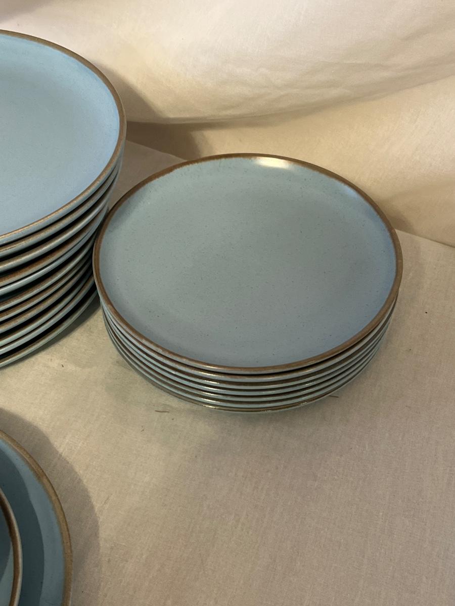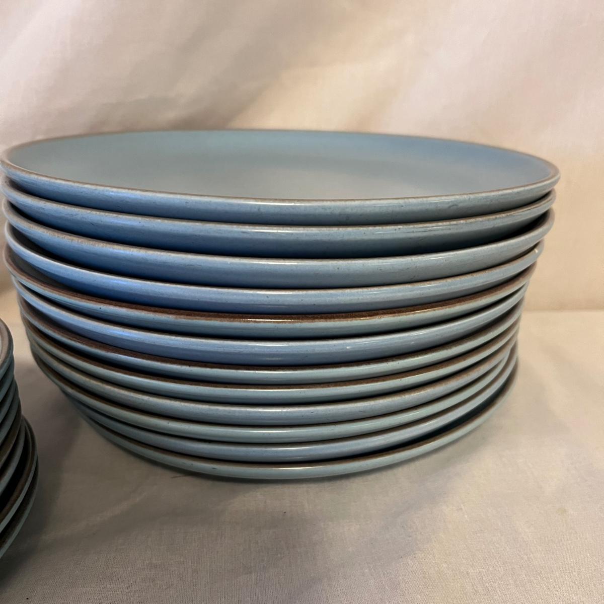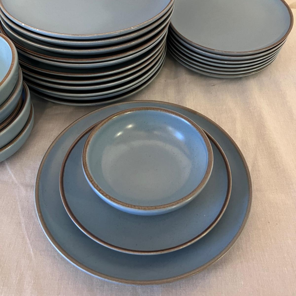 Blue California Tempo Poppy Trail by Metlox dinnerware. This set that has 12 each of dinner plates and bowls plus 8 side plates. Some cutlery scratches, particularly on the dinner plates.
