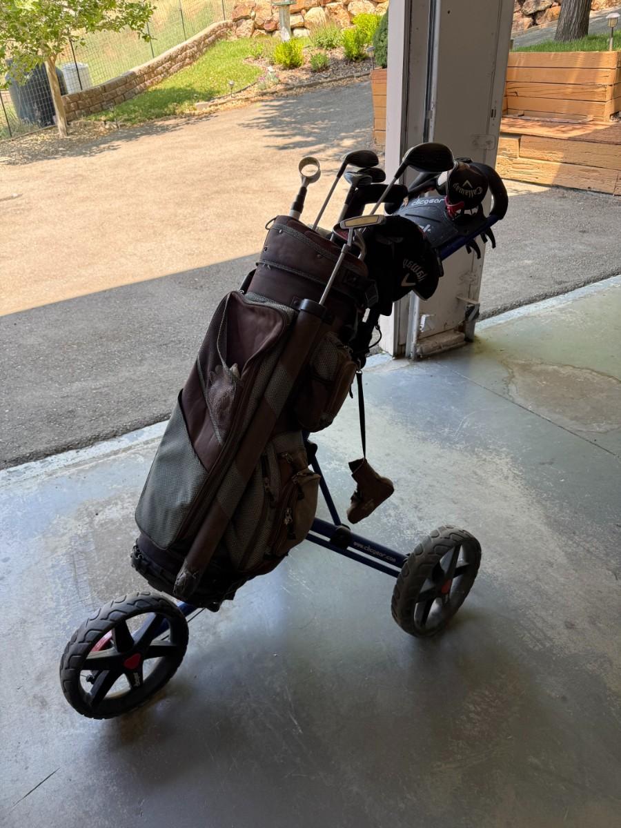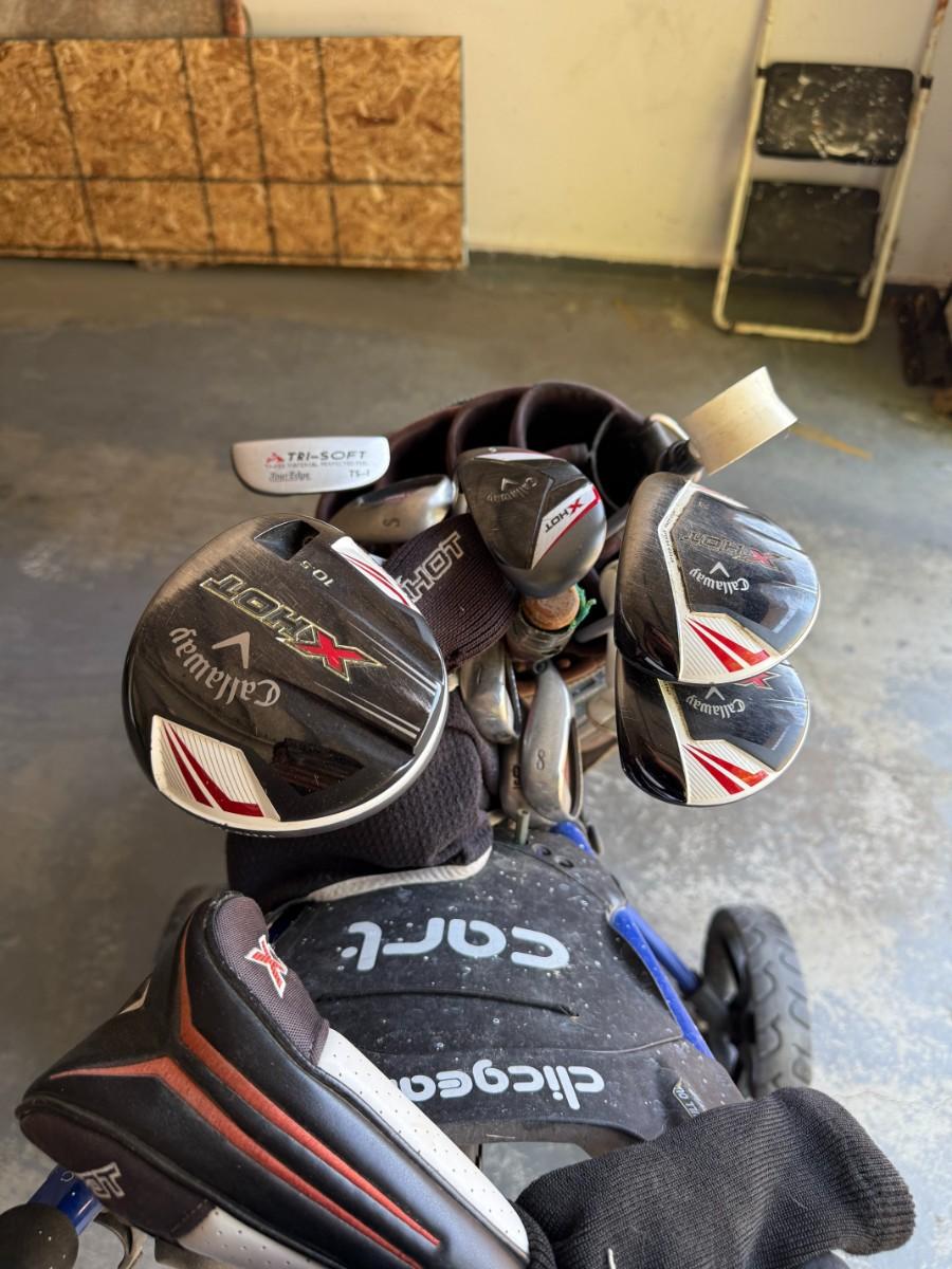 Complete set of Callaway clubs including drivers, irons, putter, and Clicgear cart. Great for beginners or casual golfers.
