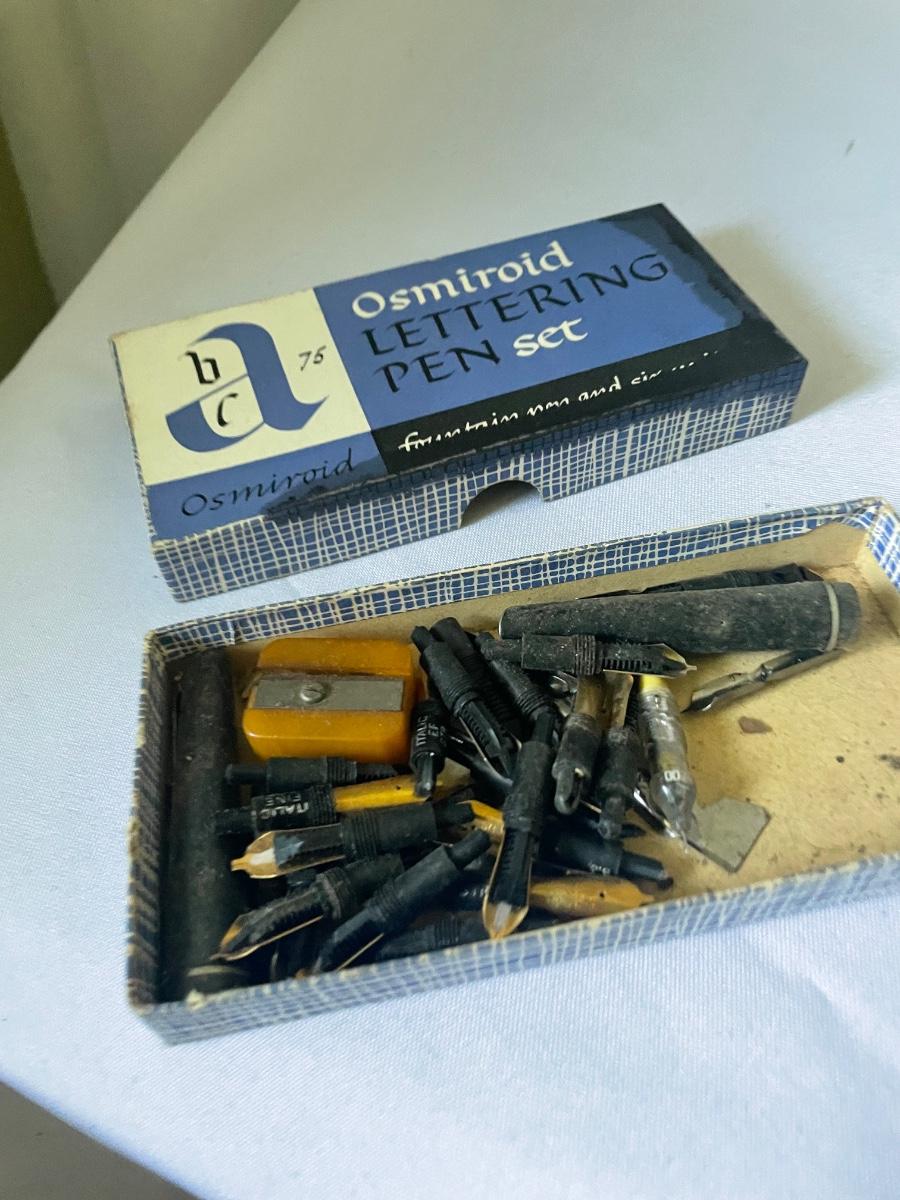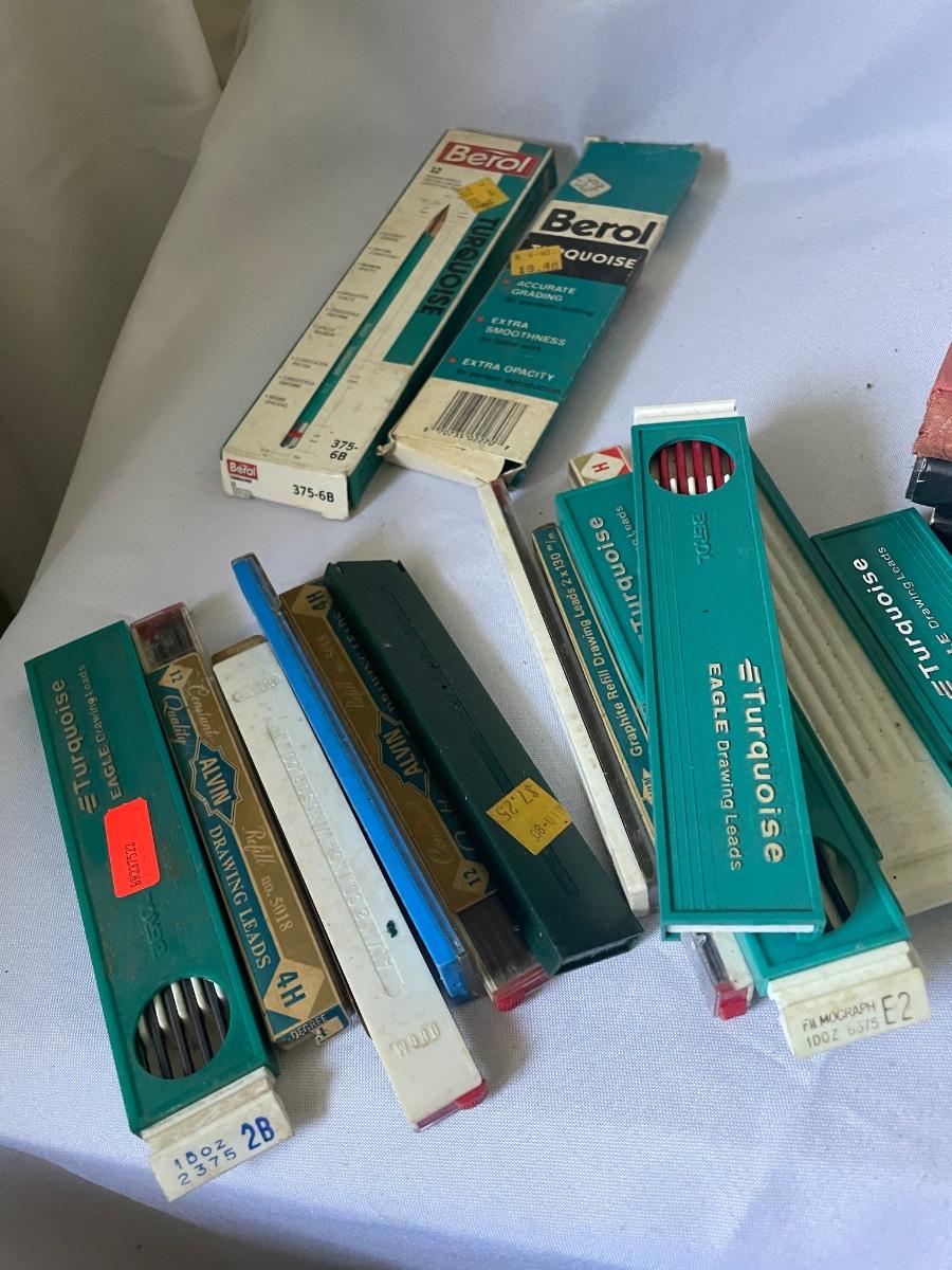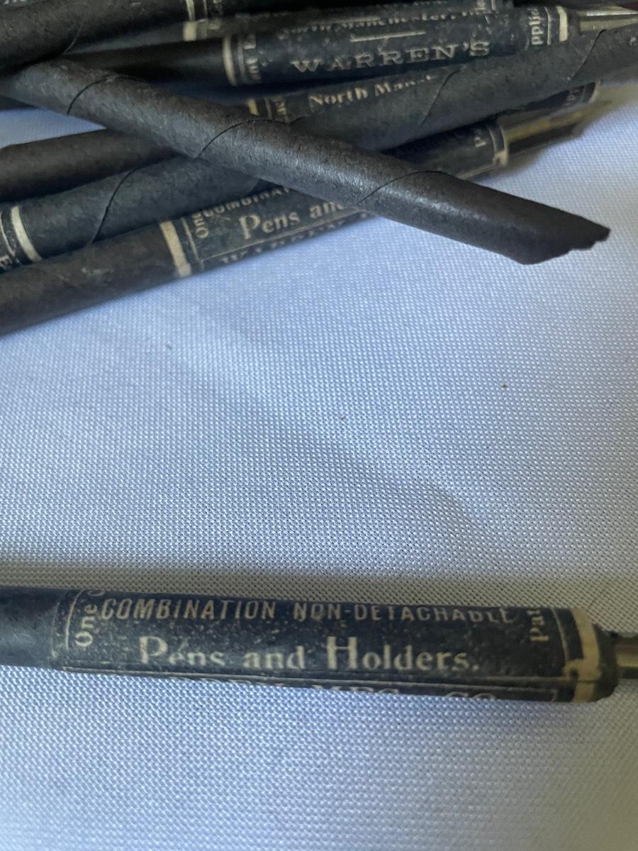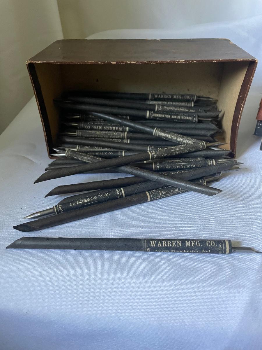 Seven books included in this lot plus over twenty fountain pens, some pen tops and pencil leads as well.