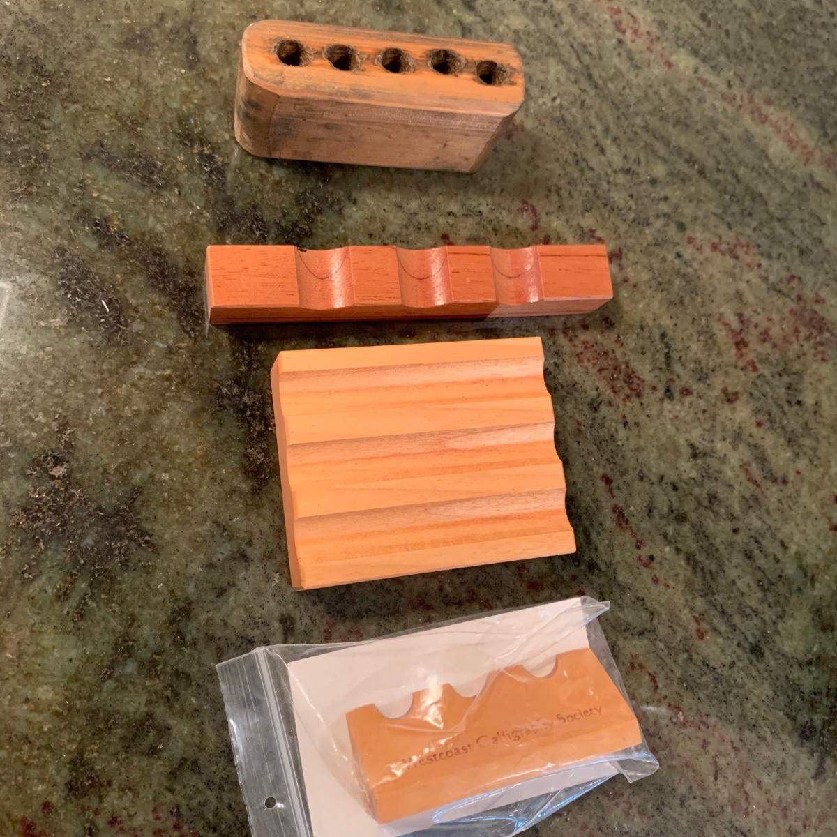 A nice variety of calligraphy pens, nibs, and pen holders. There are multiple Rotring ArtPens with nibs and ink, two NIB Speedball quills, one with ink and one with multiple nibs. There is a hand blown glass pen holder, as well as four wooden pen holders. There are four glass calligraphy pens, one of which (the blue one) has had the tip broken off. Also, a Concorde ink blotter and many nibs.