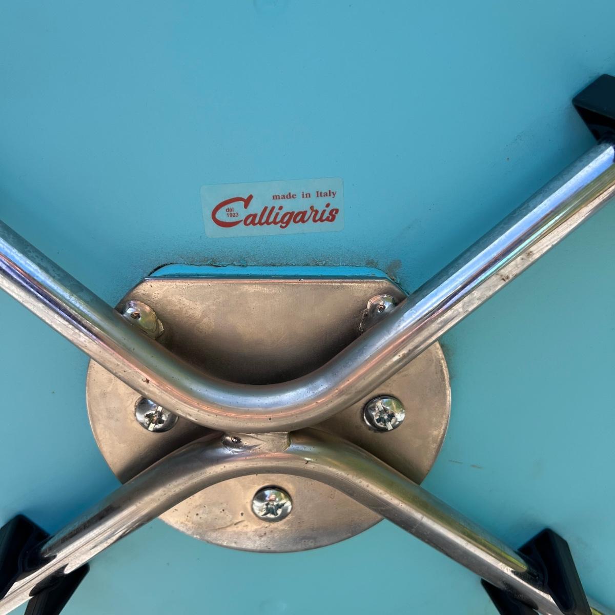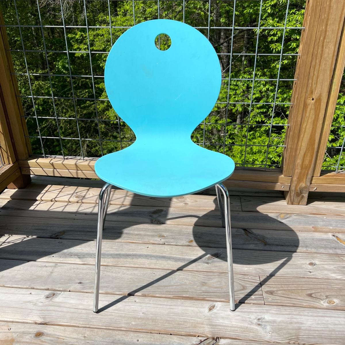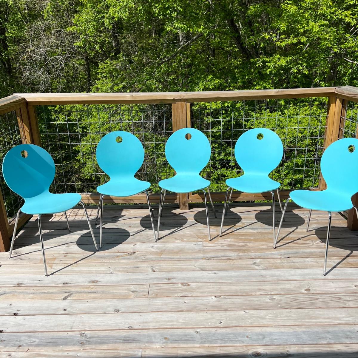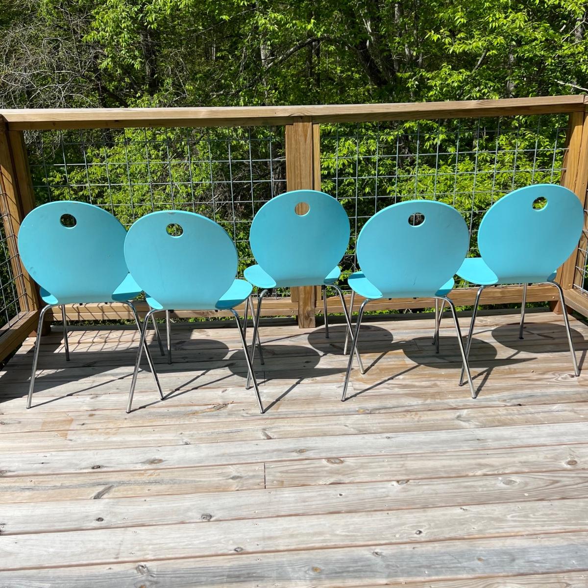Five vintage Calligaris dining chairs in aqua blue. The chairs have a round handle on the back for easy pick up and moving around. Each chair measures 18” x 15” x 33.75”H. The chair seat height is 18”. Local pick up only.