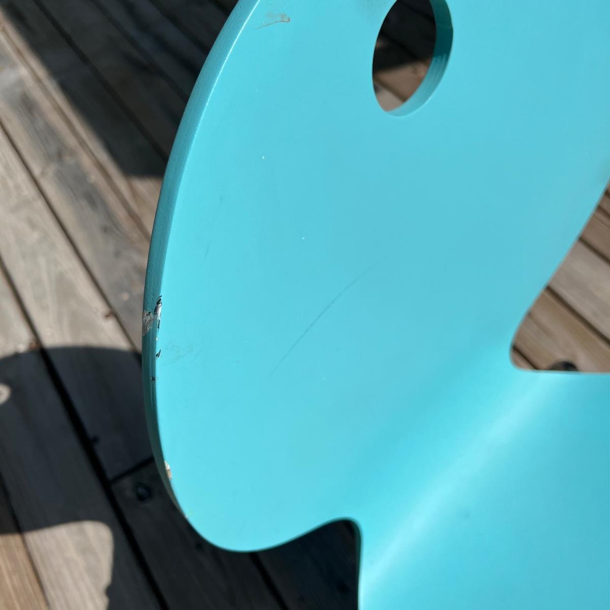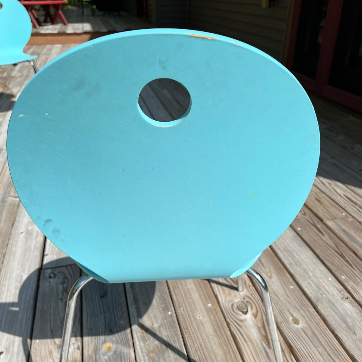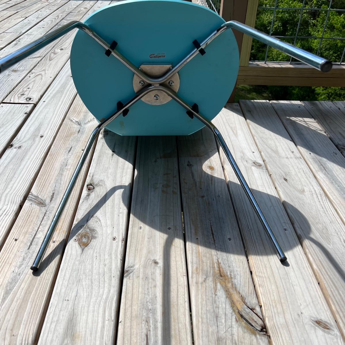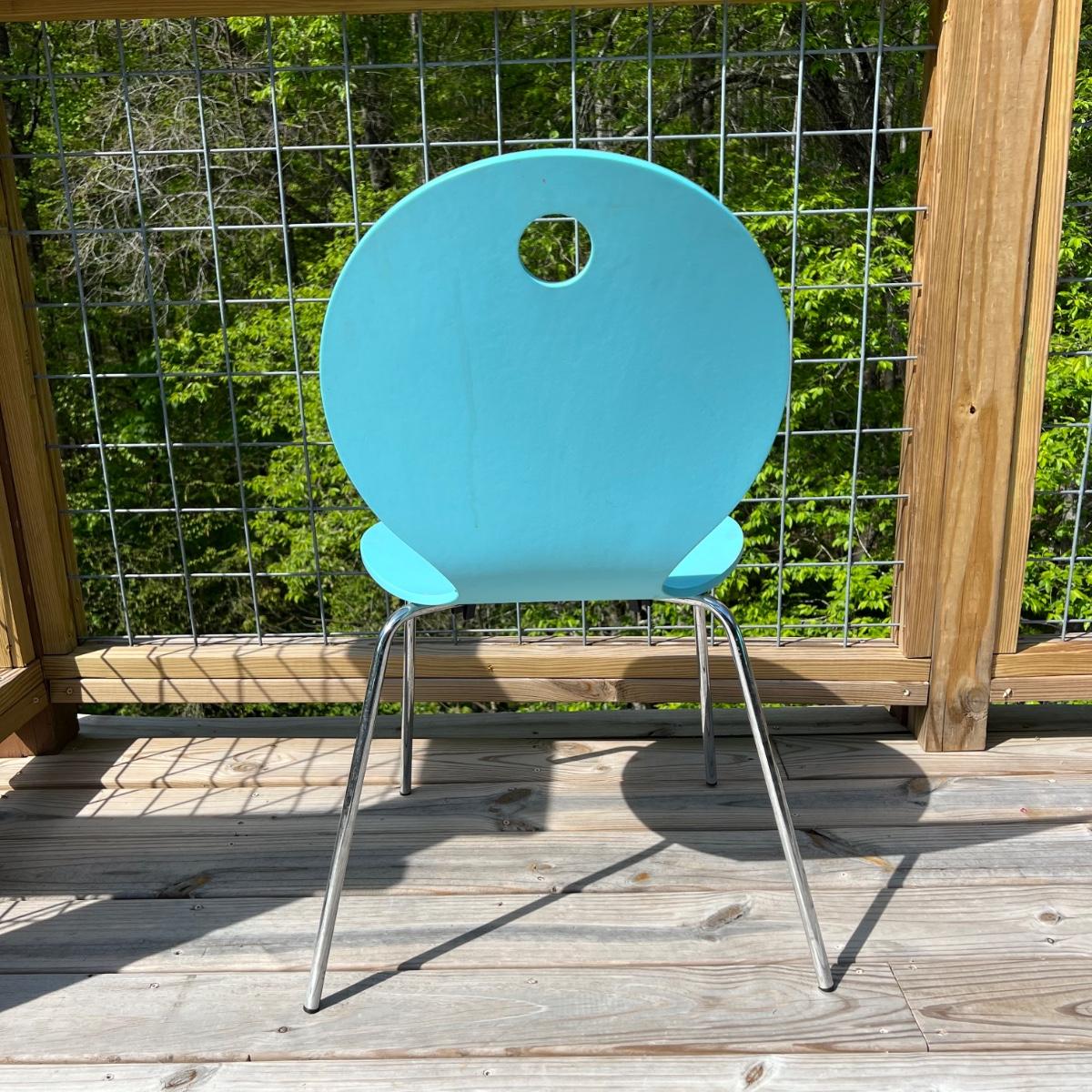 Five vintage Calligaris dining chairs in aqua blue. The chairs have a round handle on the back for easy pick up and moving around. Each chair measures 18” x 15” x 33.75”H. The chair seat height is 18”. Local pick up only.