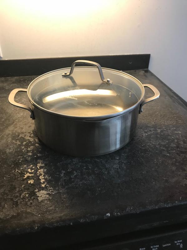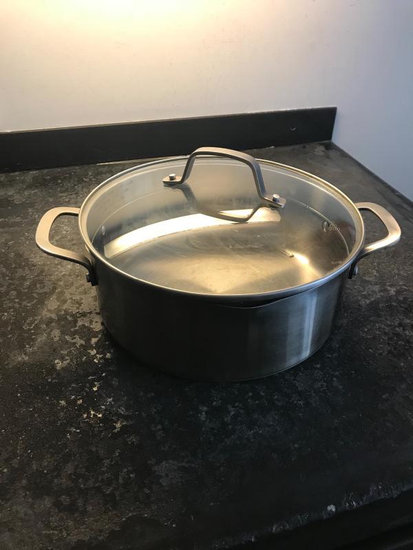 Stainless-steel 6-1/2-quart soup pot with aluminum core provides fast, even heating