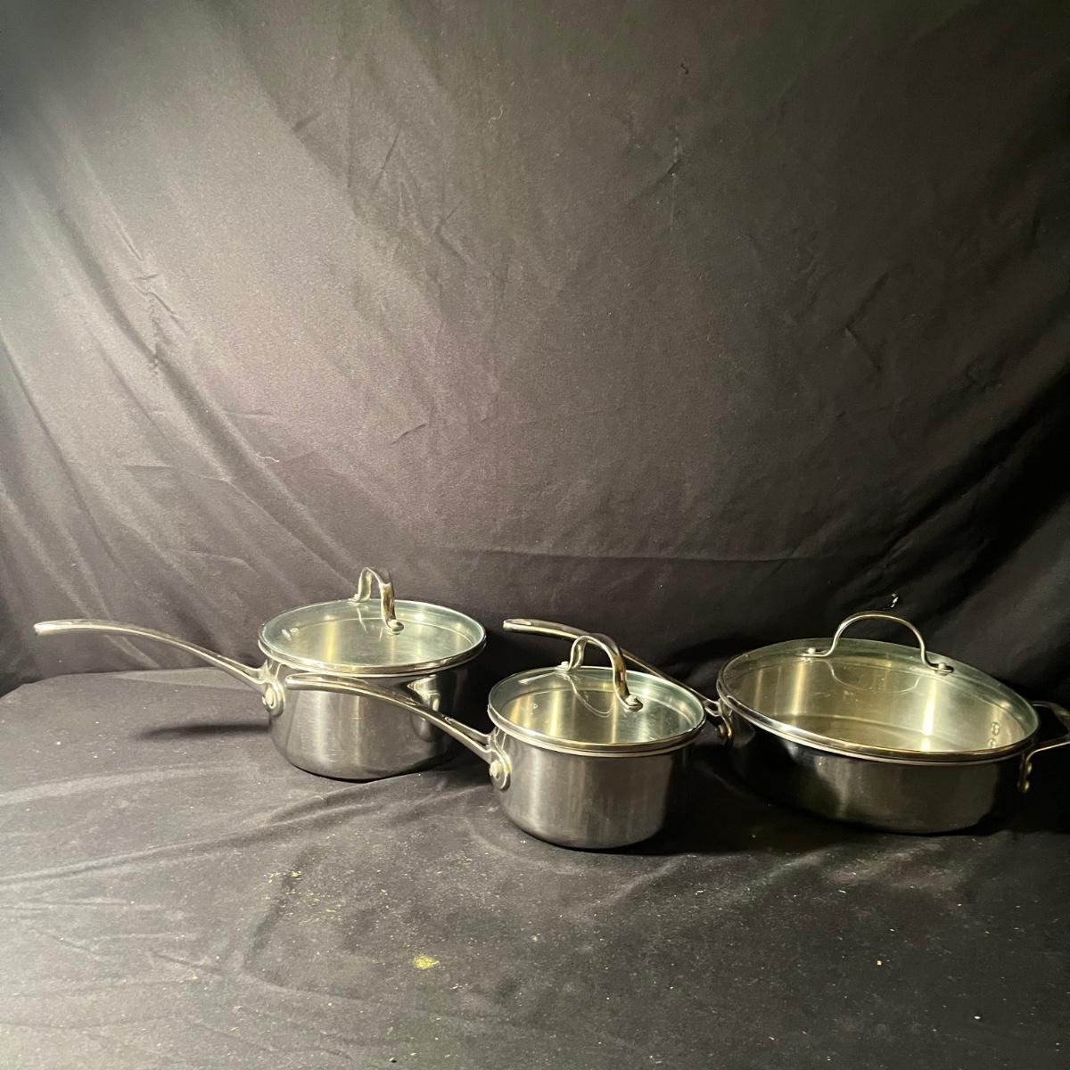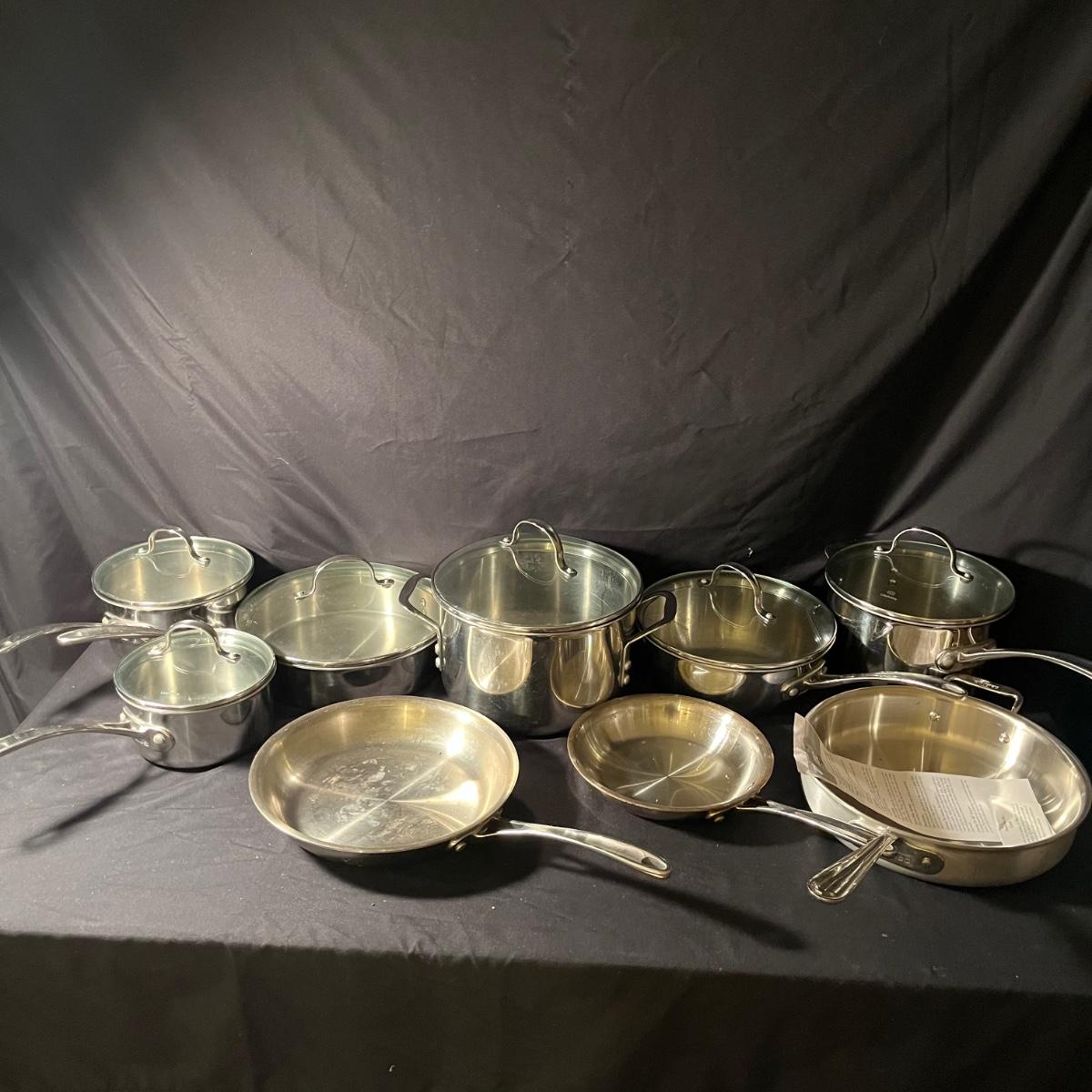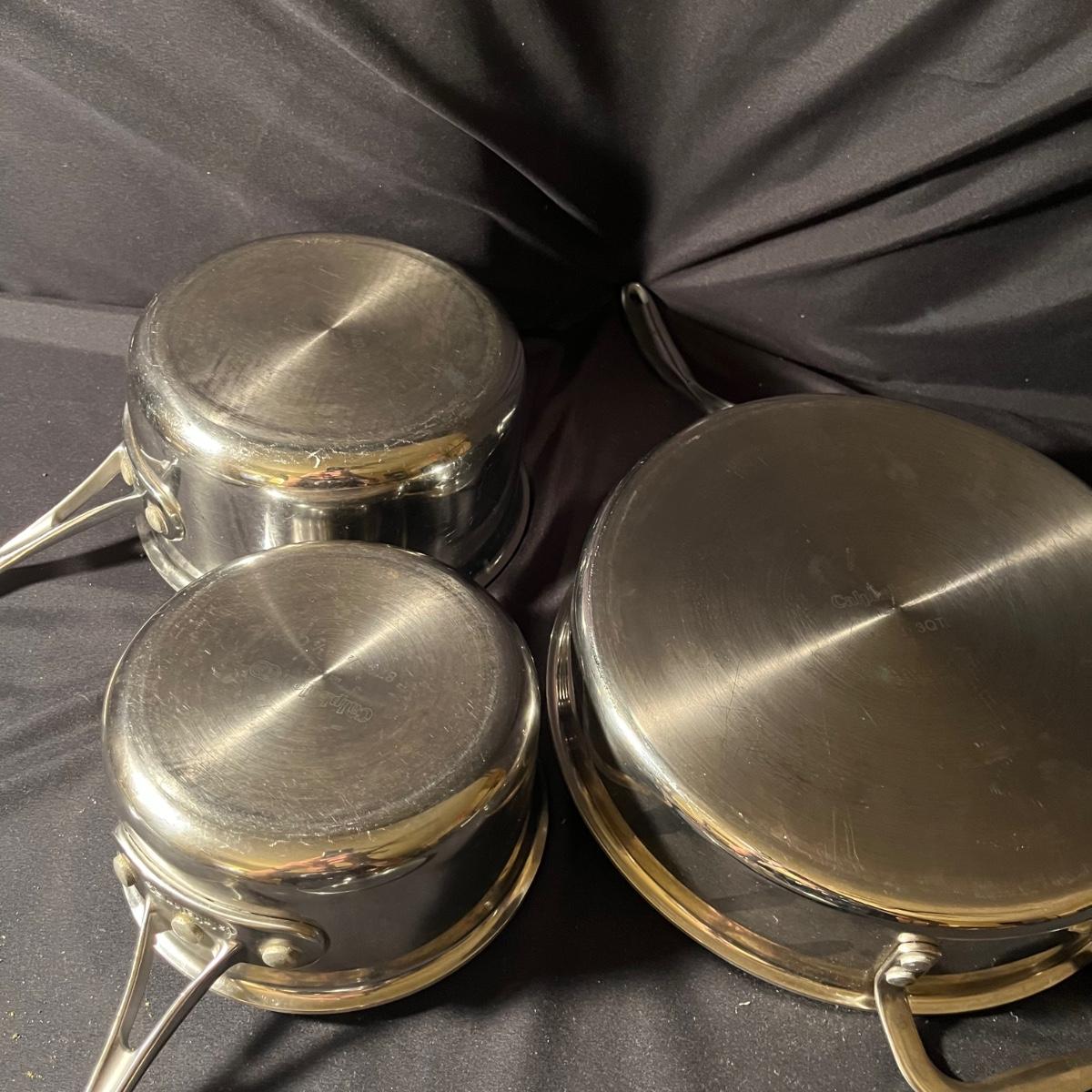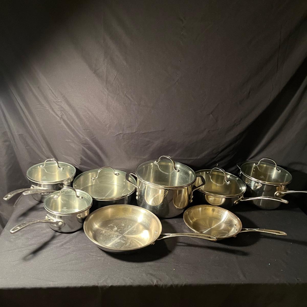 Lot contains a fourteen piece Calphalon stainless steel cookware set. Set includes six lids, four handled pots, two frying pans and two dual handled pots. Pieces are worn from use but have plenty of life left in them.Largest pot measures 10”D x 5.5”D. Also includes a Master Chef pan.