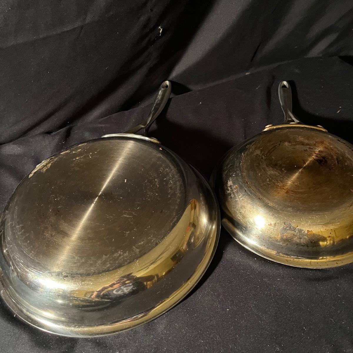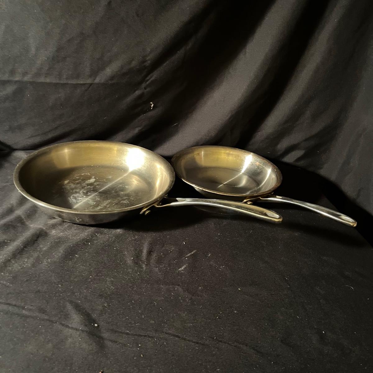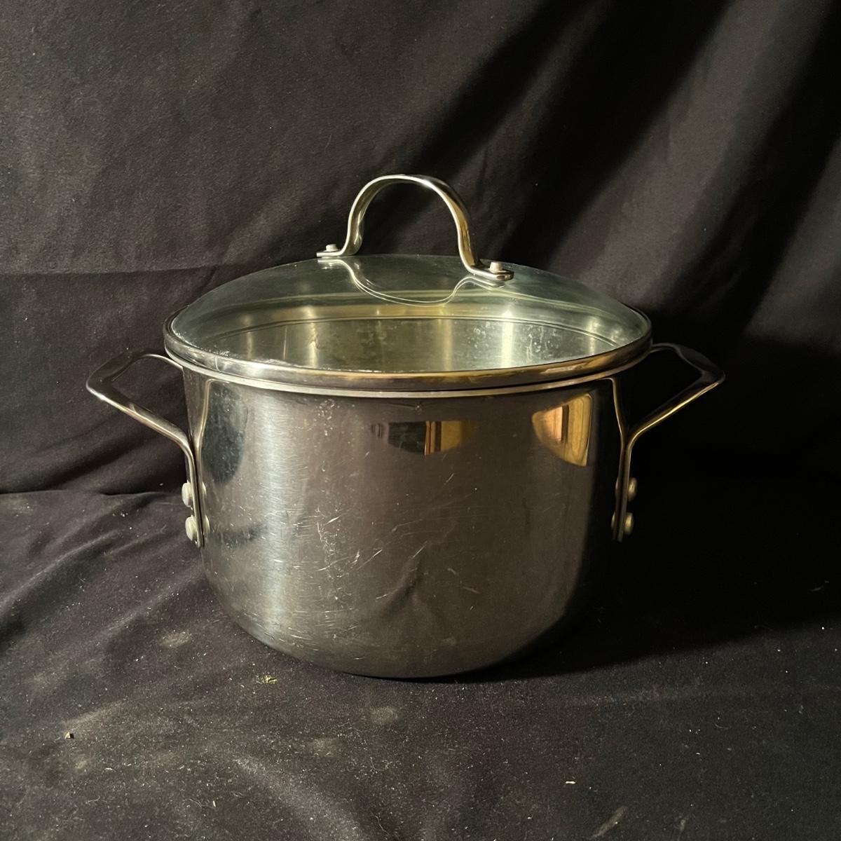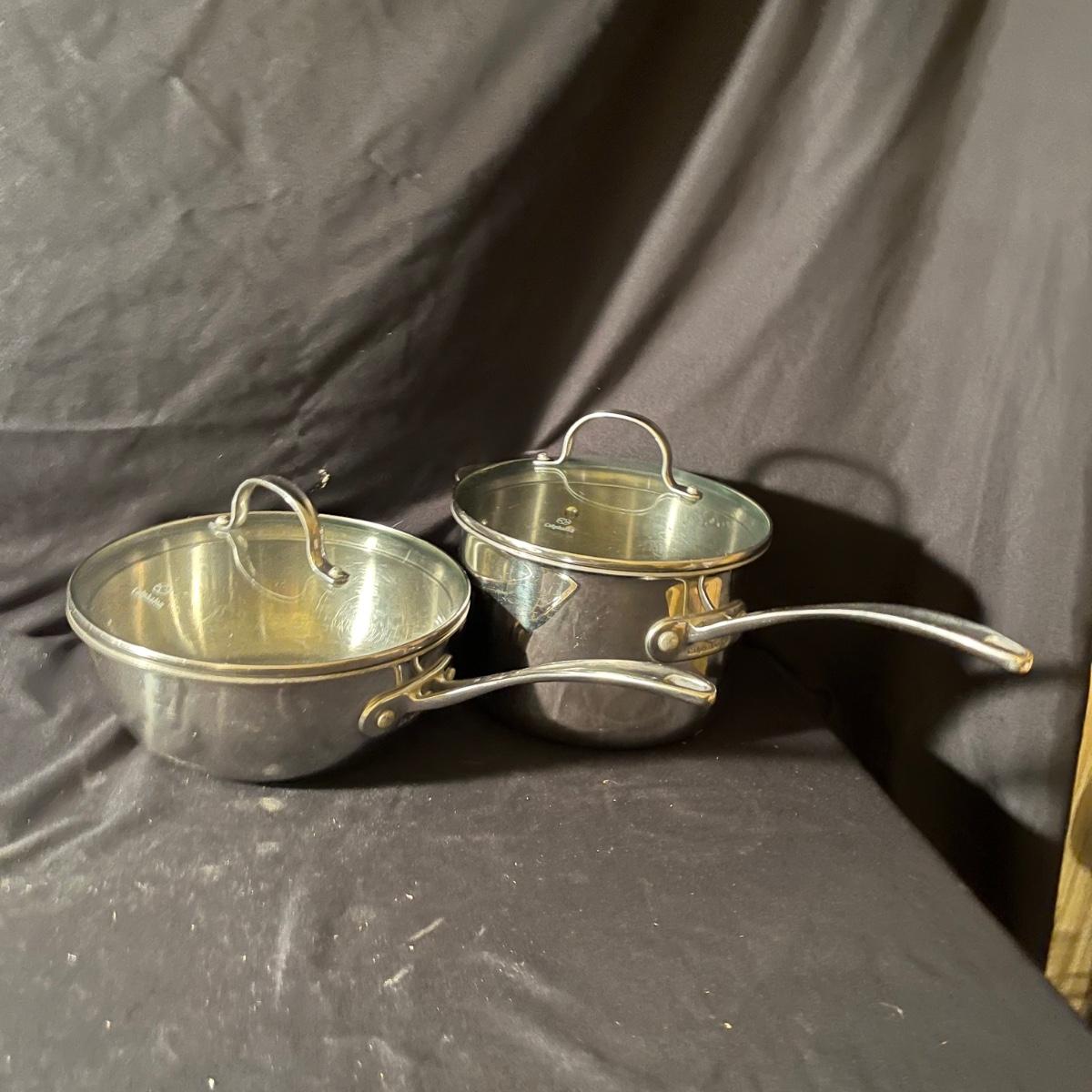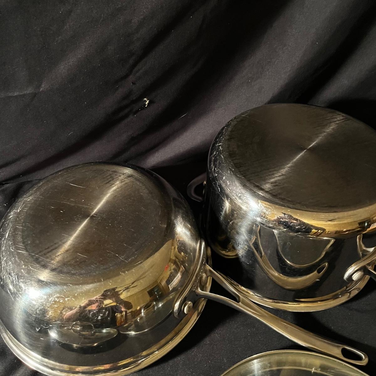 Lot contains a fourteen piece Calphalon stainless steel cookware set. Set includes six lids, four handled pots, two frying pans and two dual handled pots. Pieces are worn from use but have plenty of life left in them.Largest pot measures 10”D x 5.5”D. Also includes a Master Chef pan.