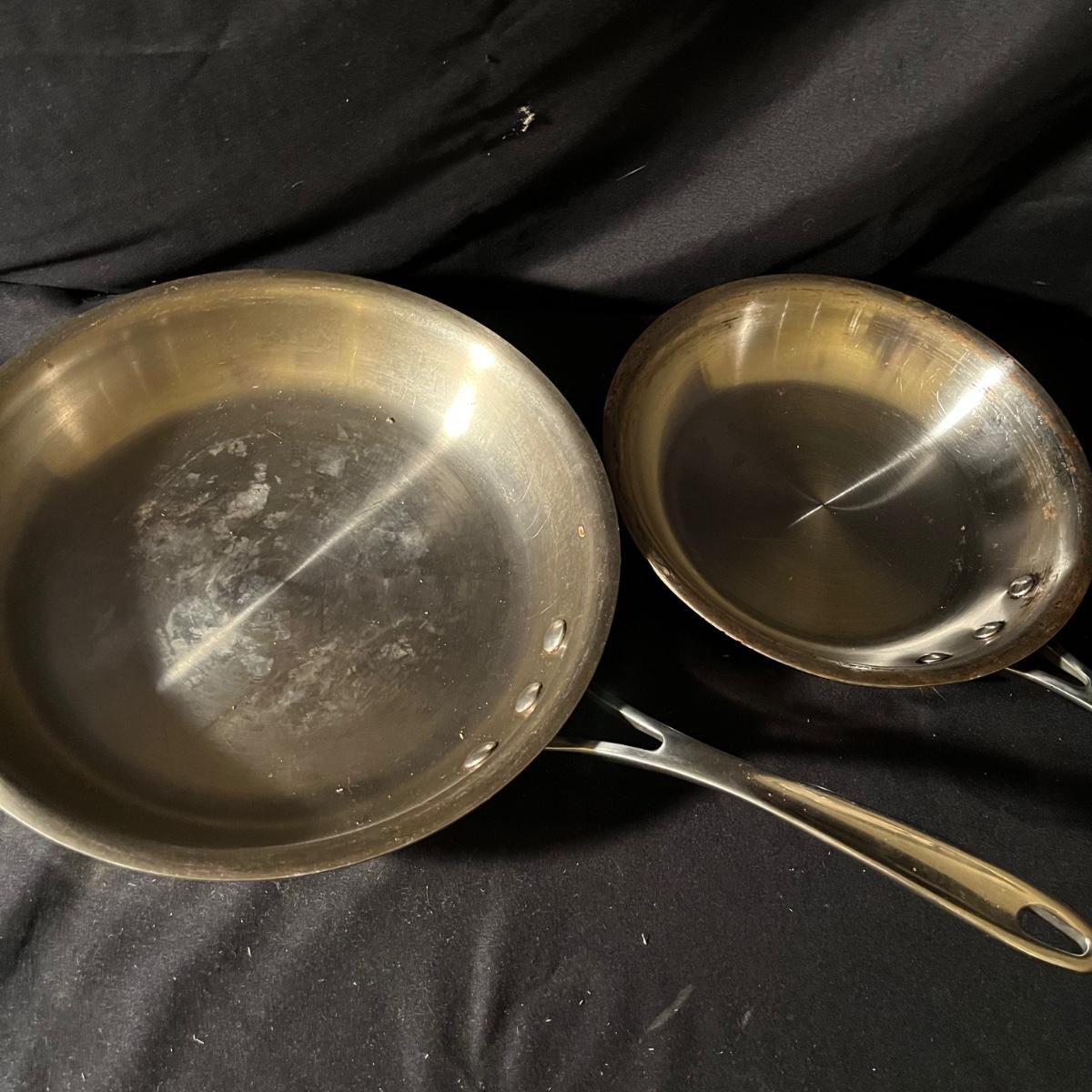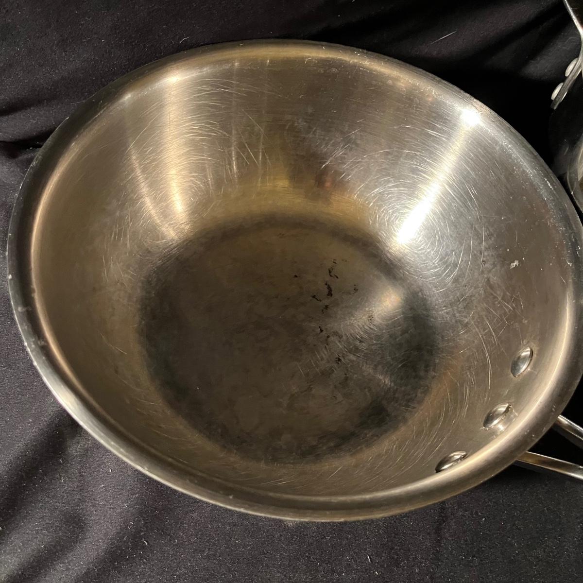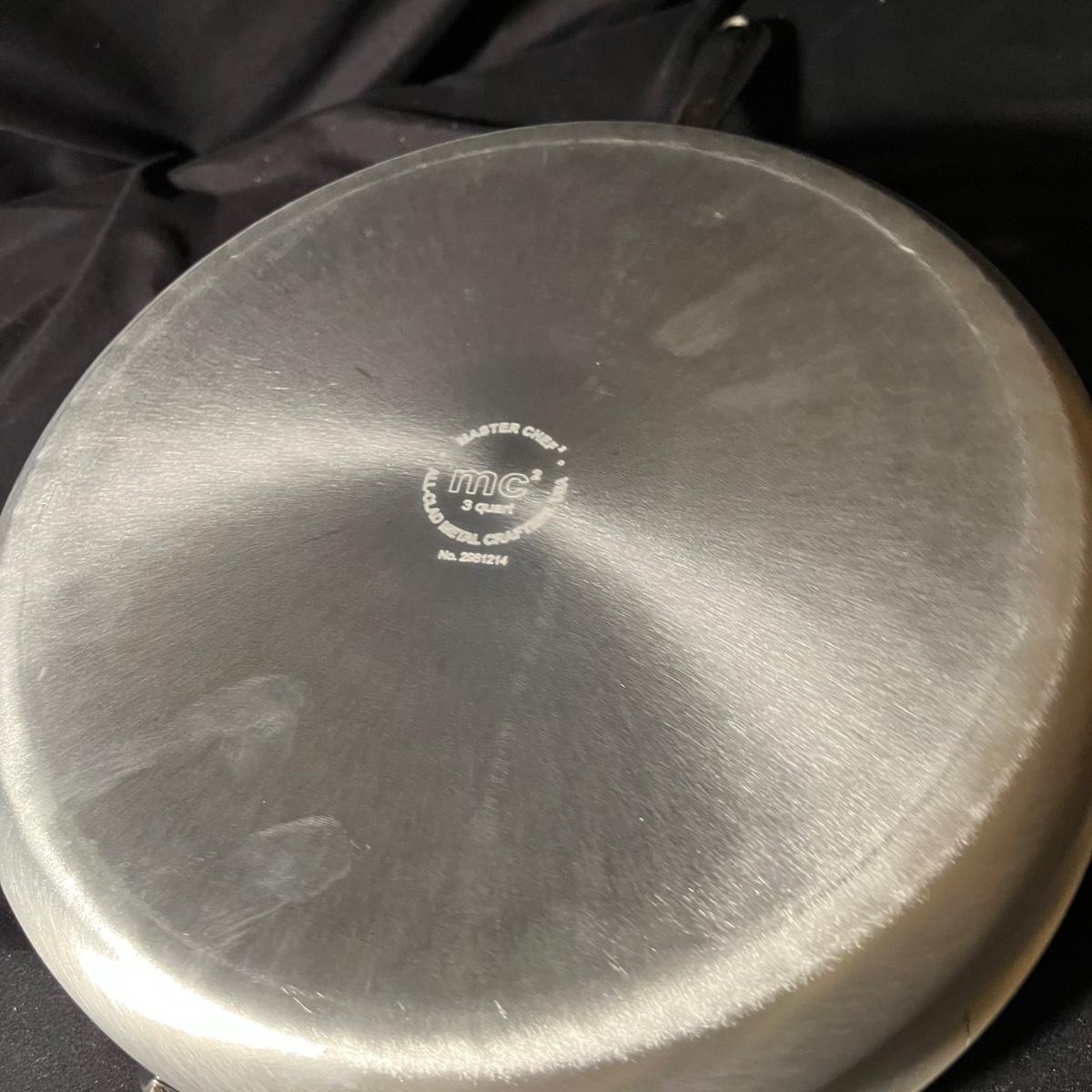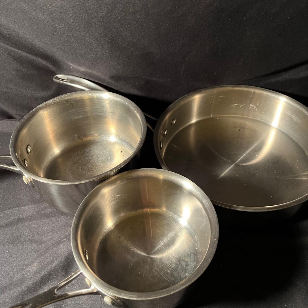 Lot contains a fourteen piece Calphalon stainless steel cookware set. Set includes six lids, four handled pots, two frying pans and two dual handled pots. Pieces are worn from use but have plenty of life left in them.Largest pot measures 10”D x 5.5”D. Also includes a Master Chef pan.
