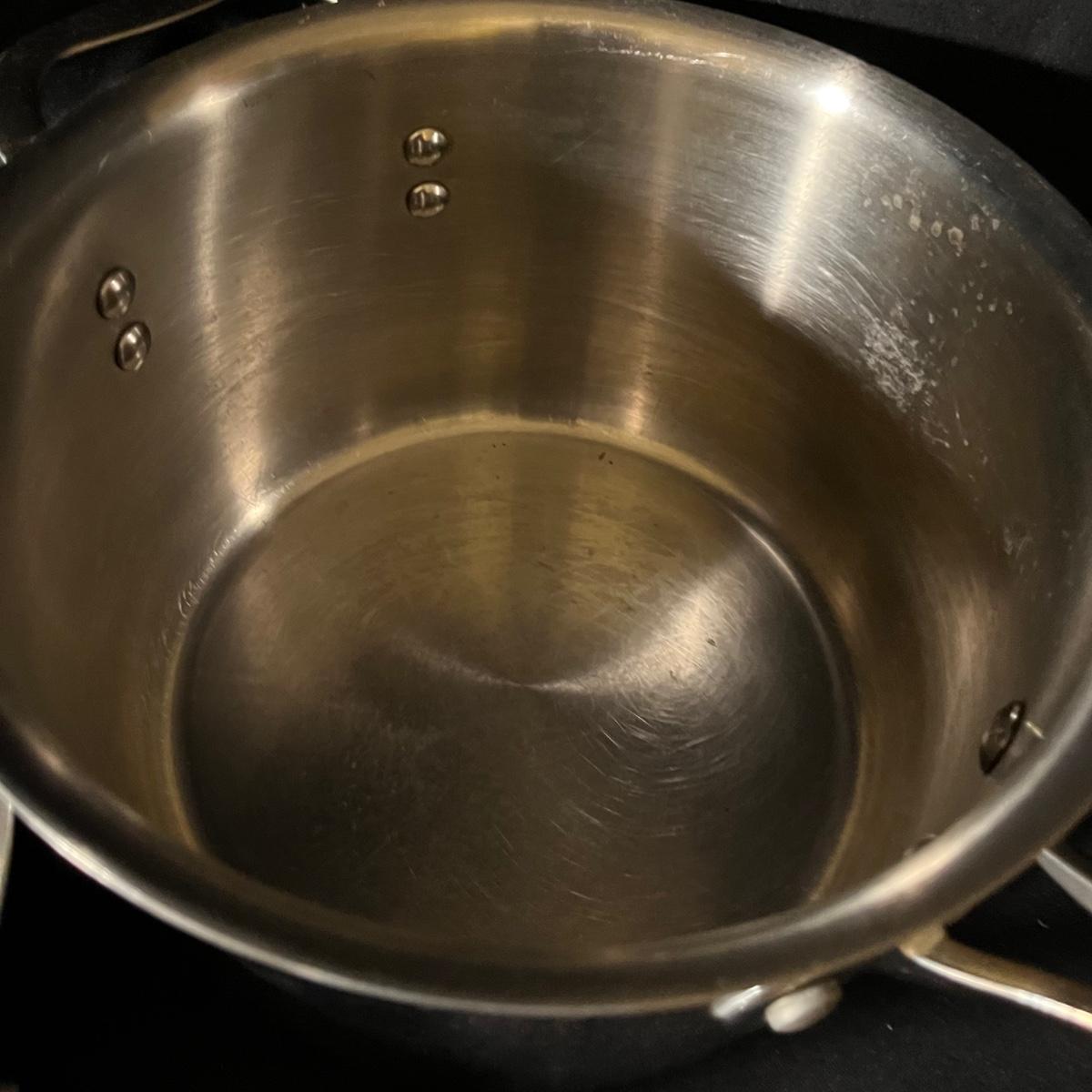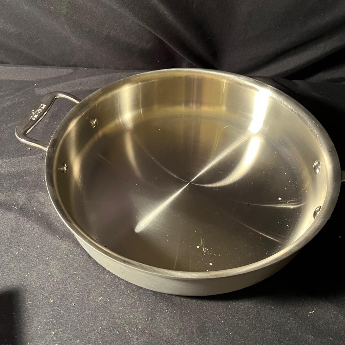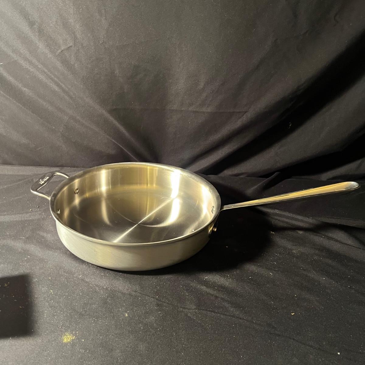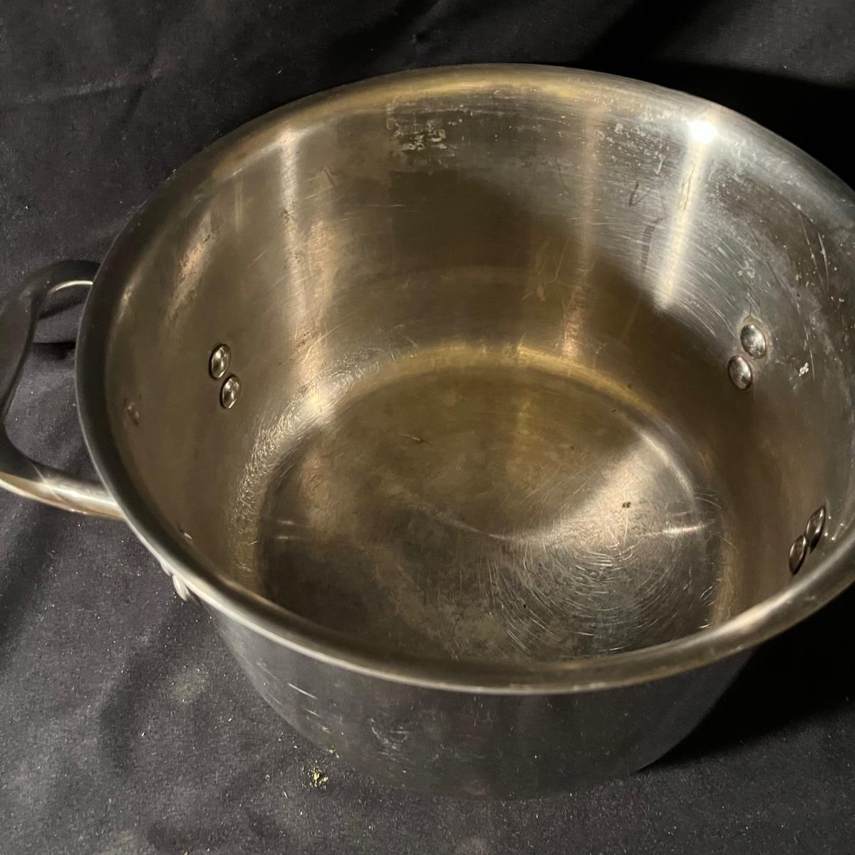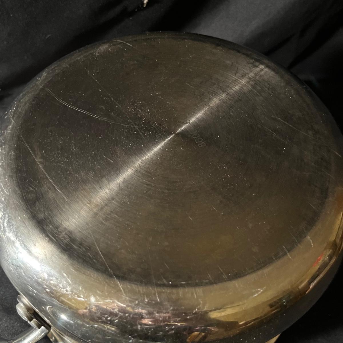 Lot contains a fourteen piece Calphalon stainless steel cookware set. Set includes six lids, four handled pots, two frying pans and two dual handled pots. Pieces are worn from use but have plenty of life left in them.Largest pot measures 10”D x 5.5”D. Also includes a Master Chef pan.