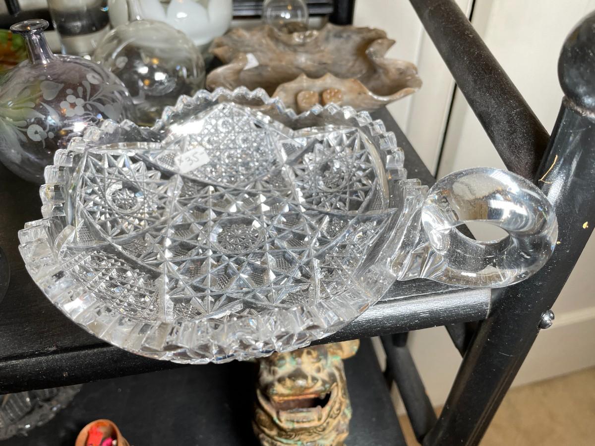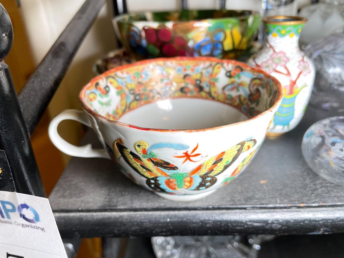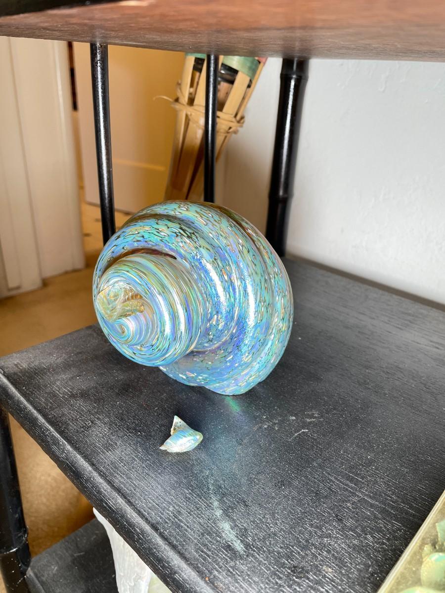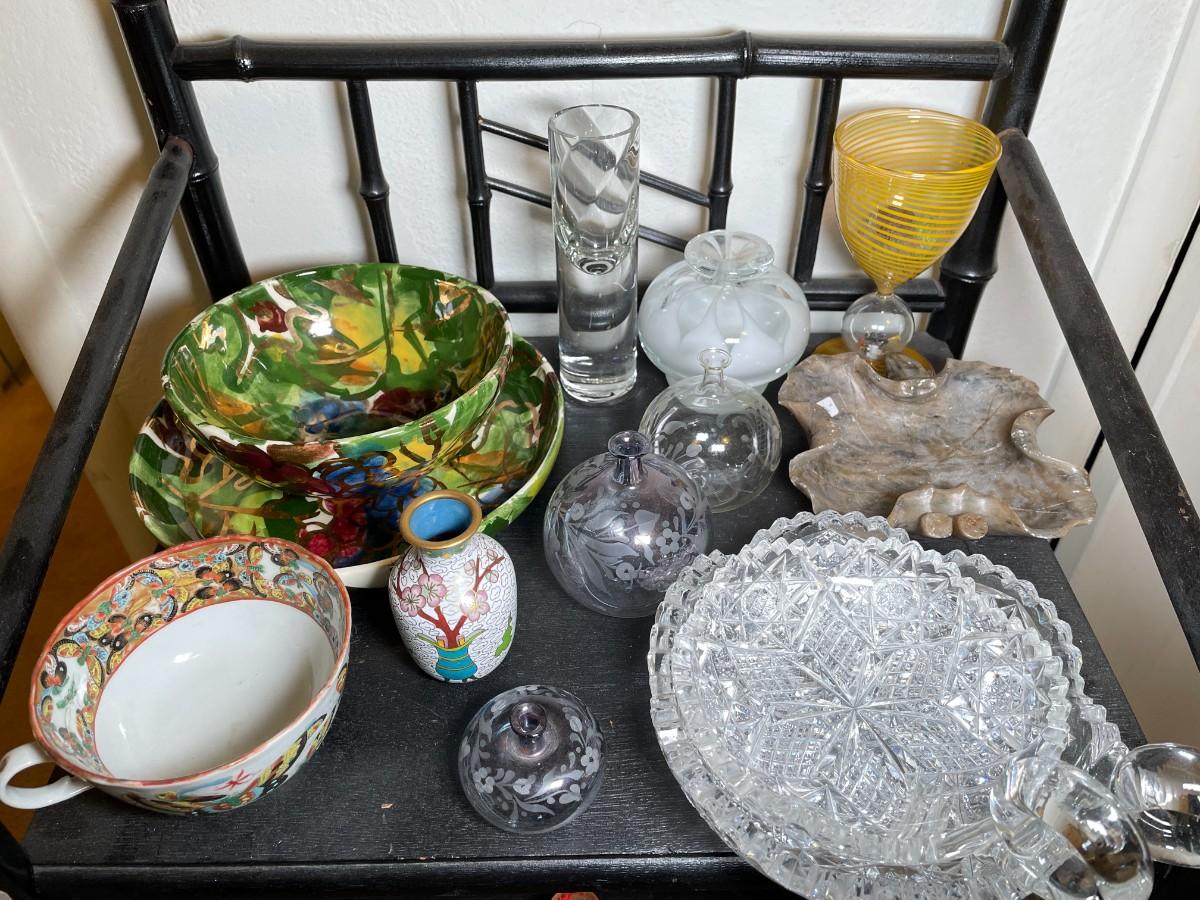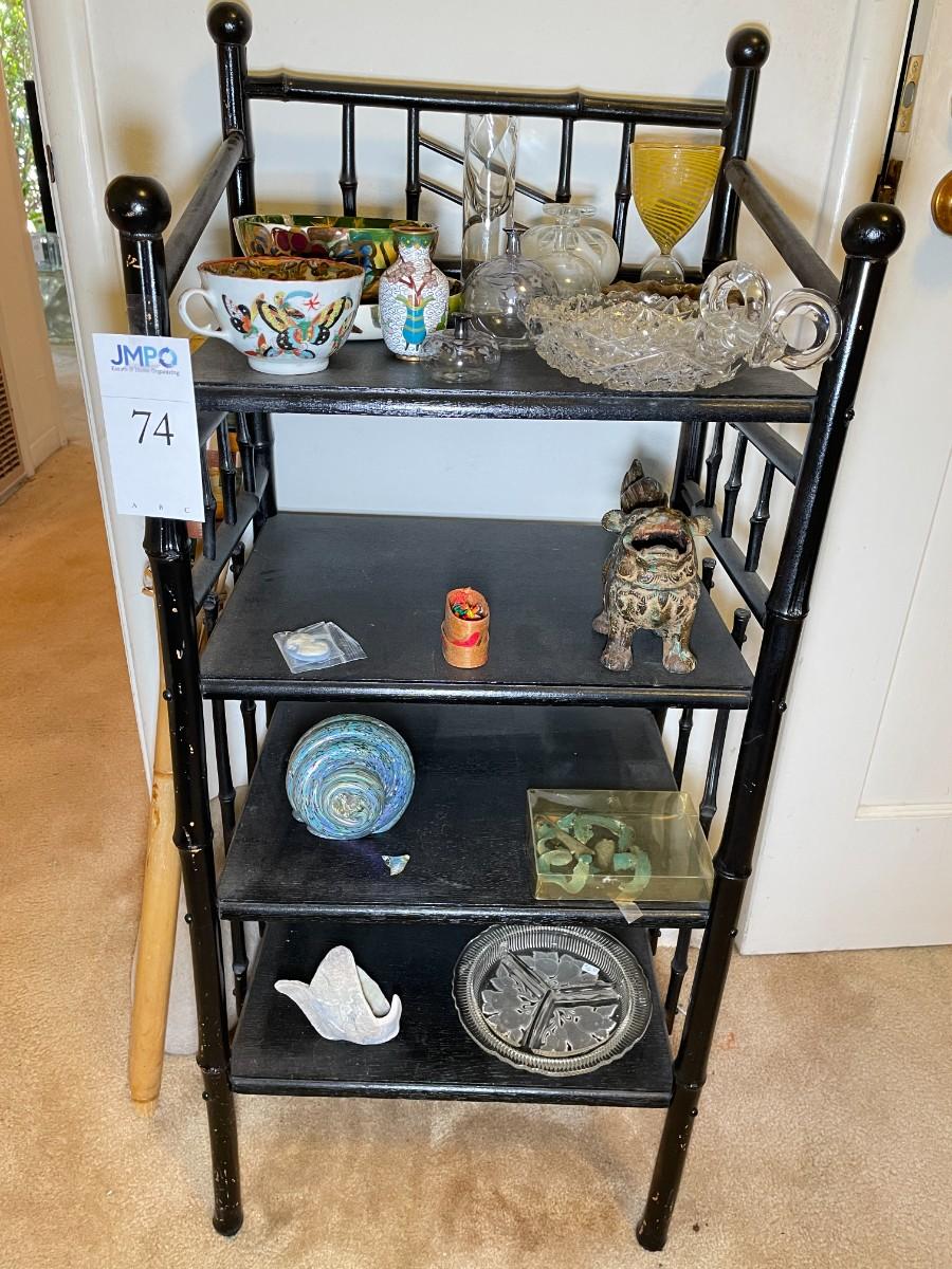 Bamboo style shelf unit is 17x14x40". Includes blown glass and cut glass decorative pieces, cloisonne 3" vase, handpainted pair of Calpotter small bowls. Spiral glass art snail is signed, has broken tip, shown.
