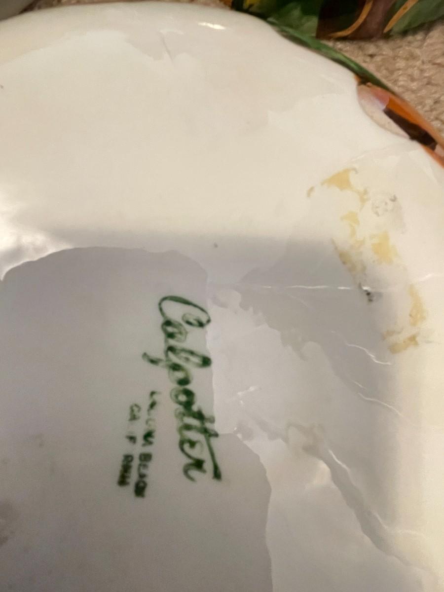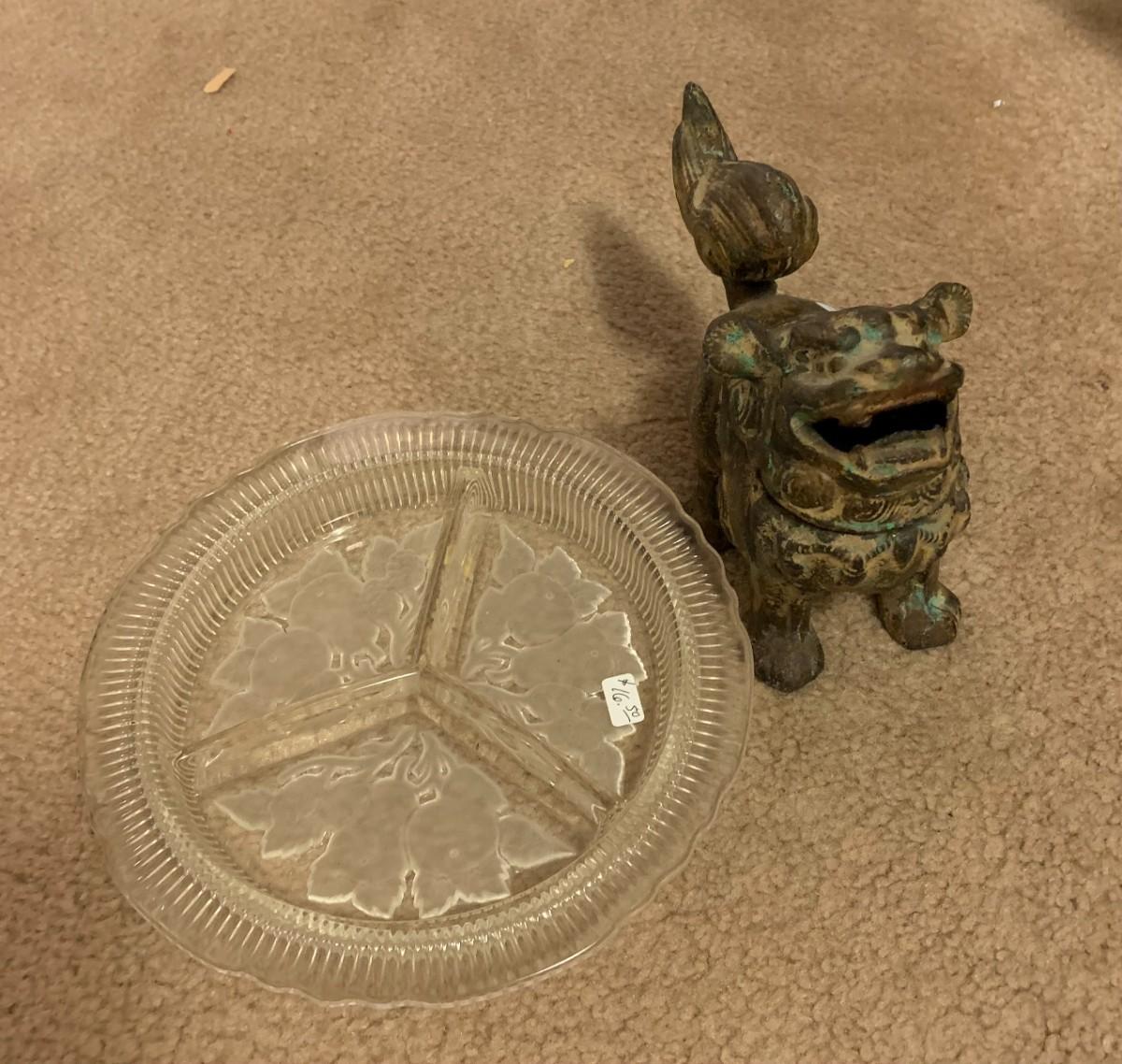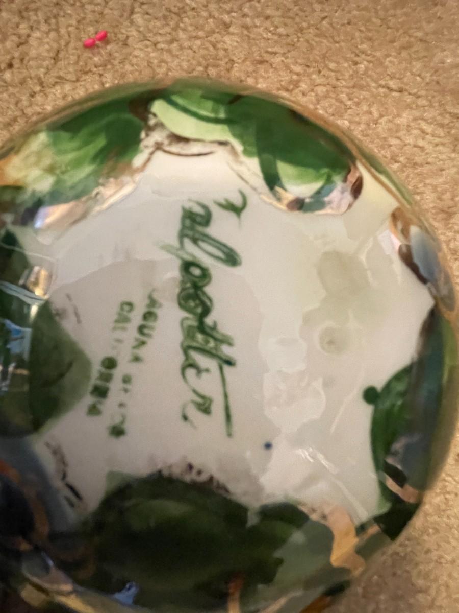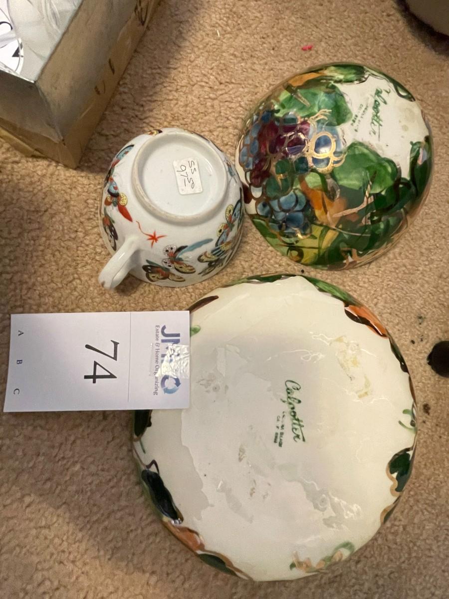 Bamboo style shelf unit is 17x14x40". Includes blown glass and cut glass decorative pieces, cloisonne 3" vase, handpainted pair of Calpotter small bowls. Spiral glass art snail is signed, has broken tip, shown.