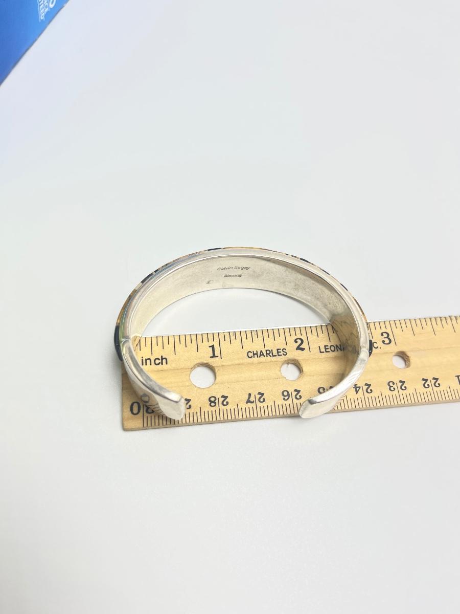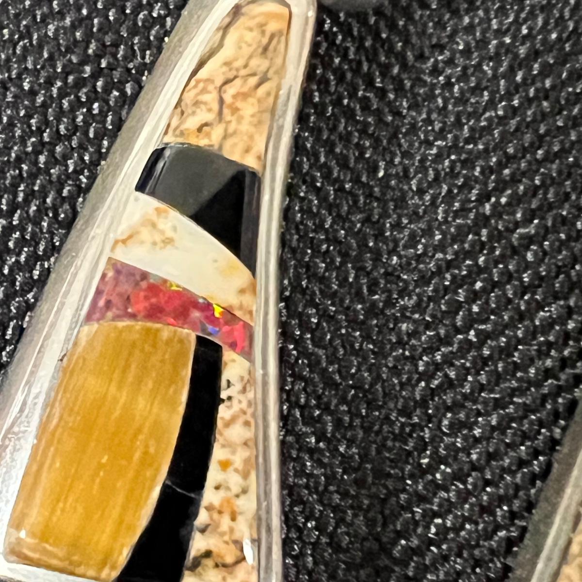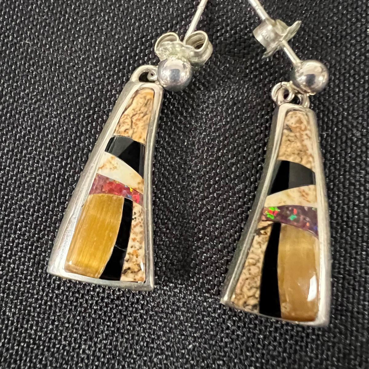 Lot includes a set of Calvin Begay and inlaid stone cuff bracelet and earrings, all marked Sterling. All sales are final. No returns or refunds. Please bid accordingly.