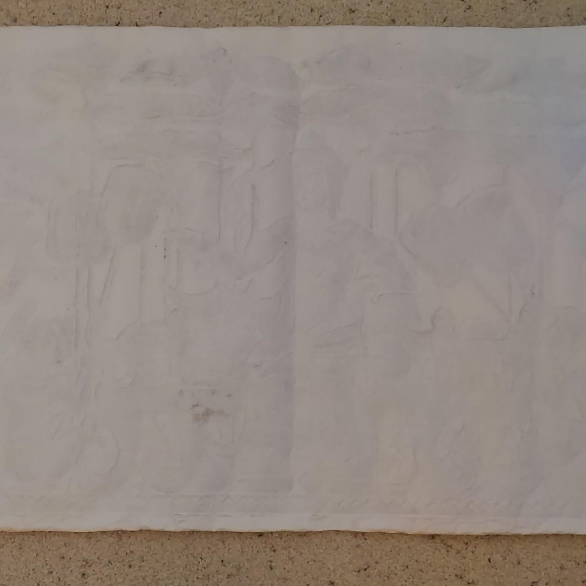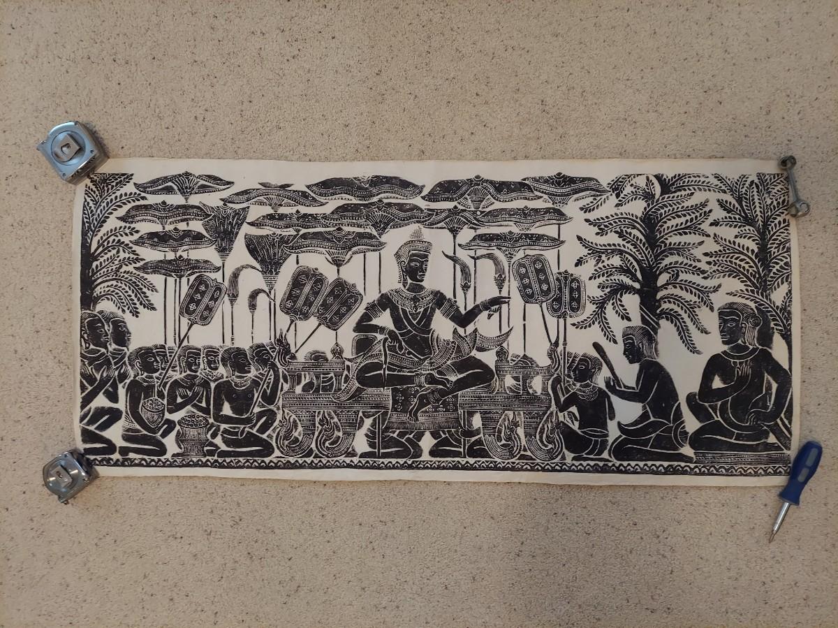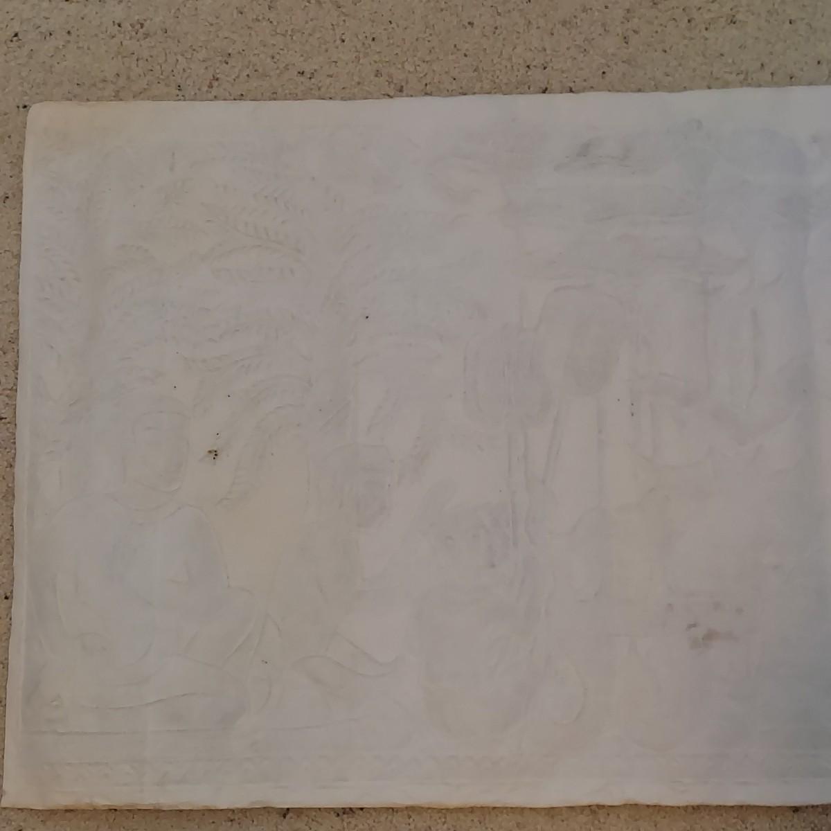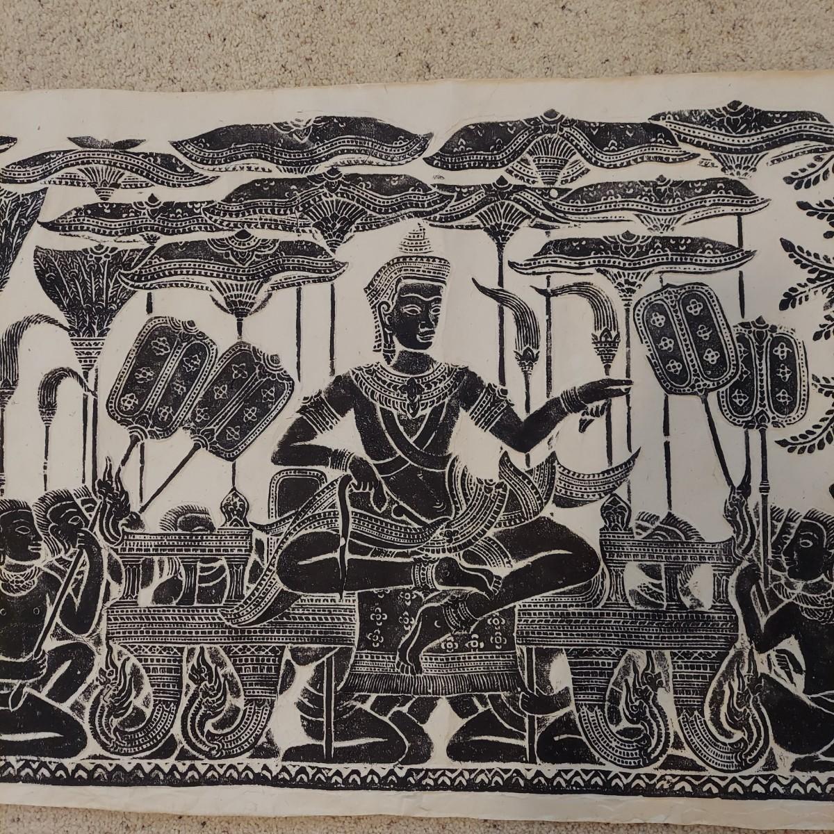 Large paper art piece that appears to be a Cambodian Temple Rubbing. It measures 47” x 21"H. Please see photos for details. Shipping available