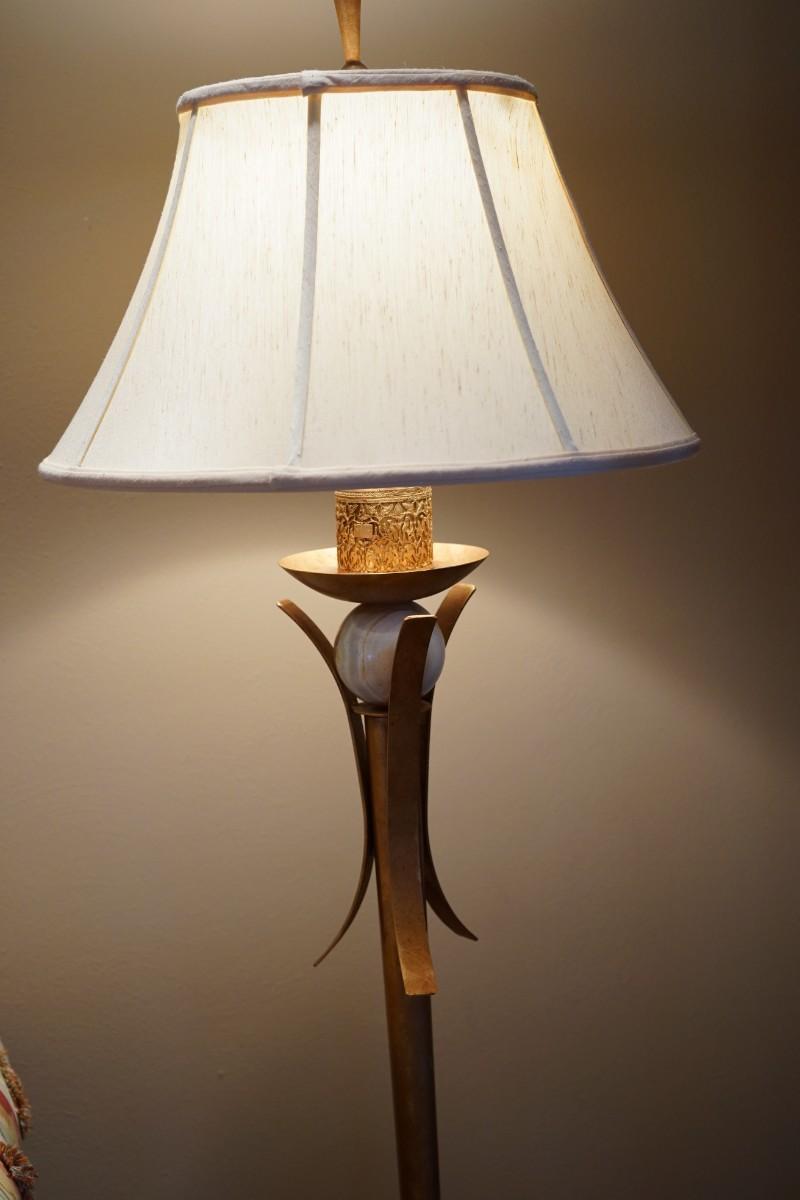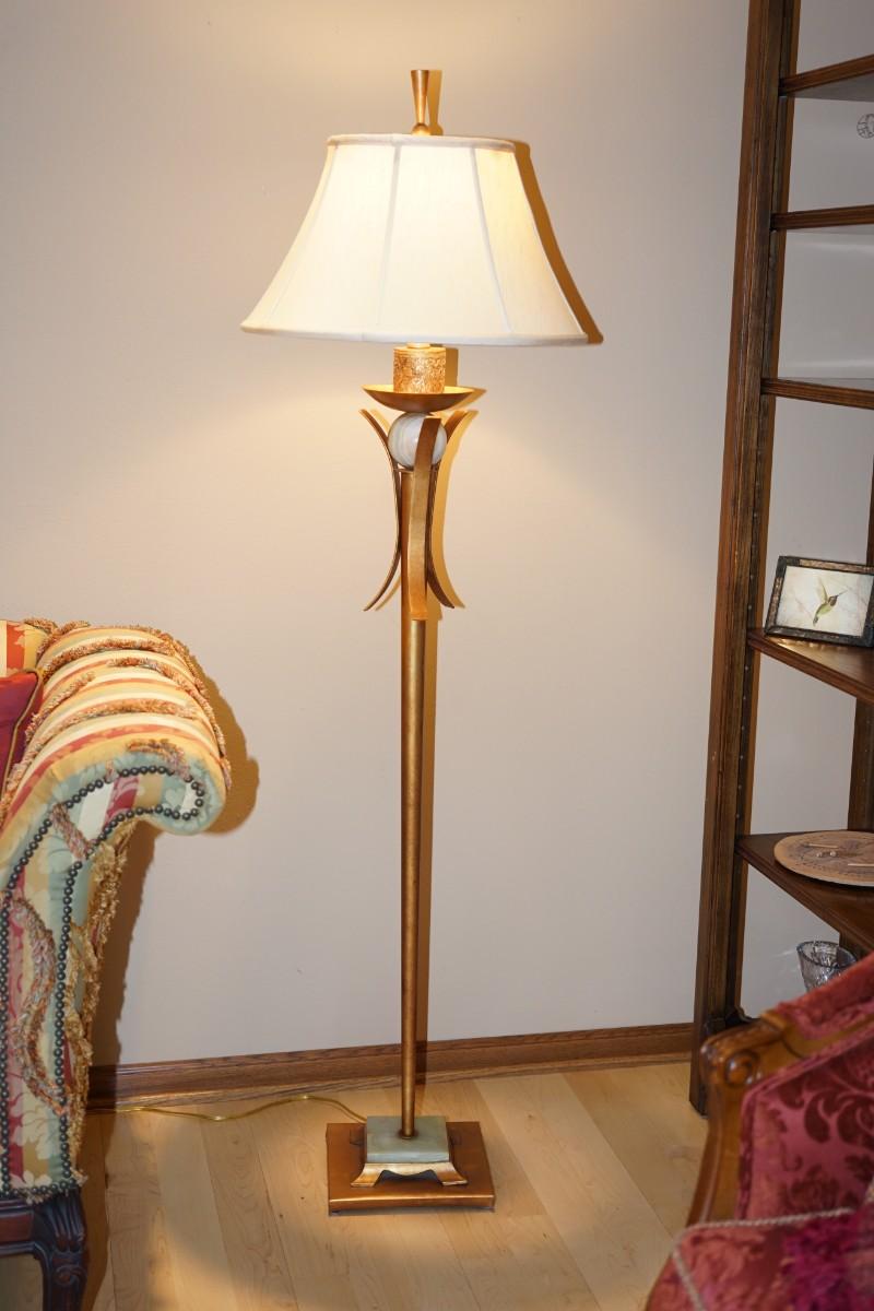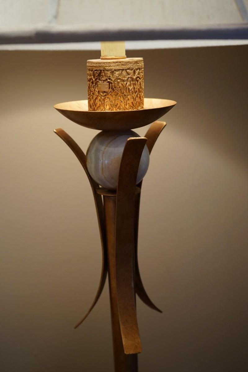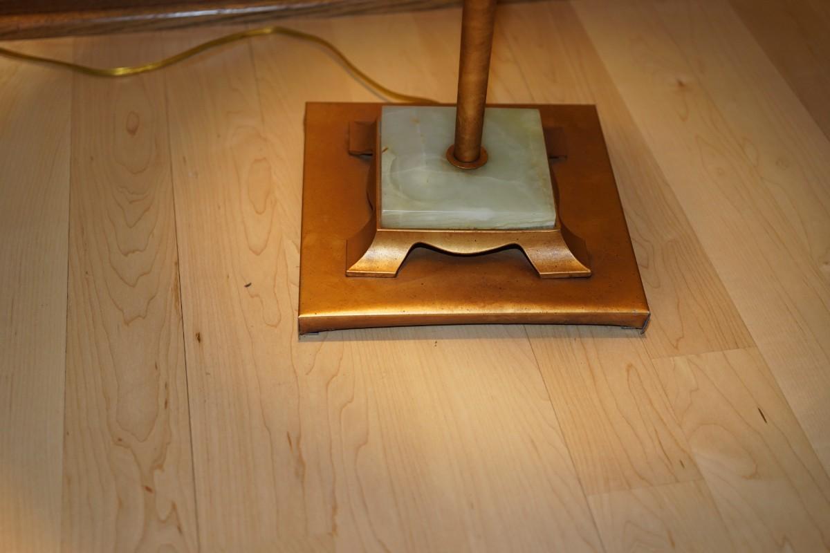 floor lamp heavy strength metal with gold textured paint. The top has a design that holds a ball of onyx, The base has a square of onyx set on a square of the gold tone.