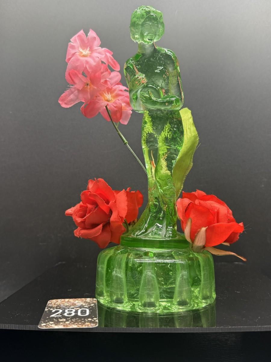 Has 10 holes for flowers ,depicts nude figure holding a flask