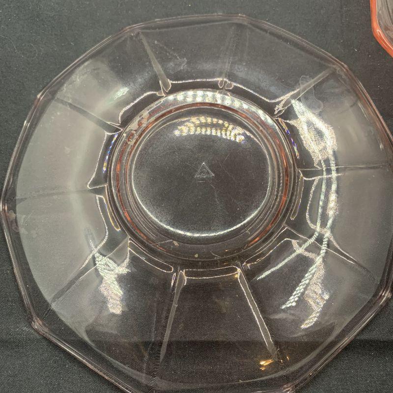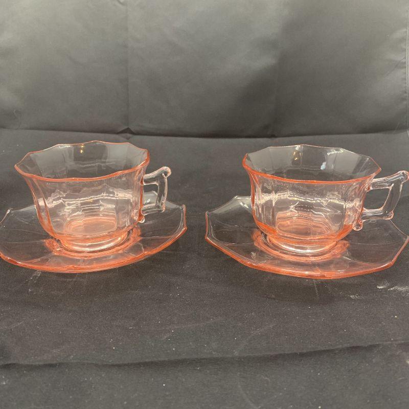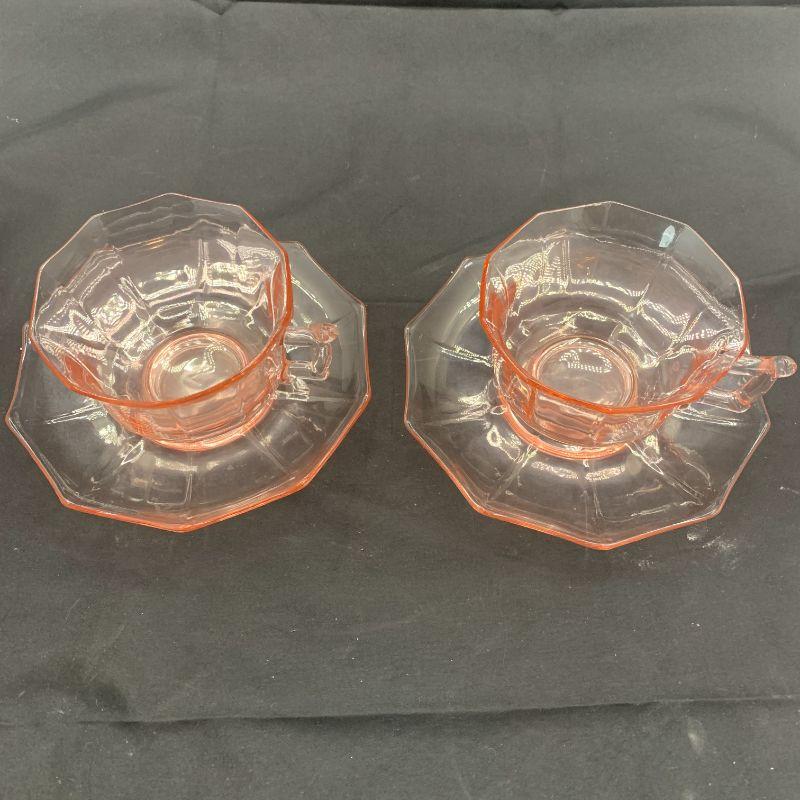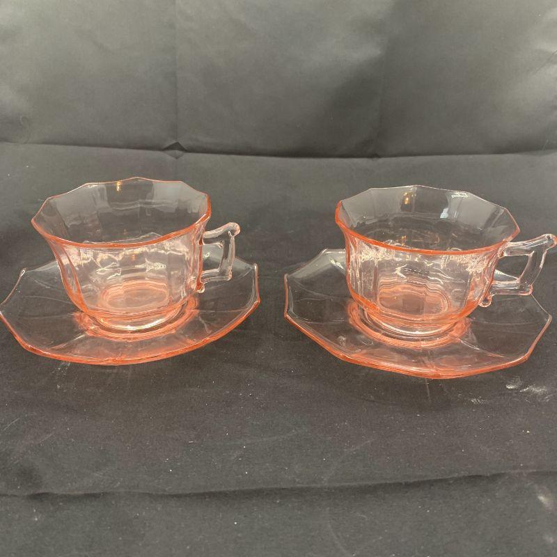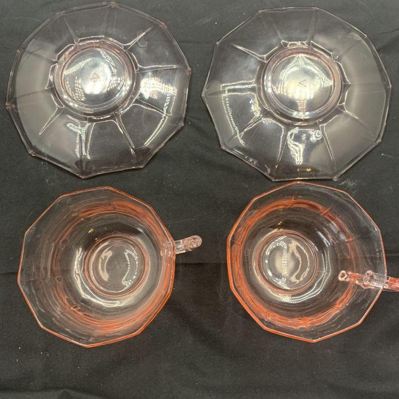 Pink depression glass cups and saucers in the Decagon pattern