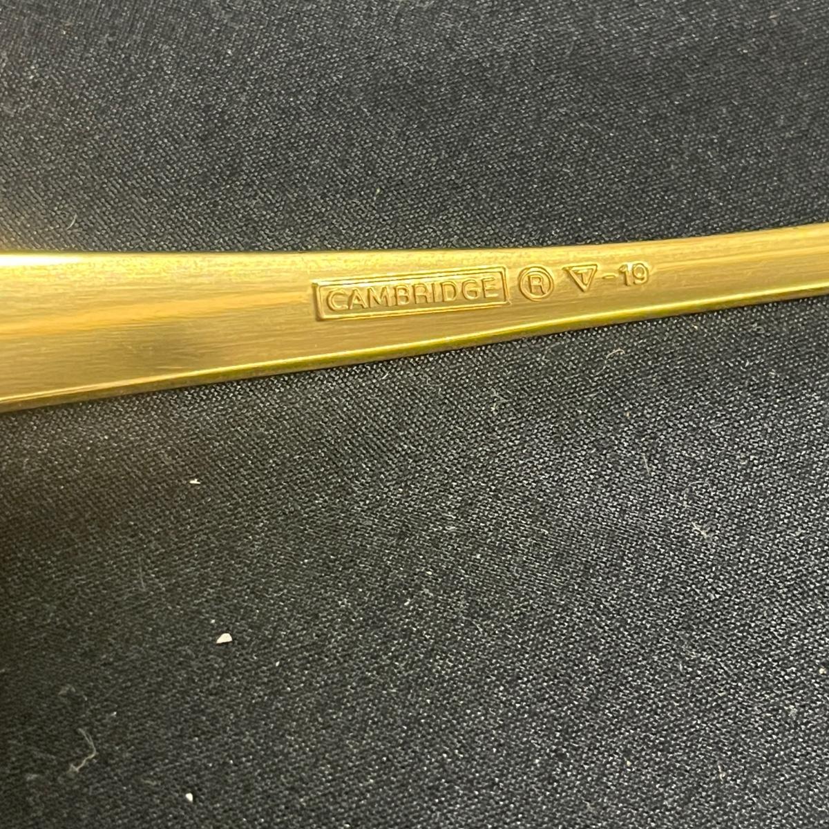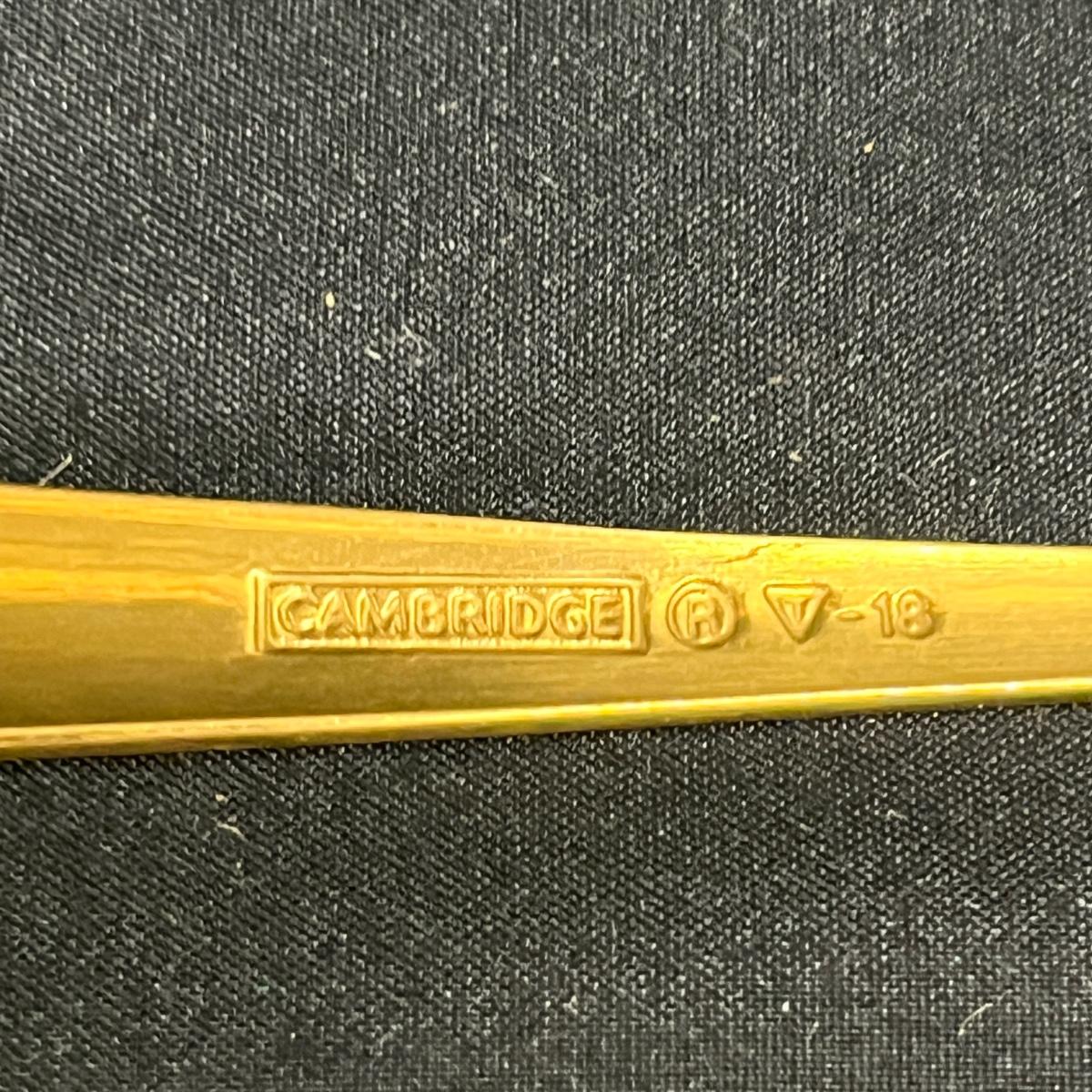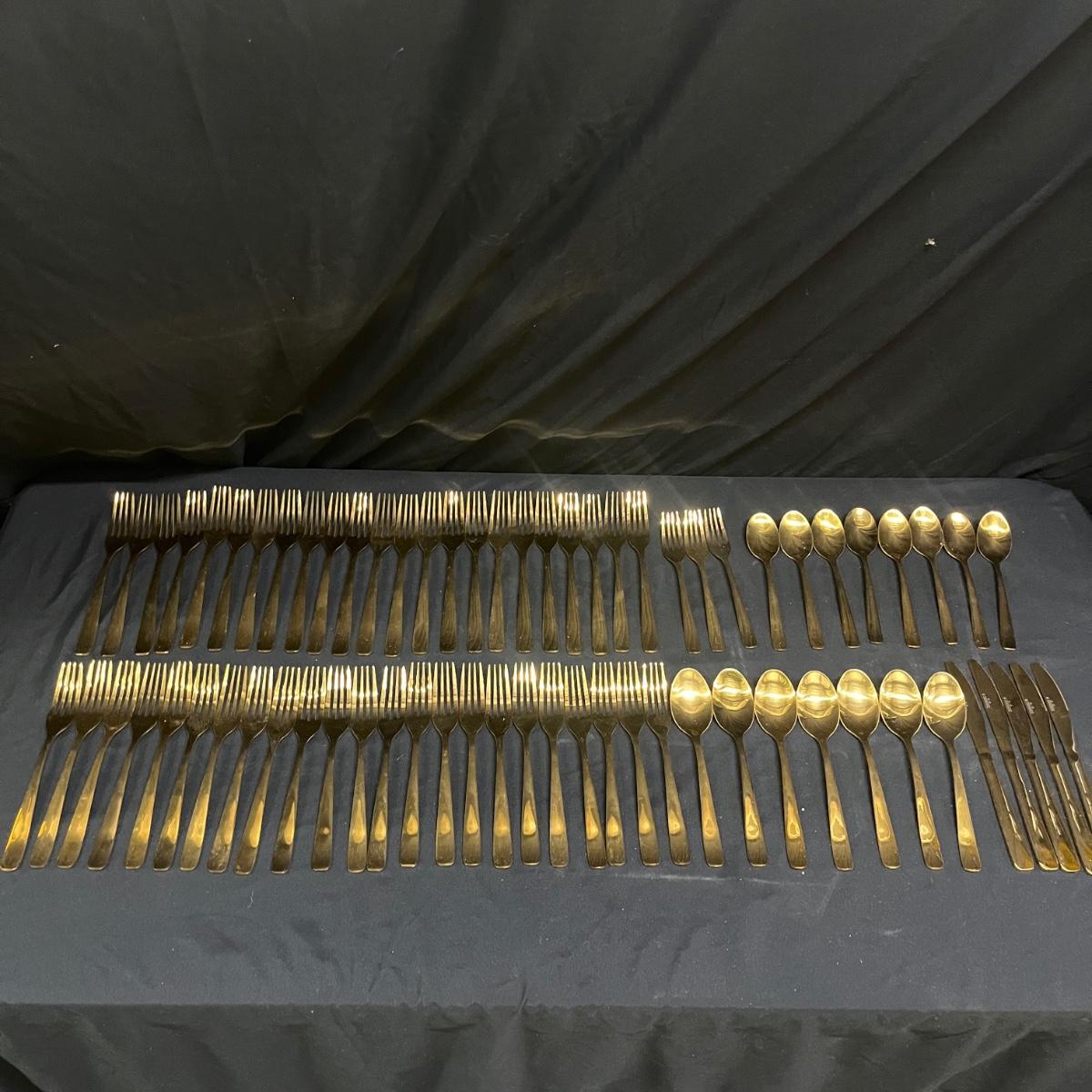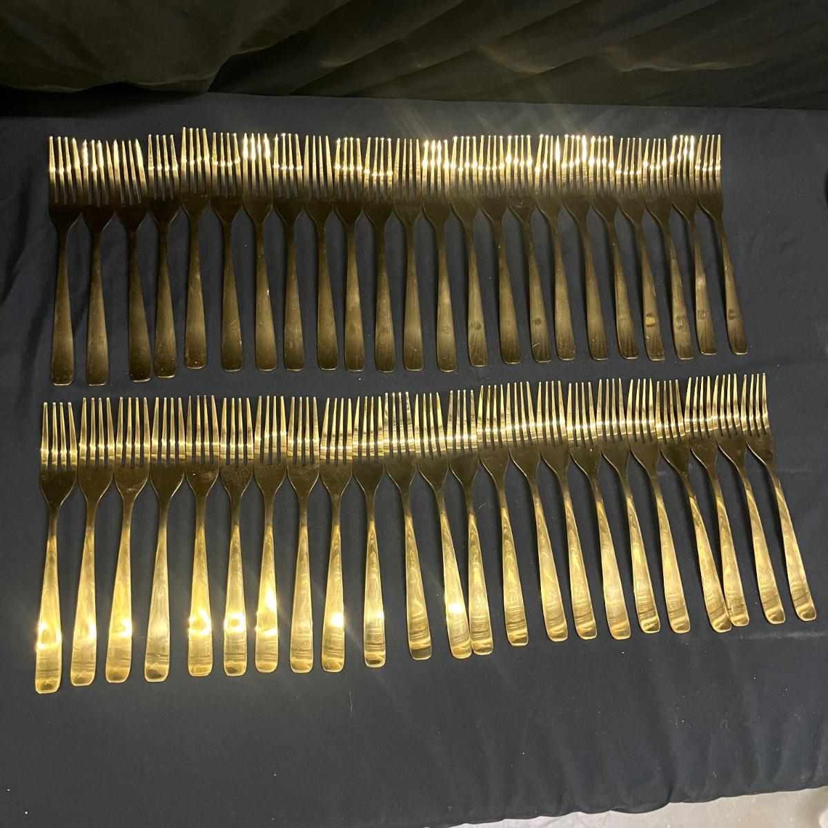 This collection of Cambridge gold colored flatware includes 46 large forks, three small forks, seven big spoons, eight small spoons and five knives. Also includes one Fortessa spoon.