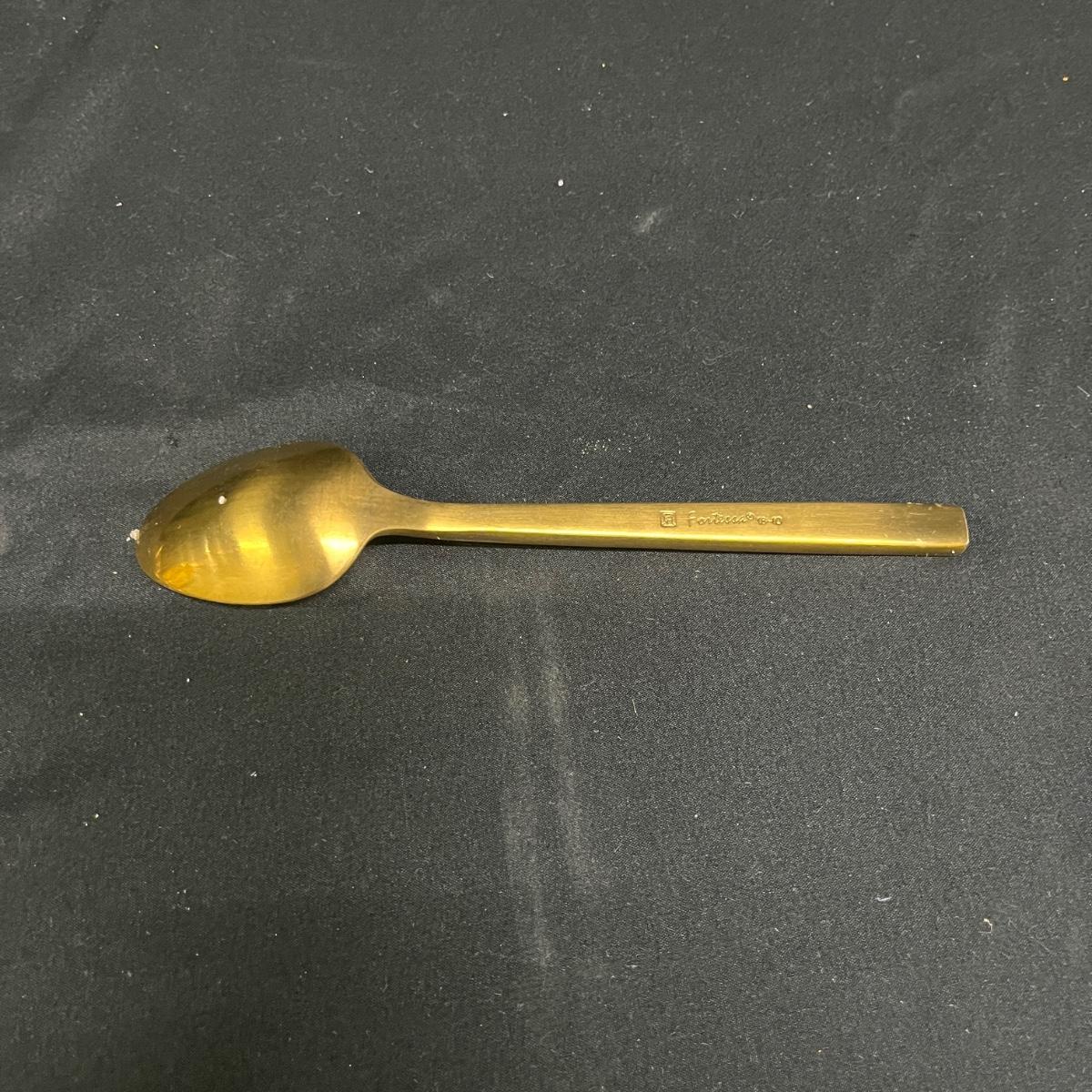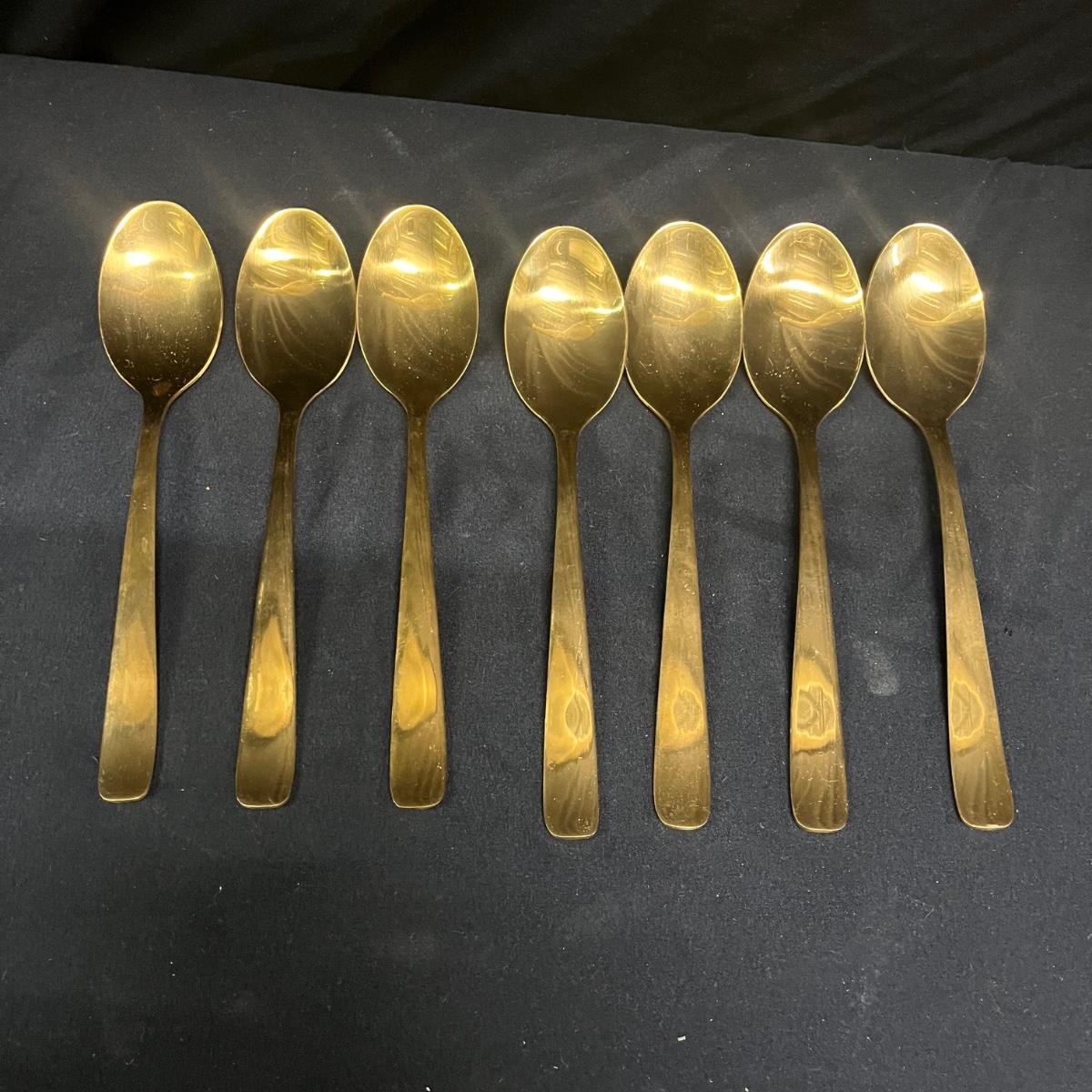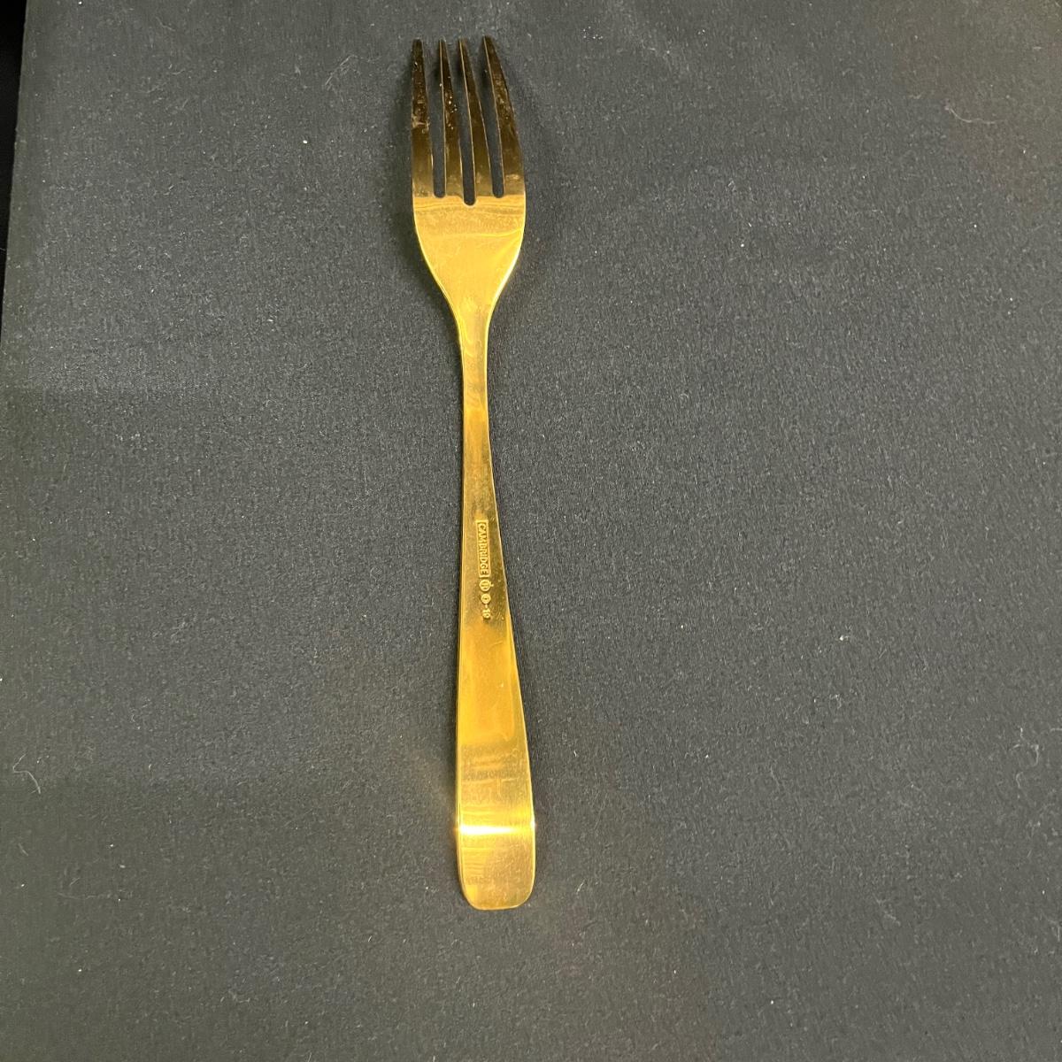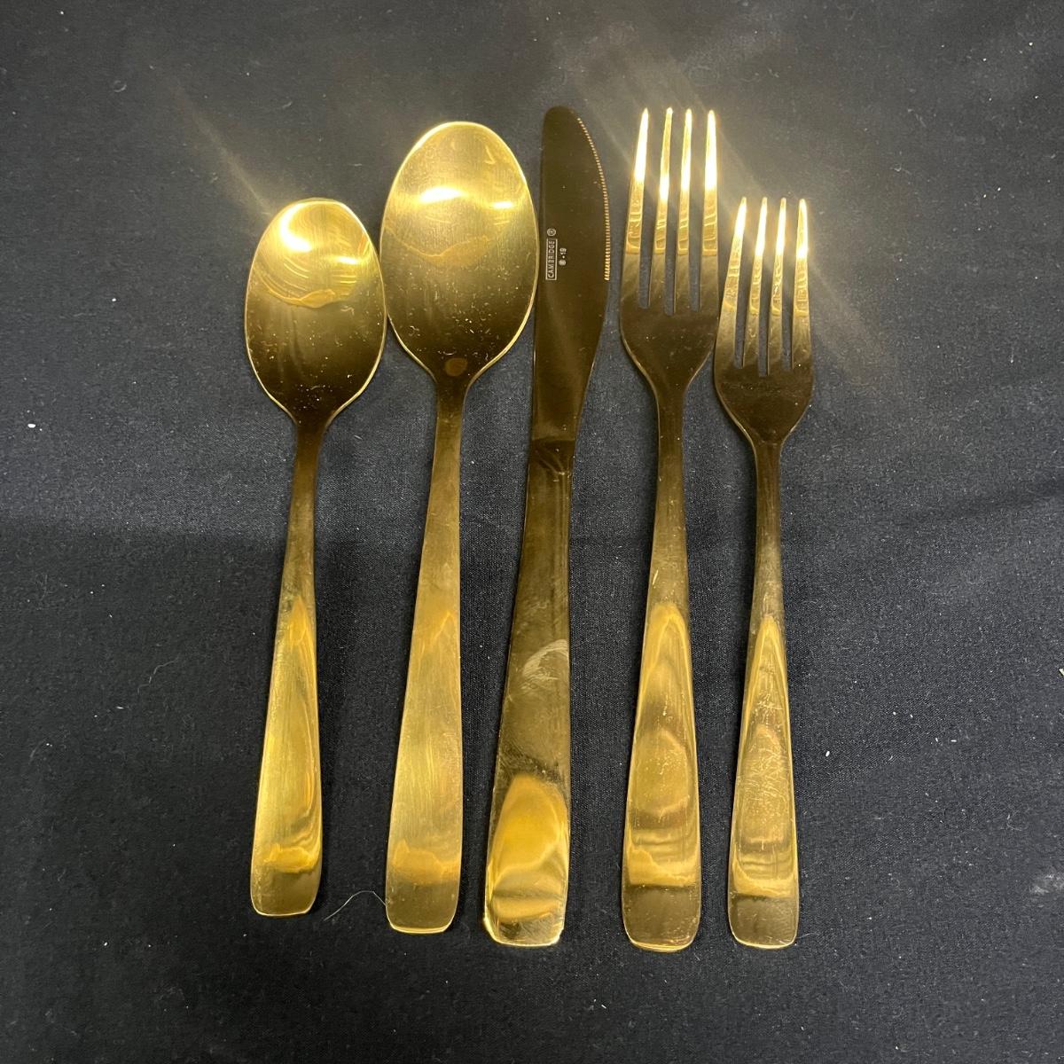 This collection of Cambridge gold colored flatware includes 46 large forks, three small forks, seven big spoons, eight small spoons and five knives. Also includes one Fortessa spoon.