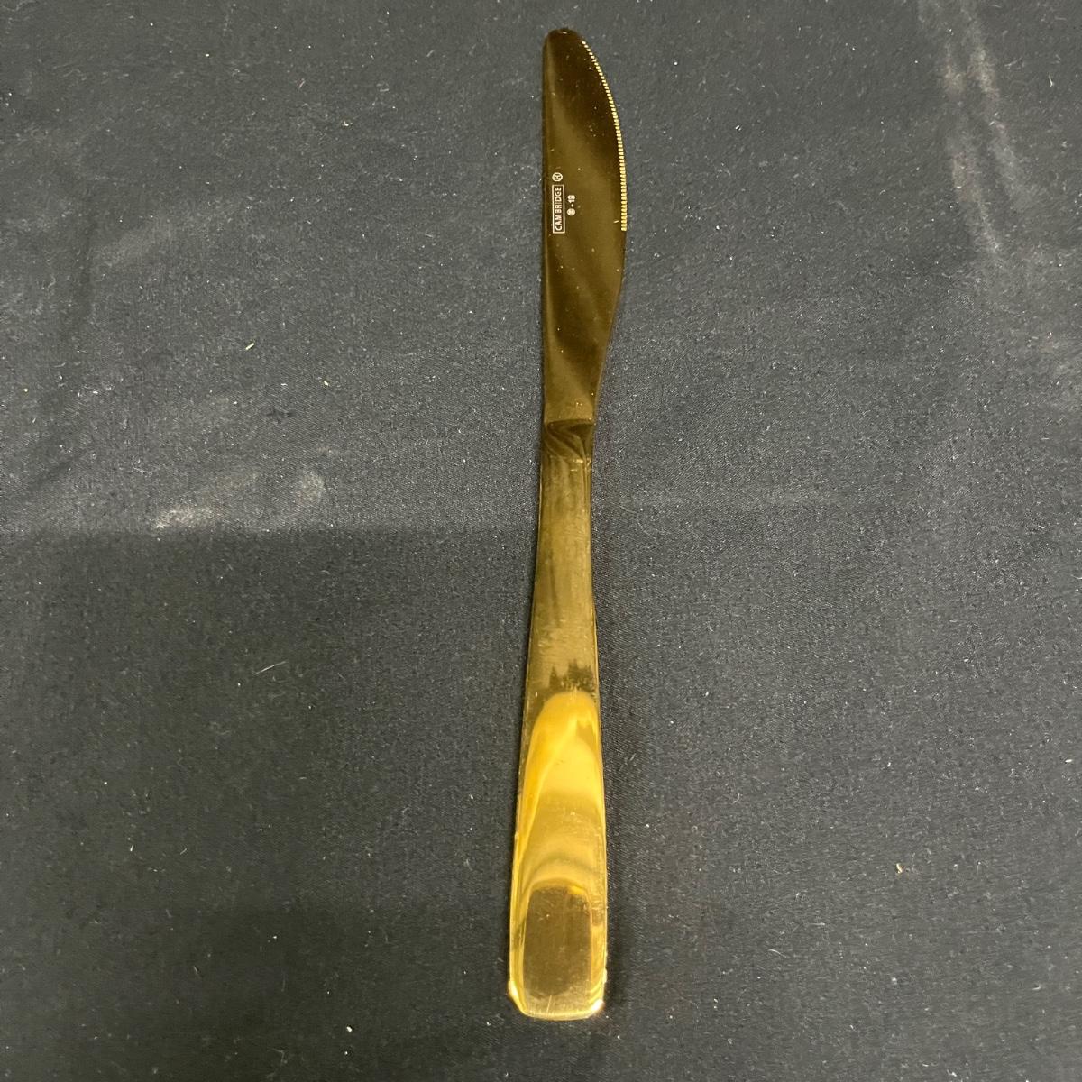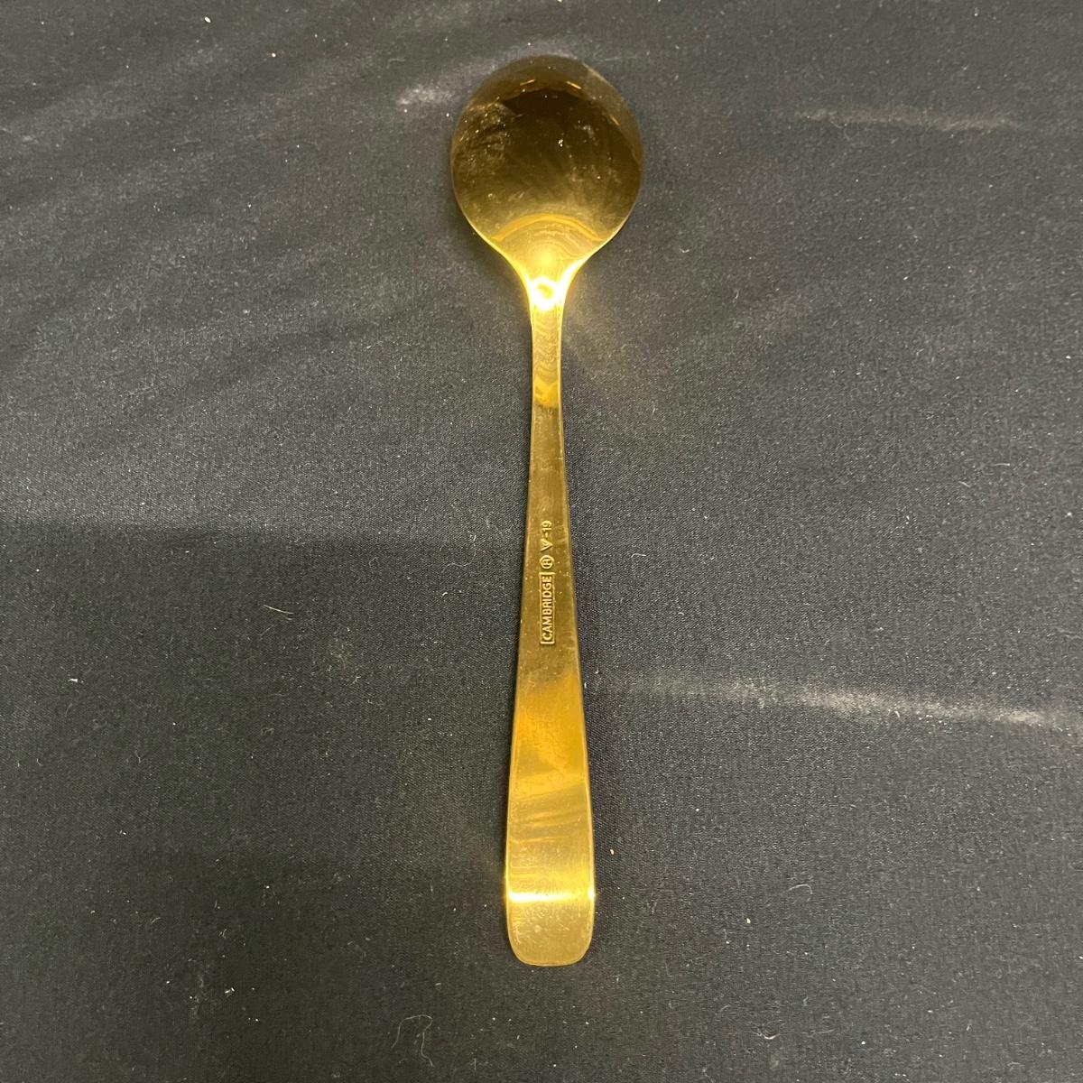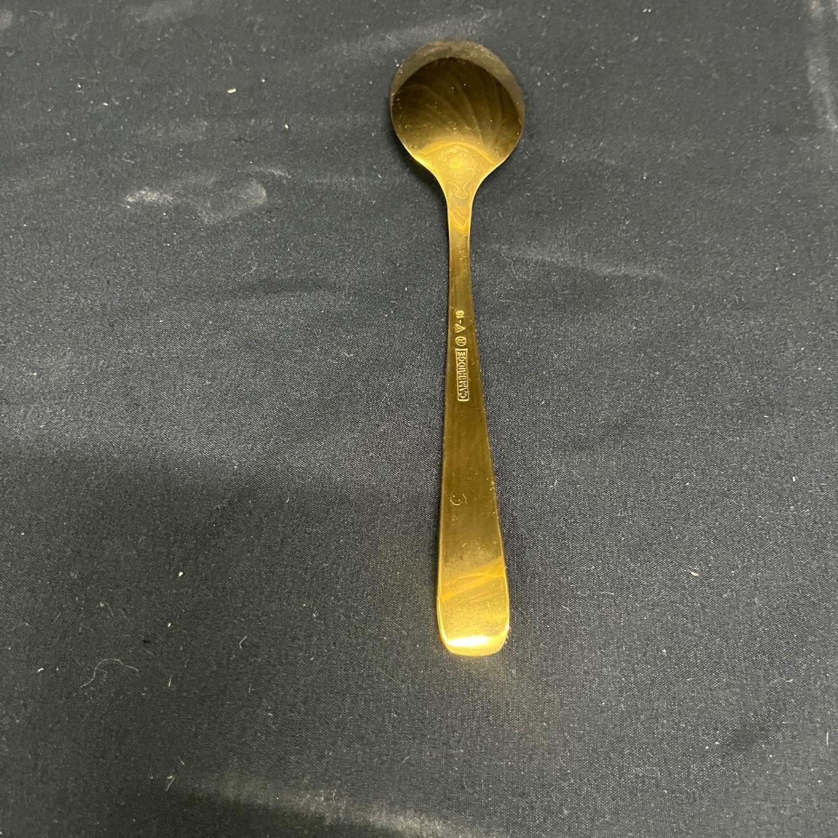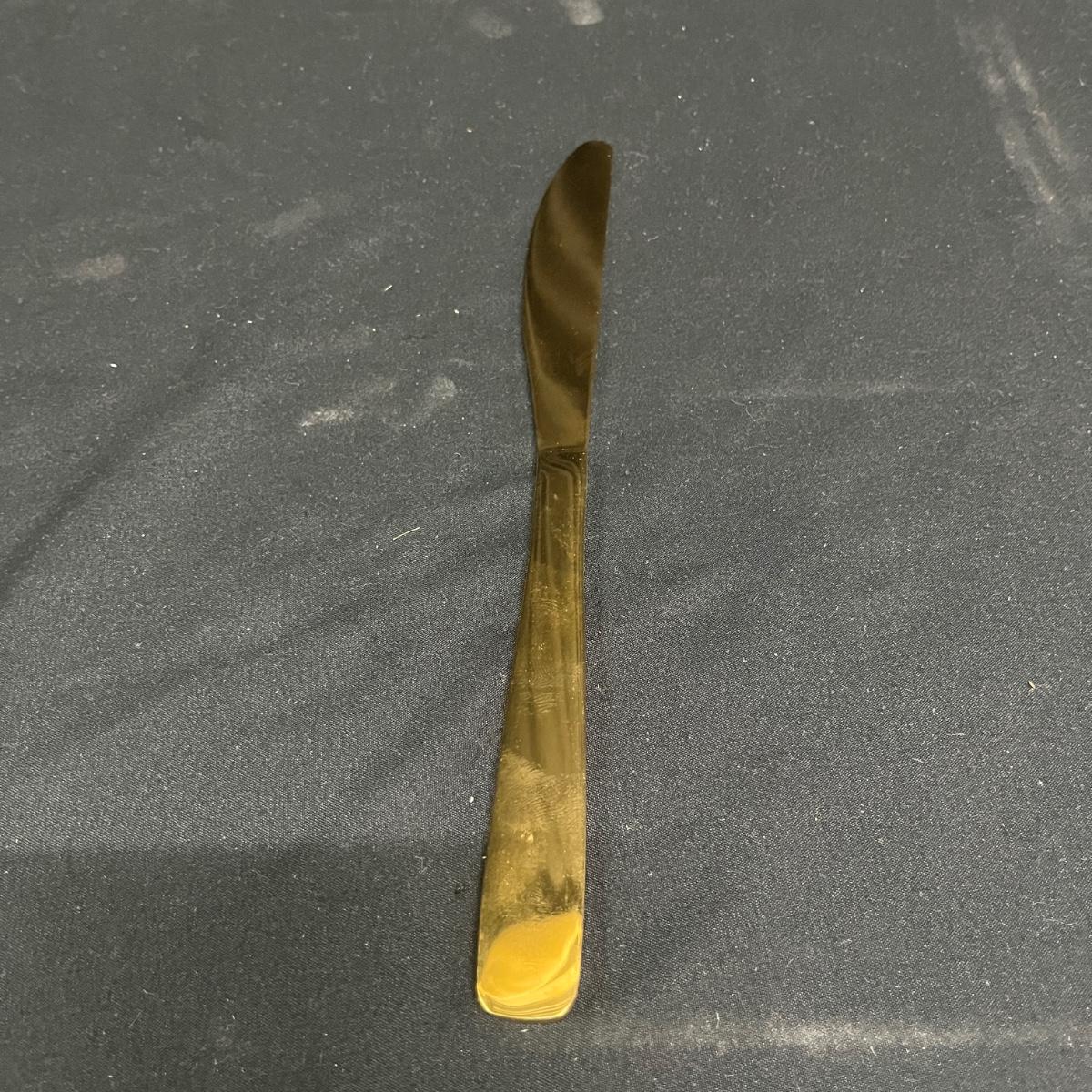 This collection of Cambridge gold colored flatware includes 46 large forks, three small forks, seven big spoons, eight small spoons and five knives. Also includes one Fortessa spoon.