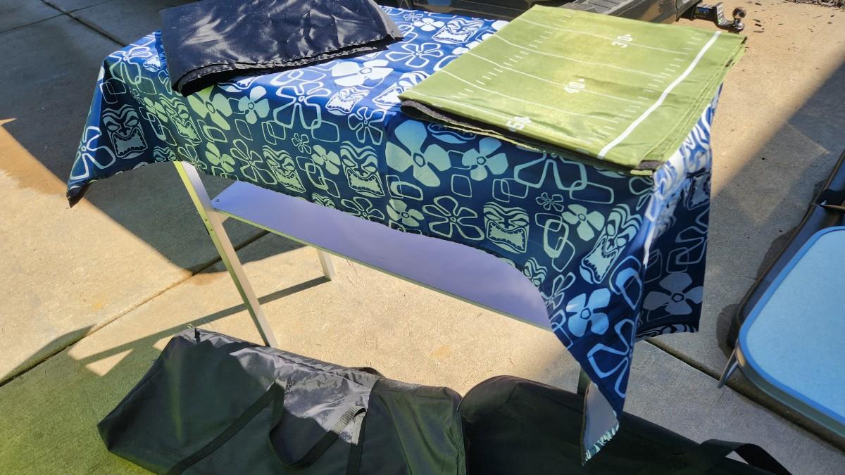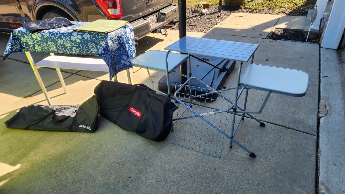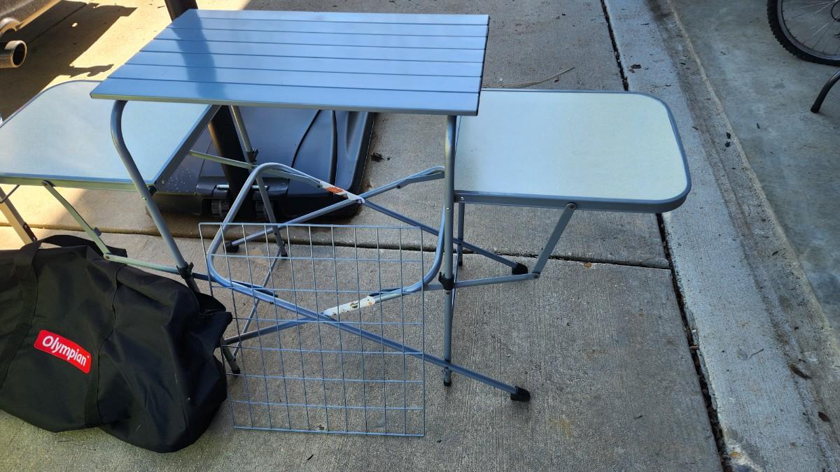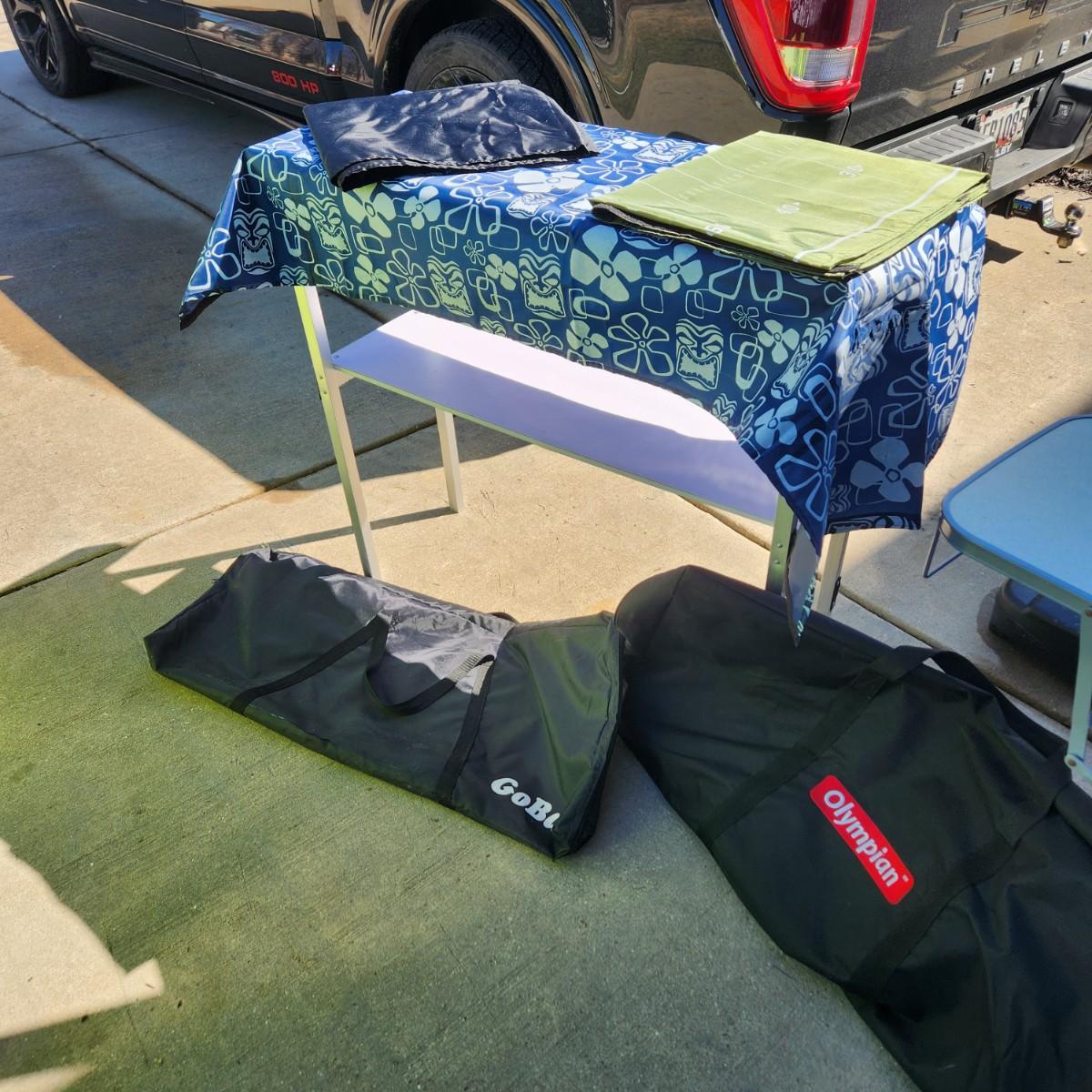 Camco Olympian Folding Grill Table and Folding GoBar Table w Several Skirts