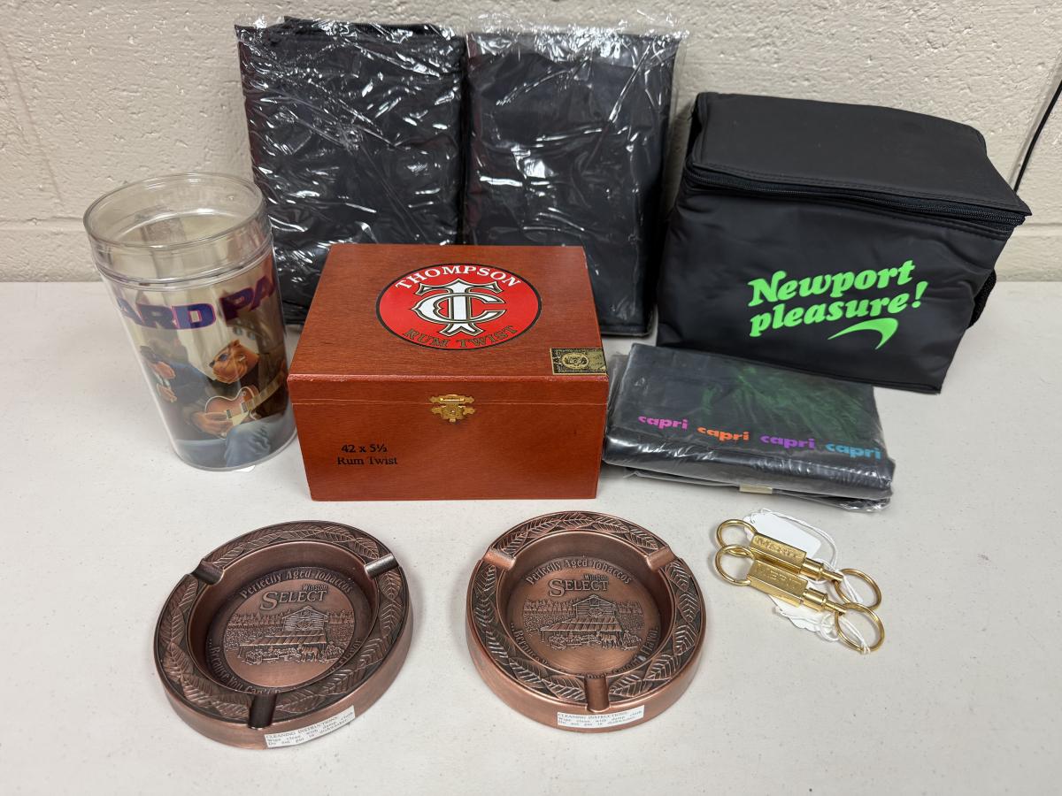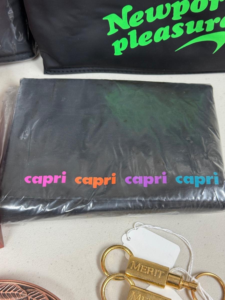Newport & Capri lunch bags, Winston ashtrays, Merit keychains, Camel cup