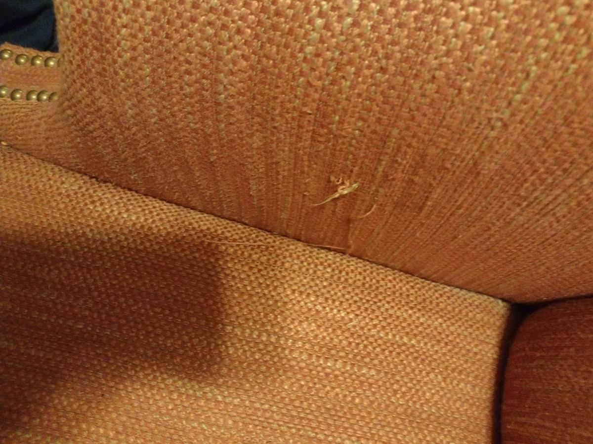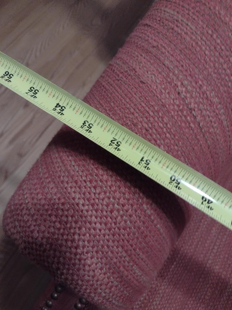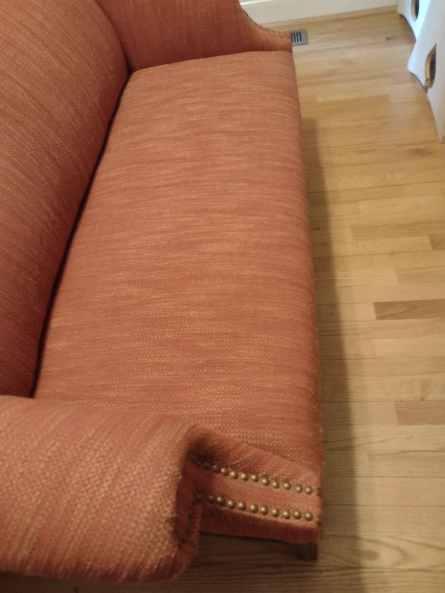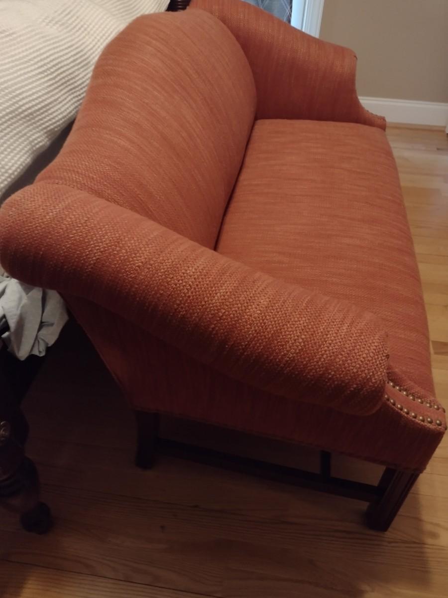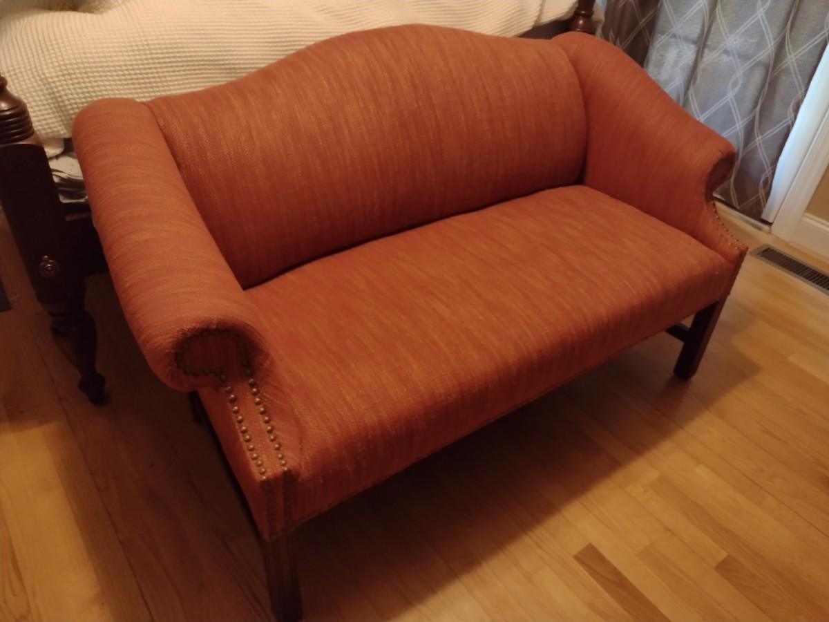 Camel Back Upholstered Loveseat with Brass Tack Accents