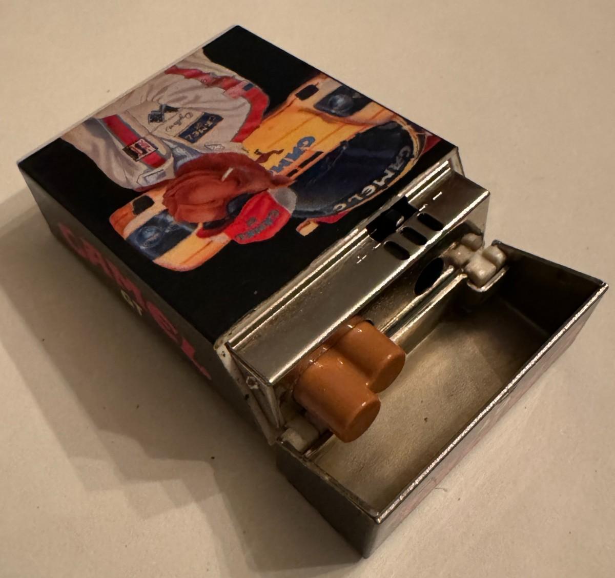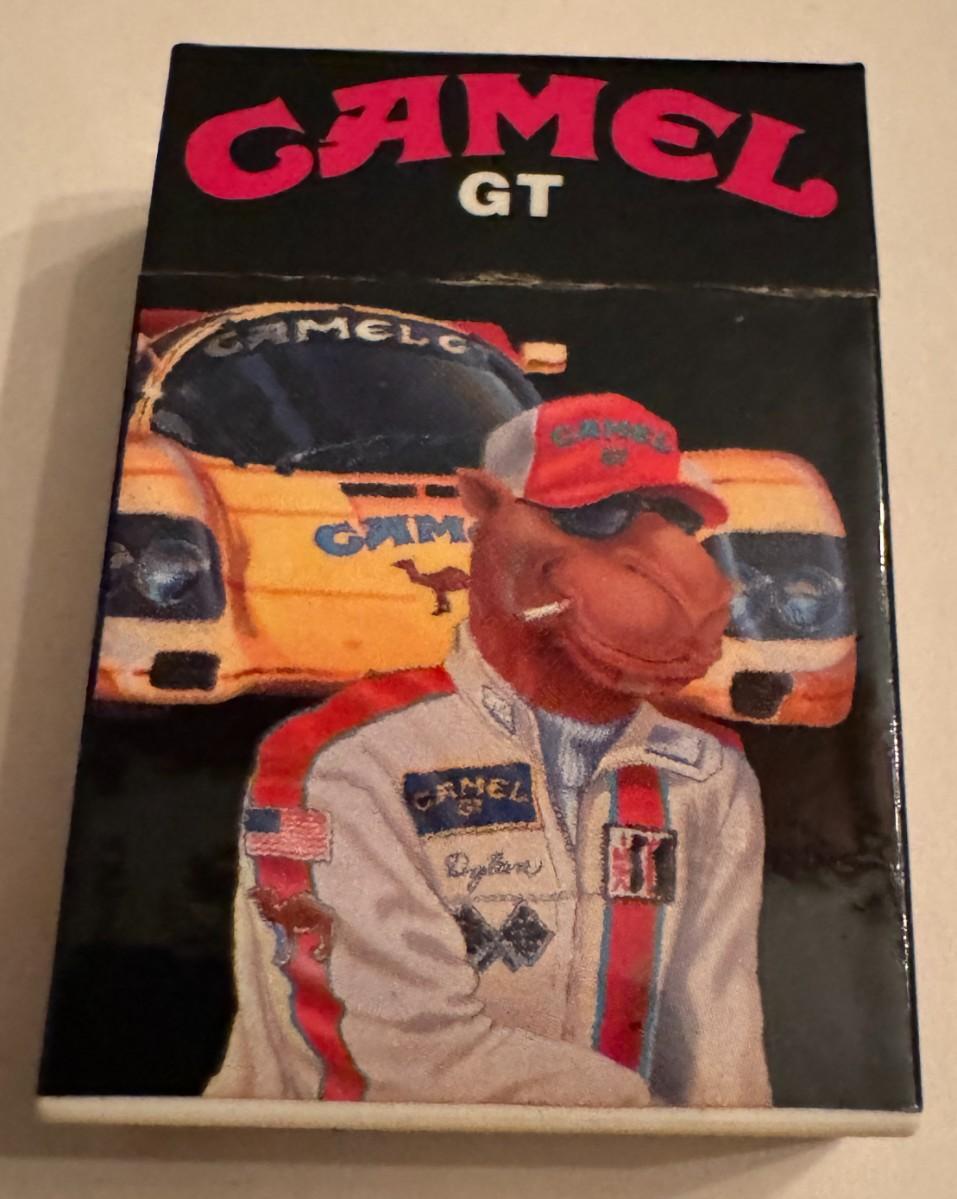 This lighter is part of the larger Camel GT Racing motorsports memorabilia line. The Joe Camel character was prominently featured in Camel cigarette advertising and promotional materials during the 1990s, often associated with a variety of sports and activities, including motorsports.