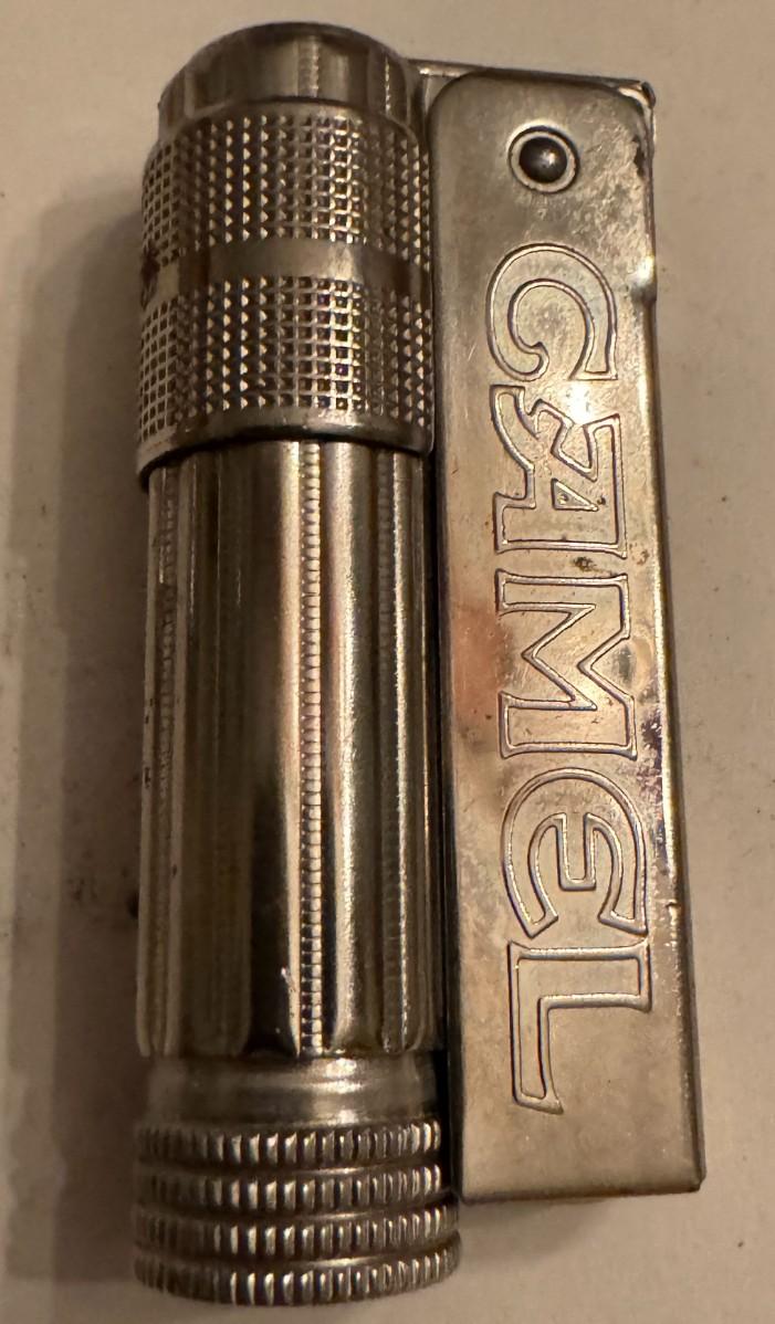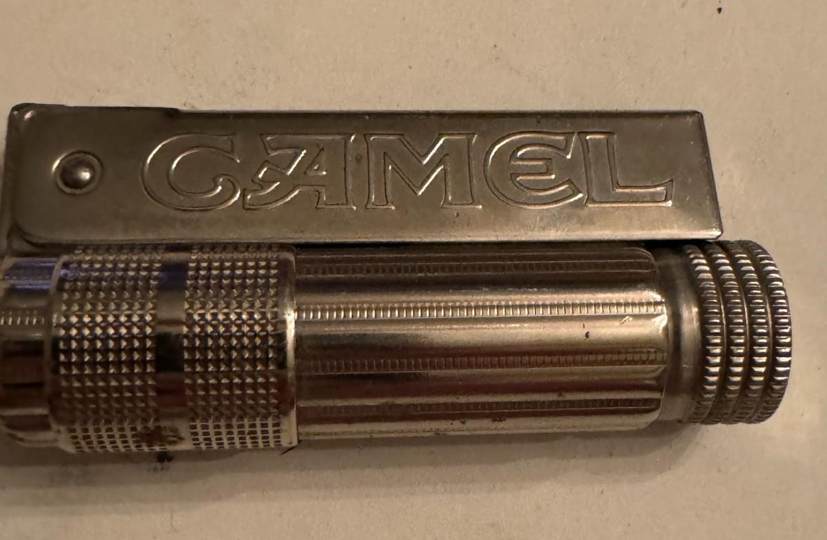 Vintage Camel branded trench lighter. It appears to be a Firebird OTR 60 model style which is a trench-style lighter