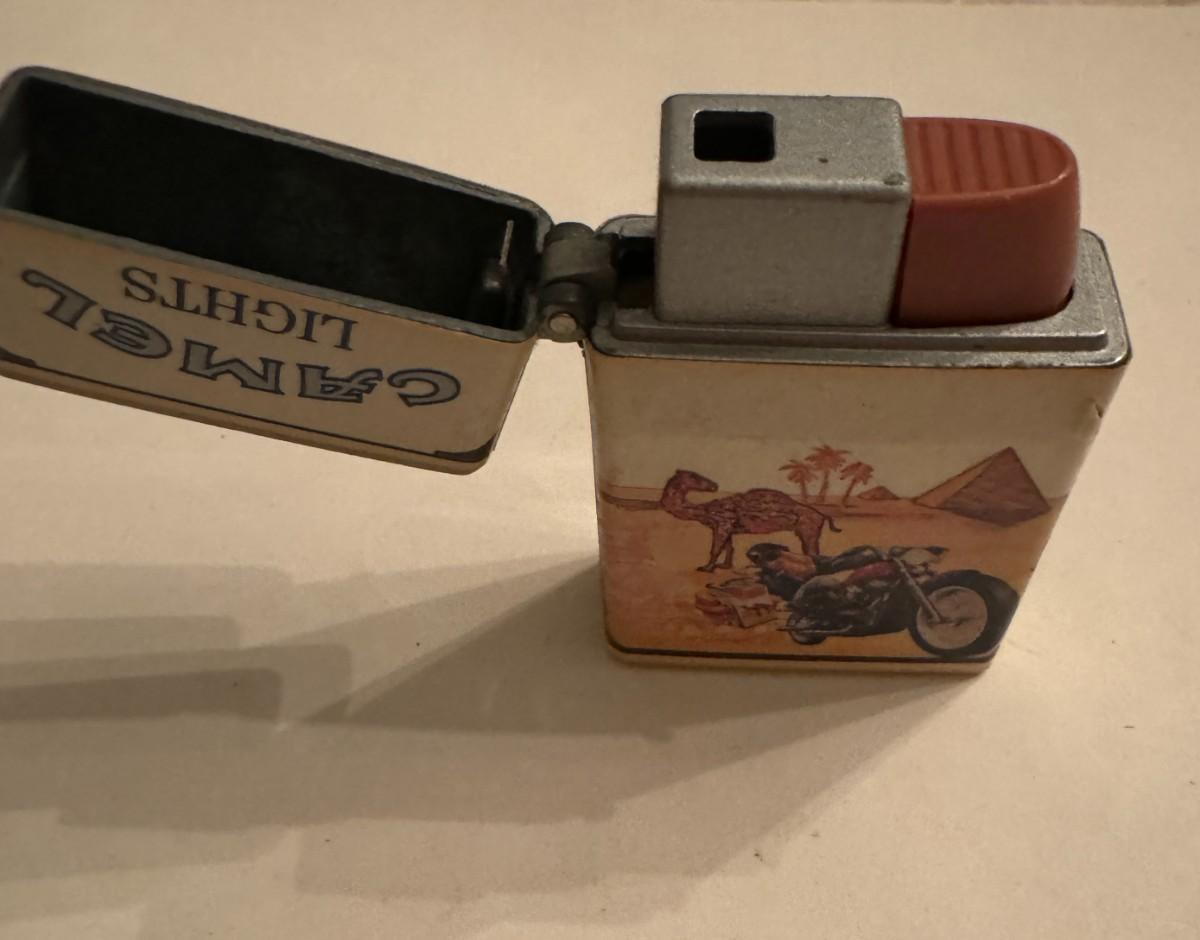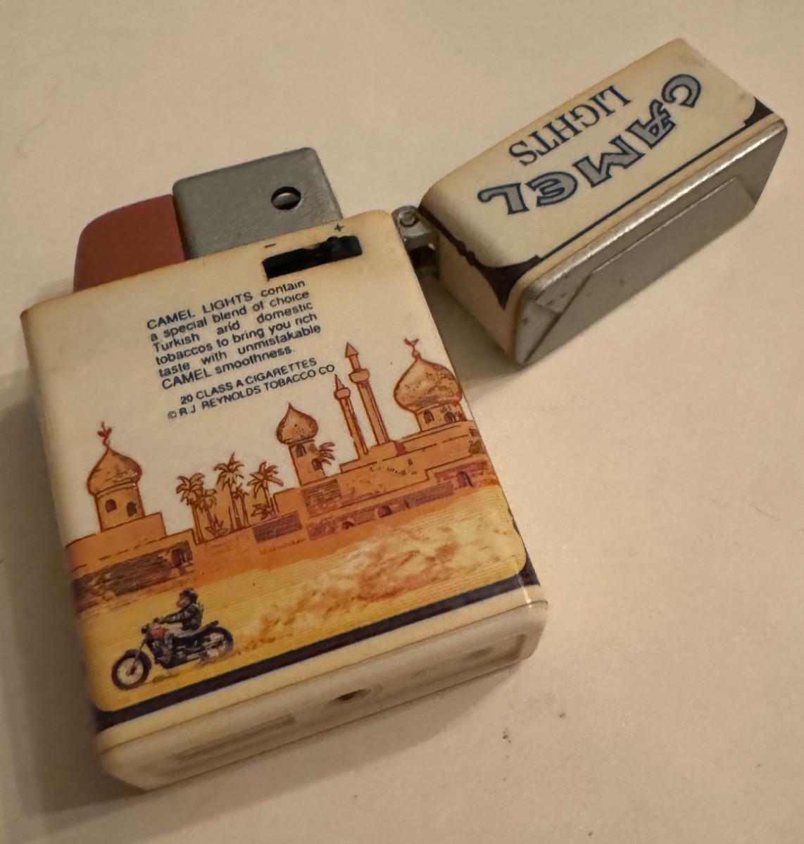 Camel lighter. It has a flip-top design and features a desert scene with a figure riding a motorcycle near an oasis or city with domes and minarets. The lighter is also decorated with text describing the blend of Turkish and domestic tobaccos in Camel Lights cigarettes.