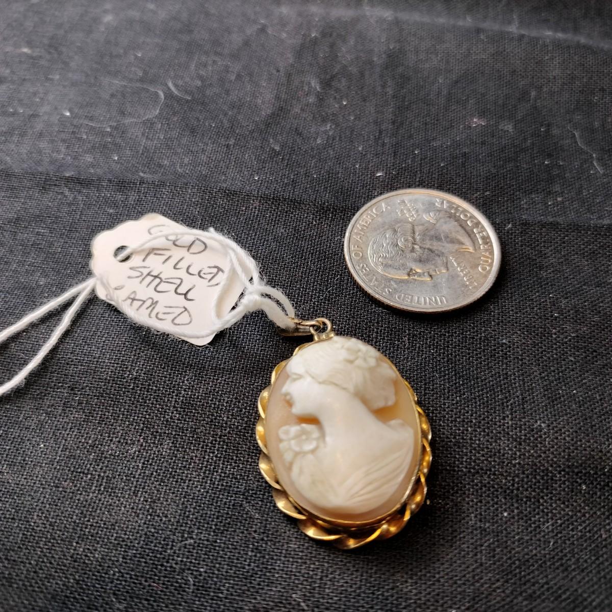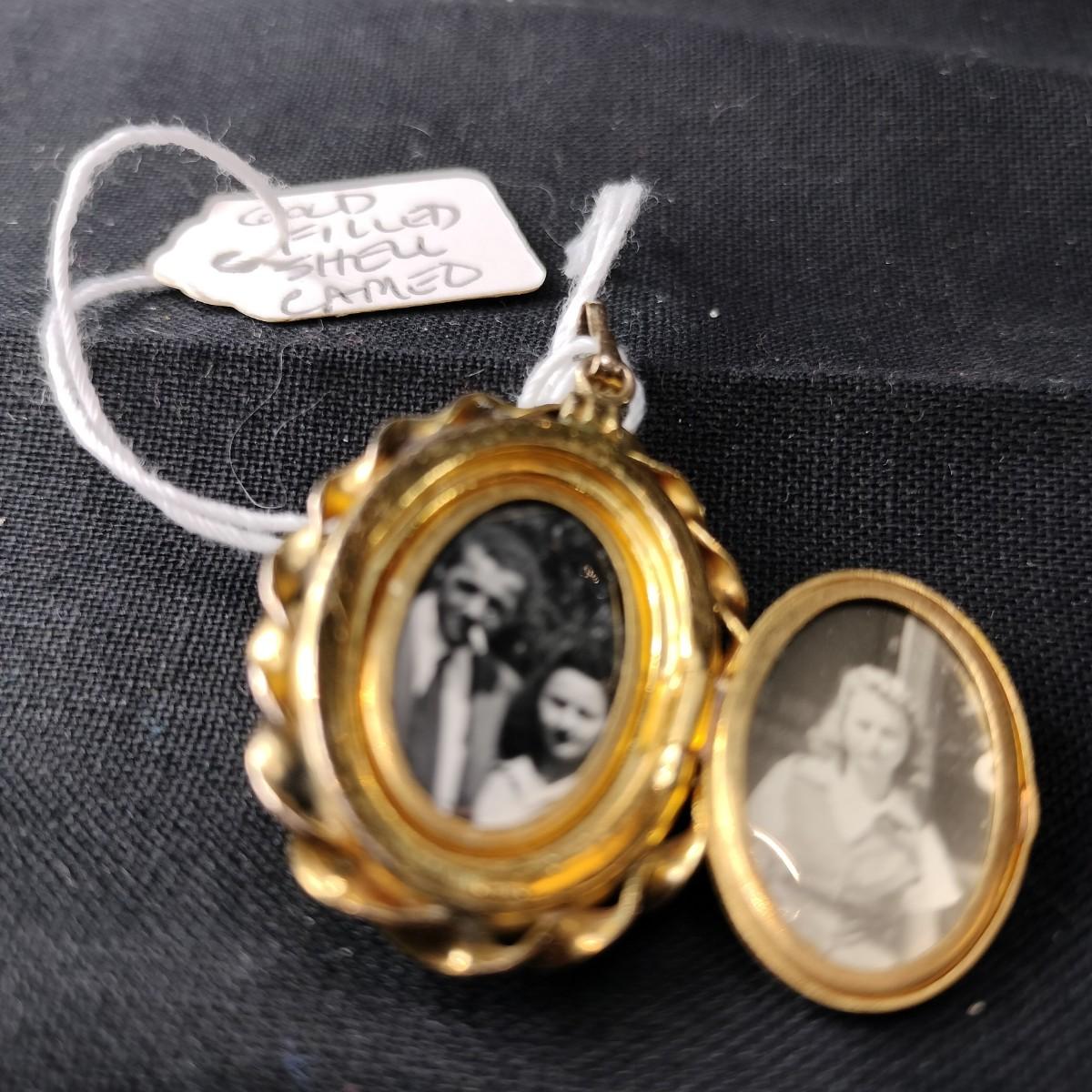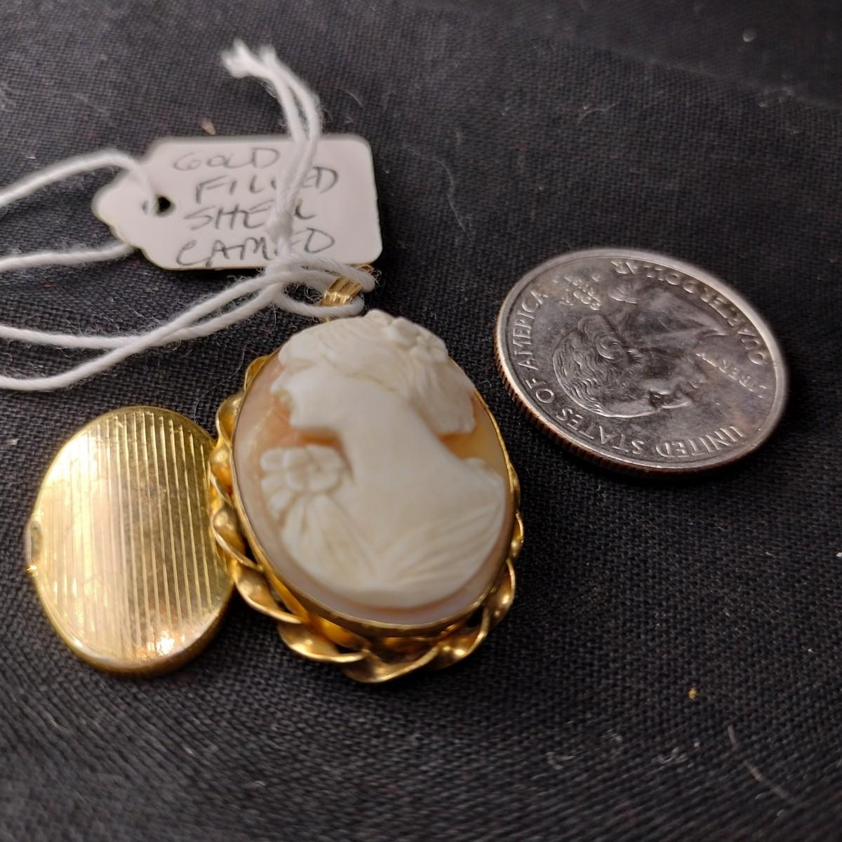 This auction lot is for Cameo #1 Locket - Gold-Filled Setting. This item is a lovely cut shell cameo locket. The cameo is set in a 1/20 12K Gold-Filled setting. The locket still has the vintage photos inside. It is oval shaped and measures about 1-inch at its tallest.