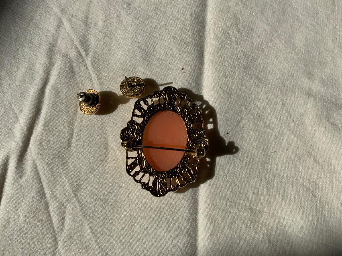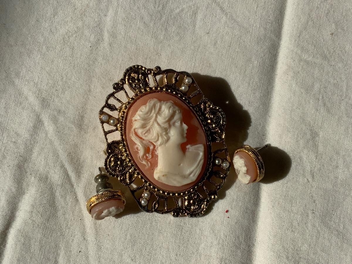 Nice Cameo brooch with seed pearls and earring set. Shows minor wear. Please see pics for condition