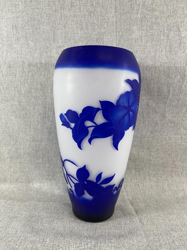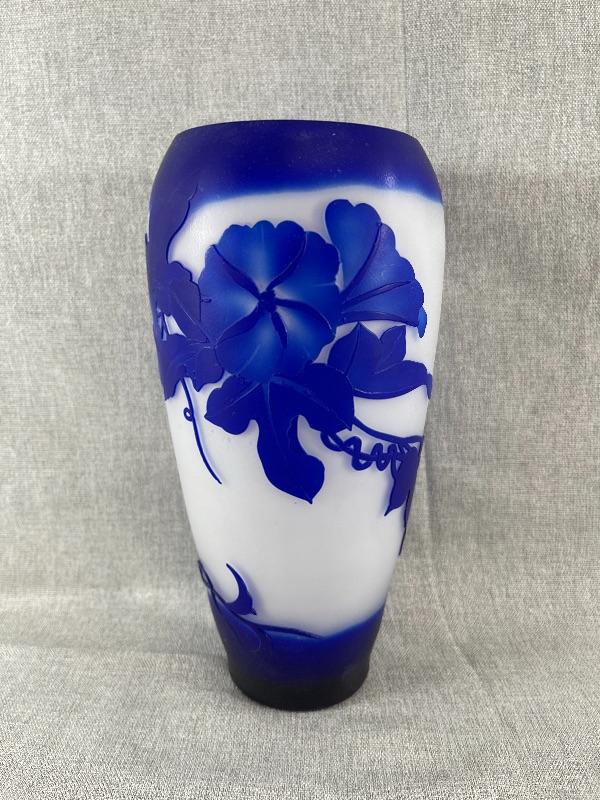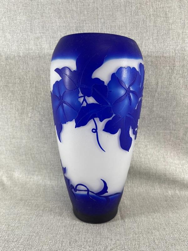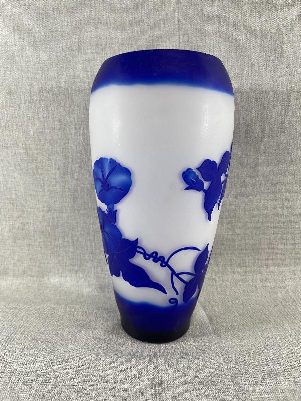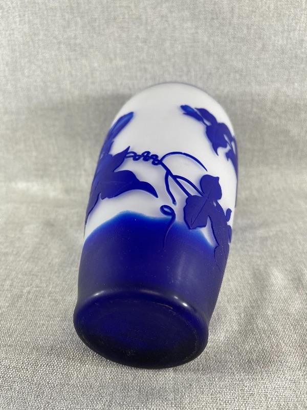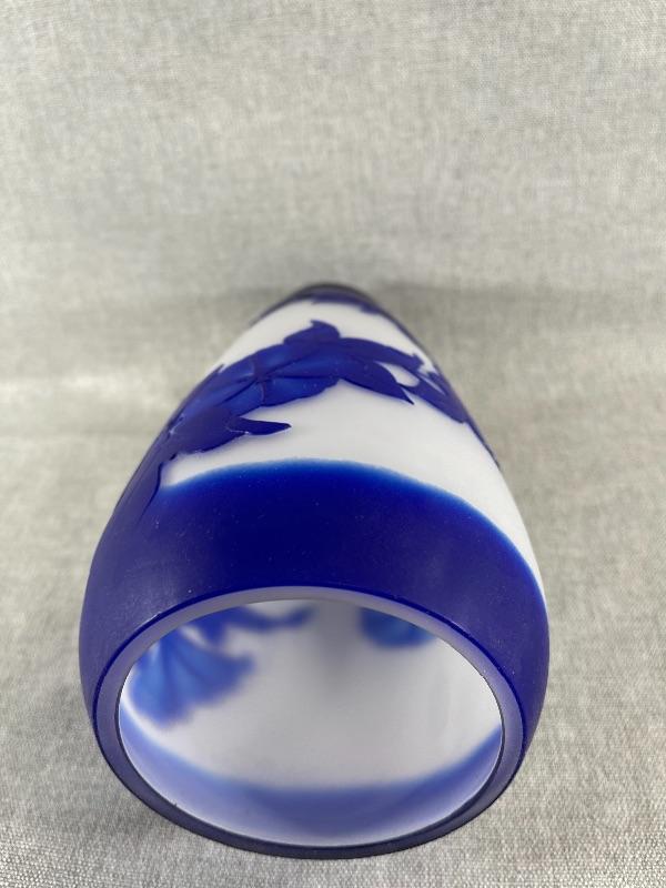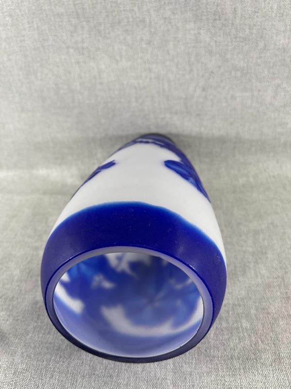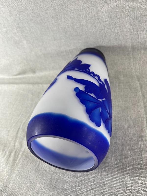A very nice blue and white floral cameo vase unsigned. And the style of Dom or LeGros. The vase is 9.5 inches high and 3.5 inch diameter. It is in very good condition, with no chips or cracks. There appears to be a couple of short lines that might be scratches, but might also be part of the design please see pictures. #24-30022