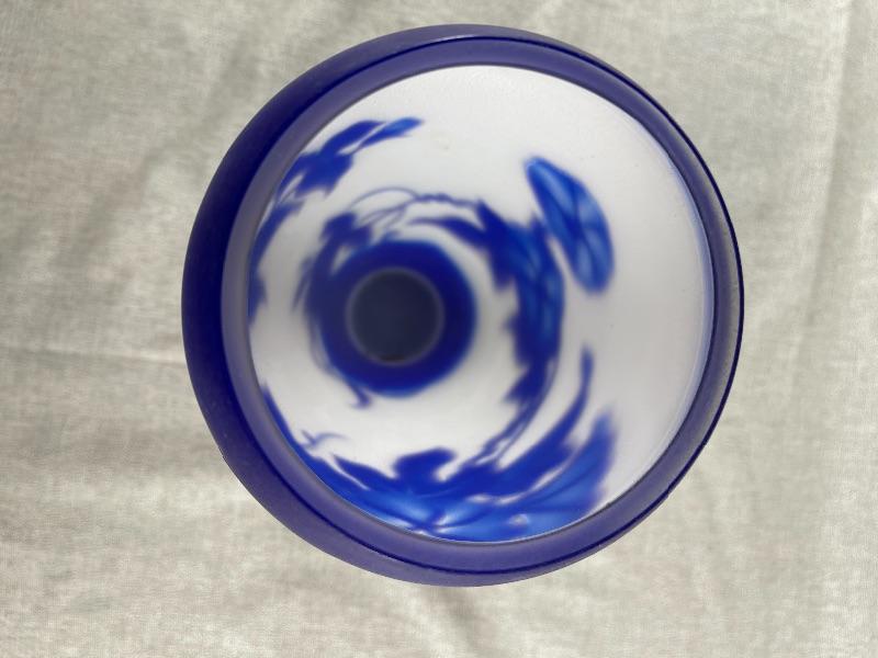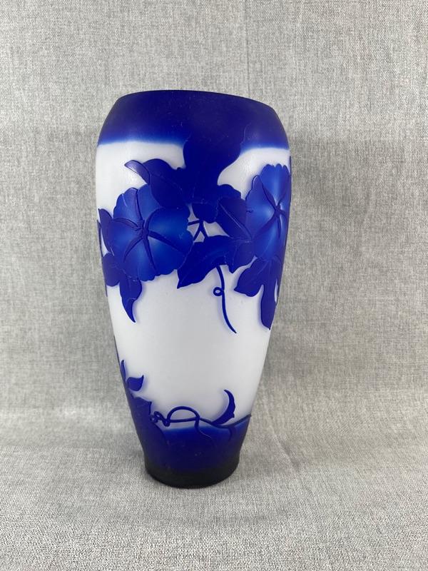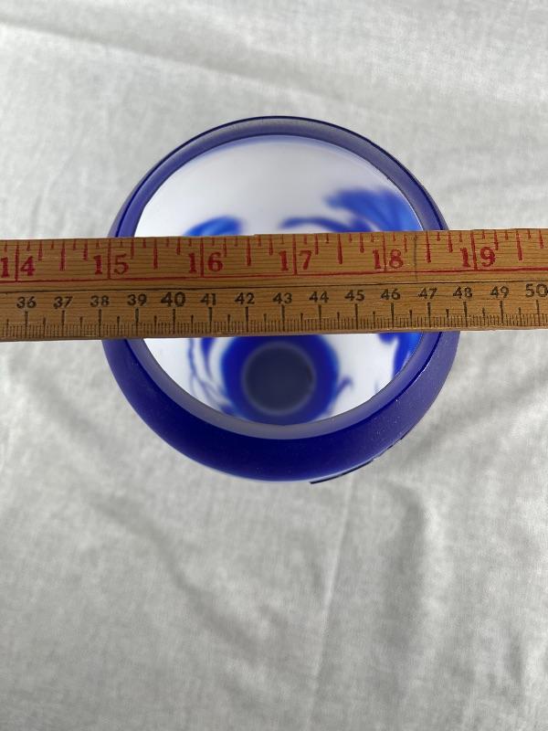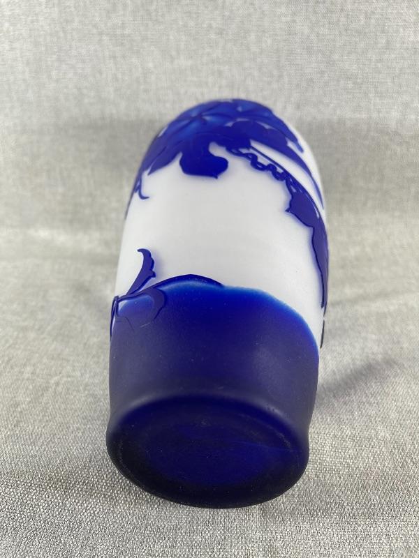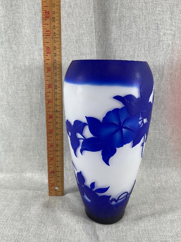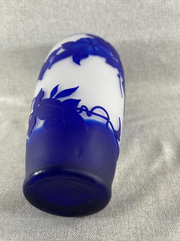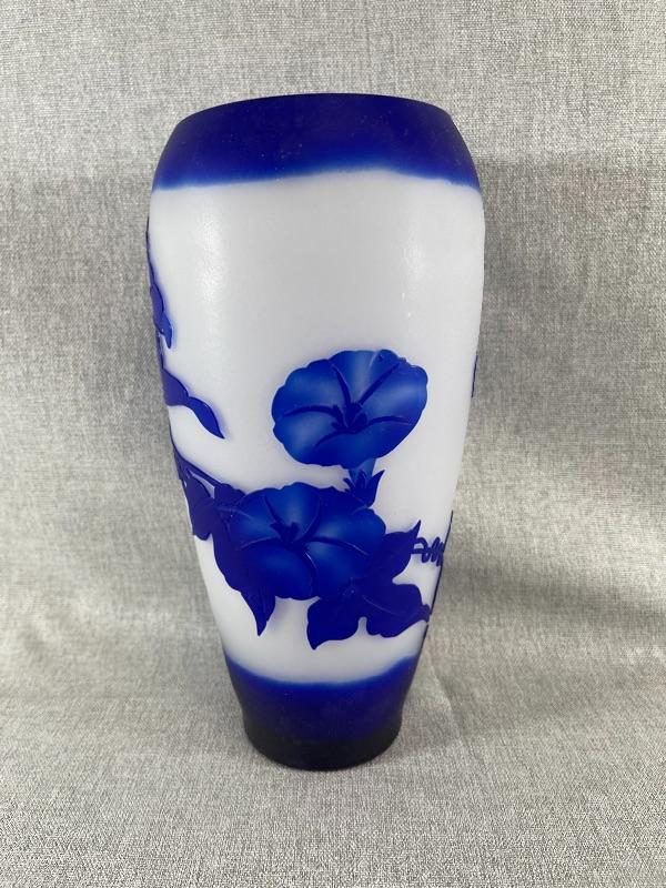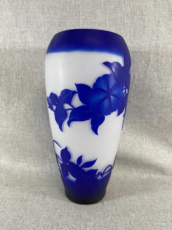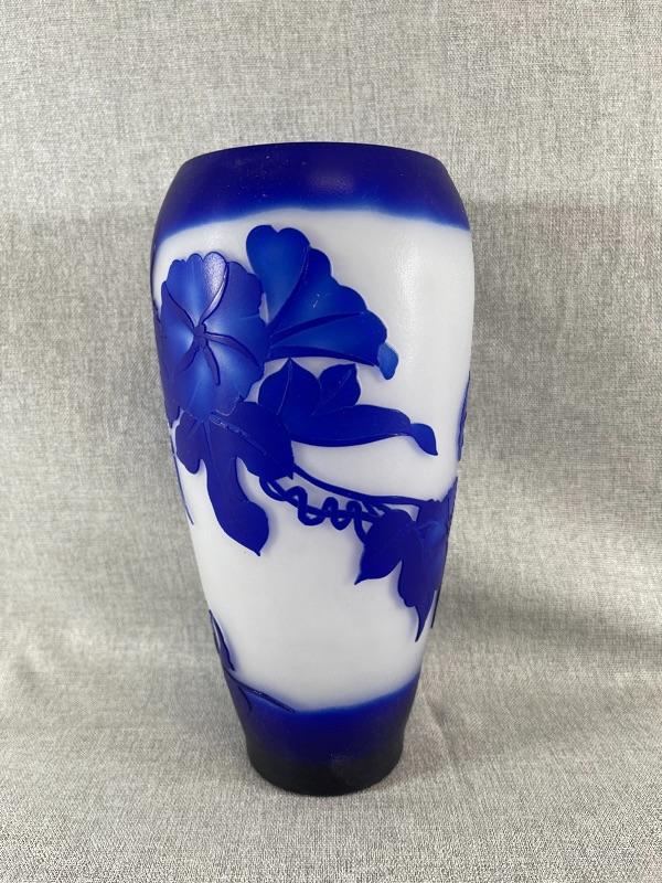 A very nice blue and white floral cameo vase unsigned. And the style of Dom or LeGros. The vase is 9.5 inches high and 3.5 inch diameter. It is in very good condition, with no chips or cracks. There appears to be a couple of short lines that might be scratches, but might also be part of the design please see pictures. #24-30022
