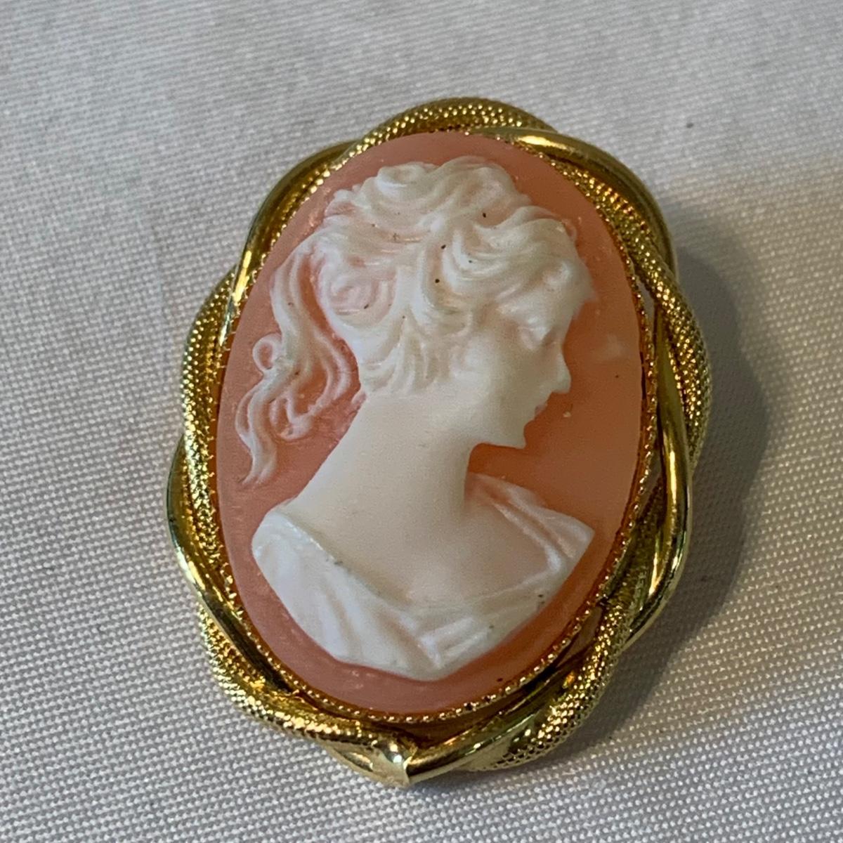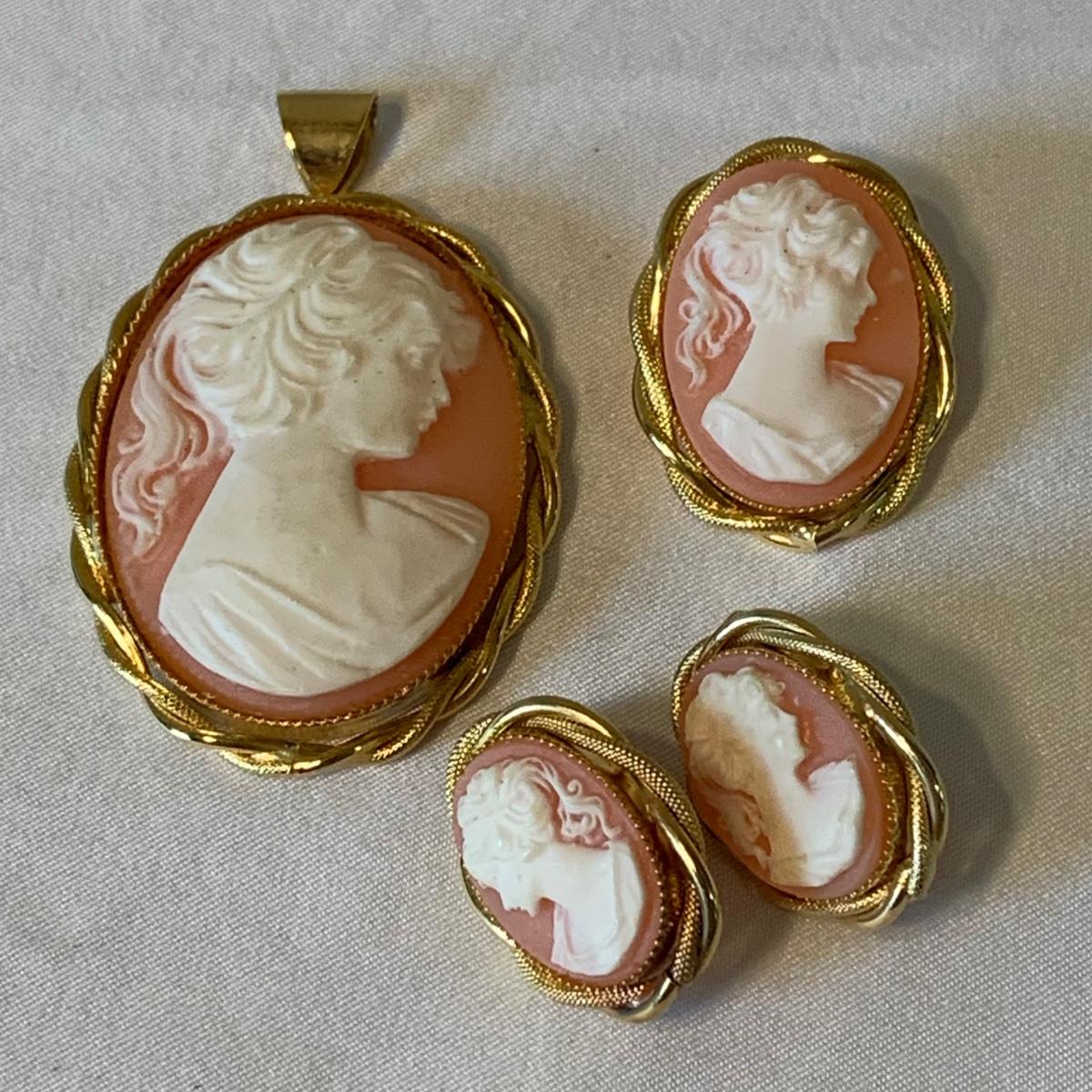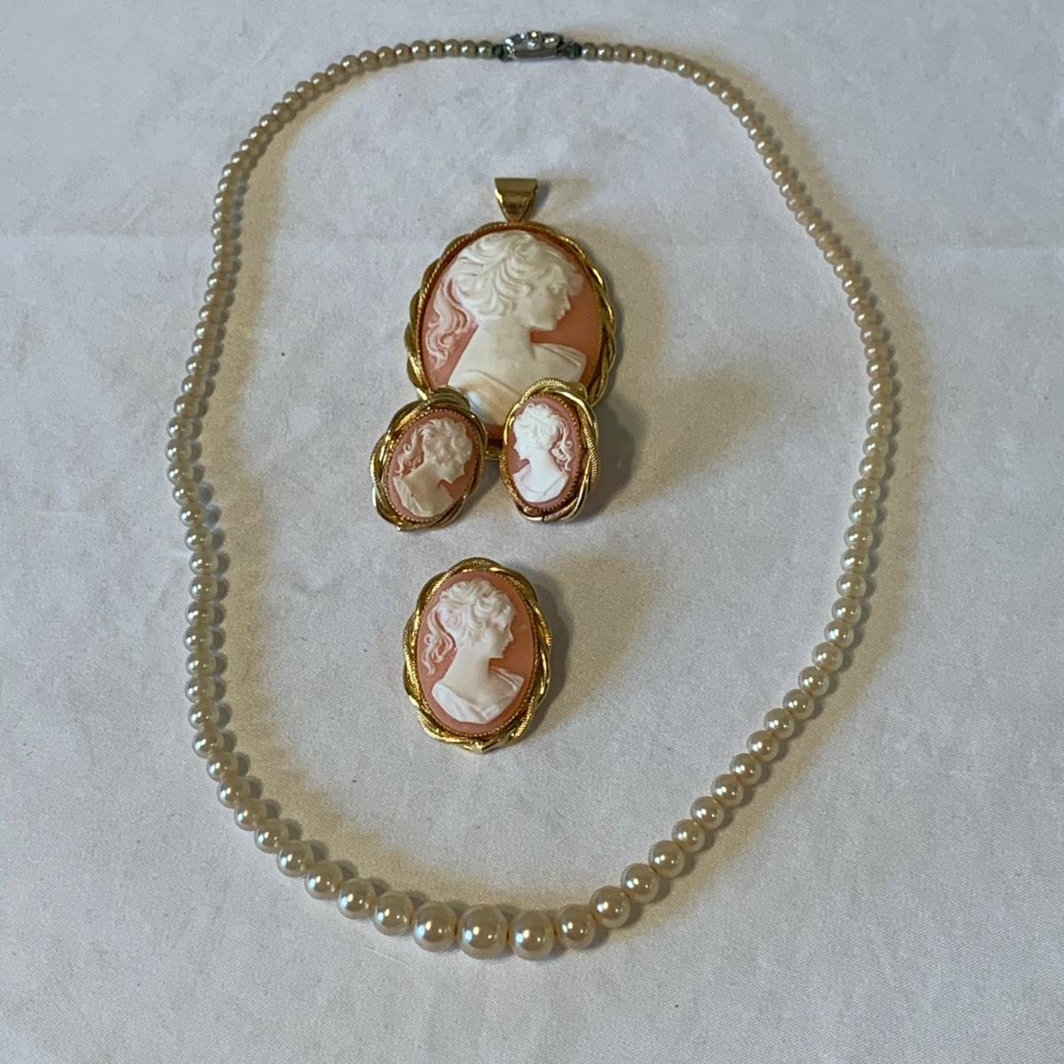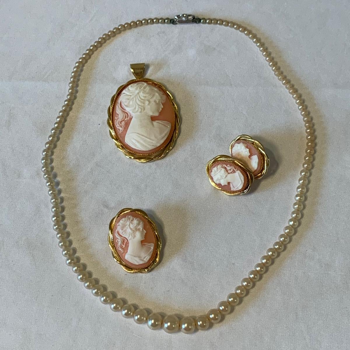 Cameo jewelry set includes a pendant, a pair of clip-on earrings, and a pin. They seem like they are made of a plastic or light resin material. The pearl necklace is 18”. We cannot verify if the pearls are real or not. Note the gemstone missing from the clasp.