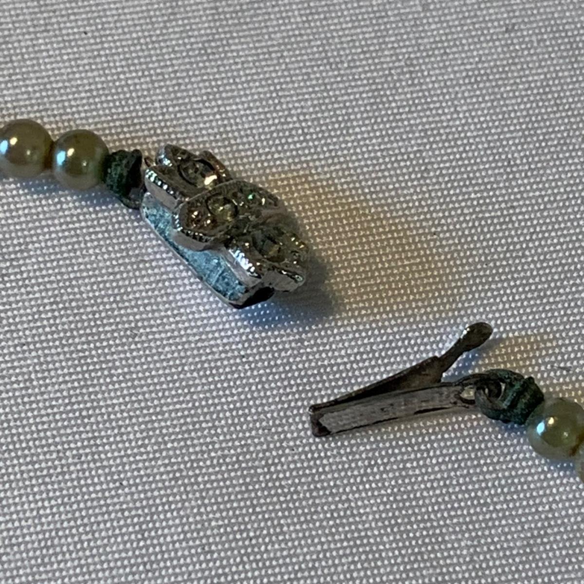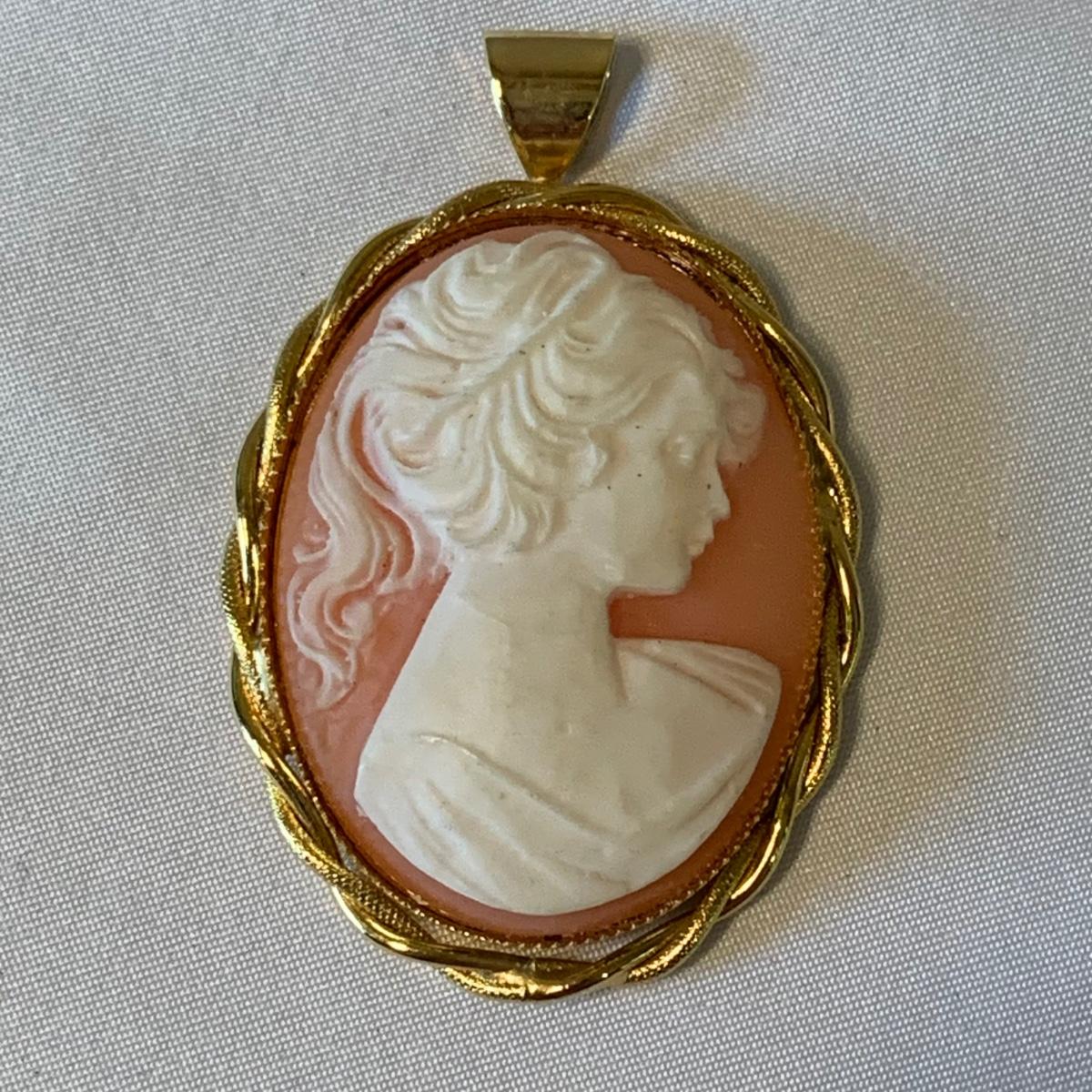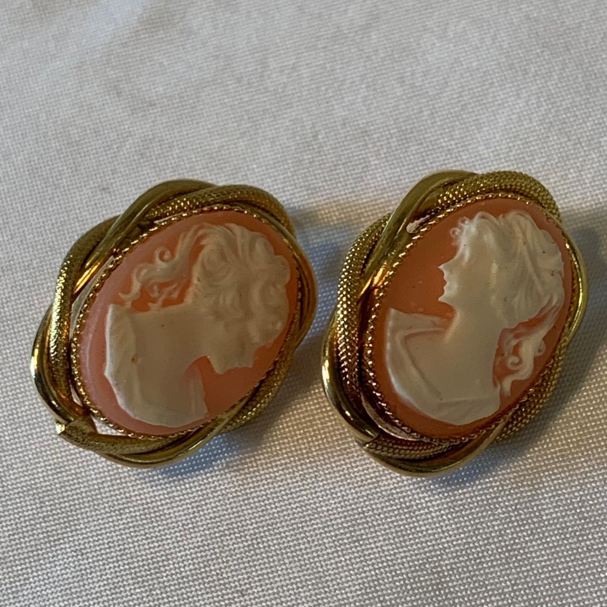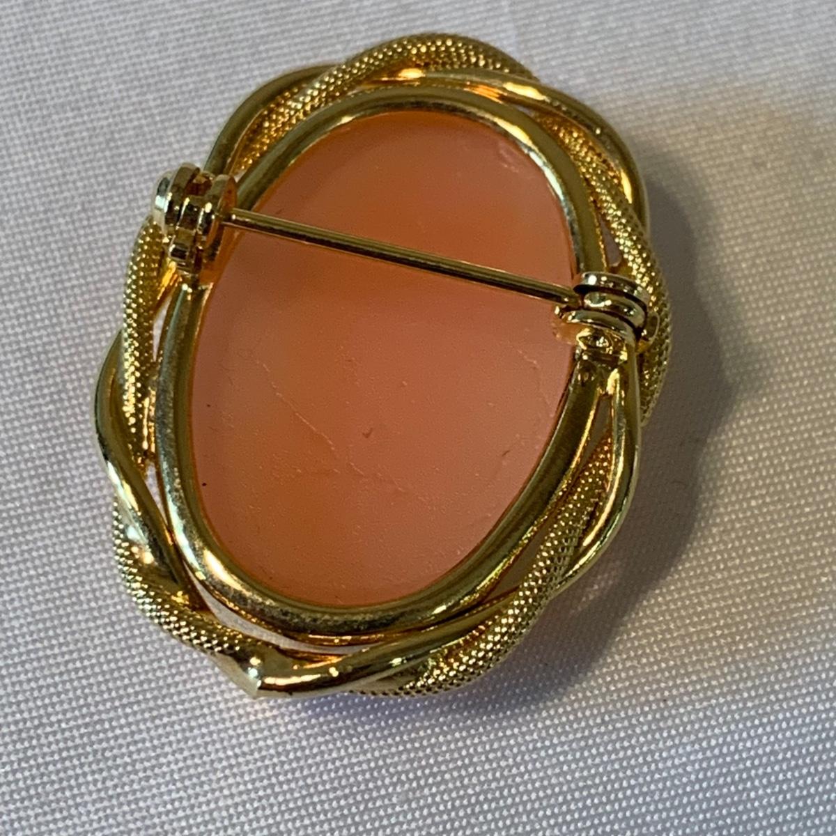 Cameo jewelry set includes a pendant, a pair of clip-on earrings, and a pin. They seem like they are made of a plastic or light resin material. The pearl necklace is 18”. We cannot verify if the pearls are real or not. Note the gemstone missing from the clasp.