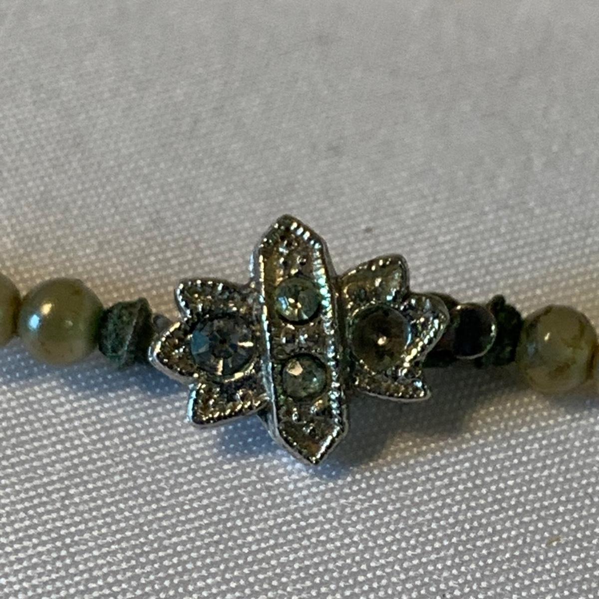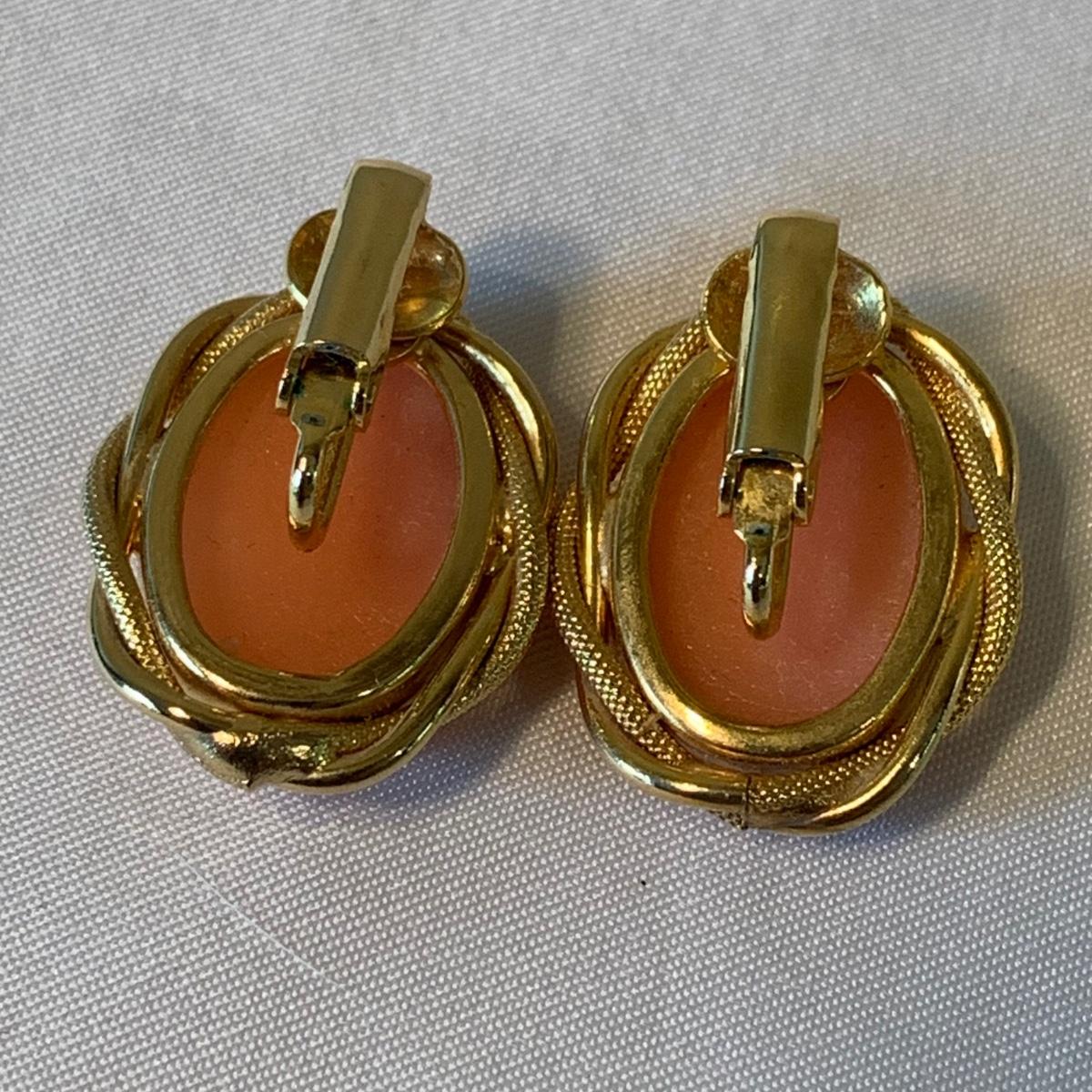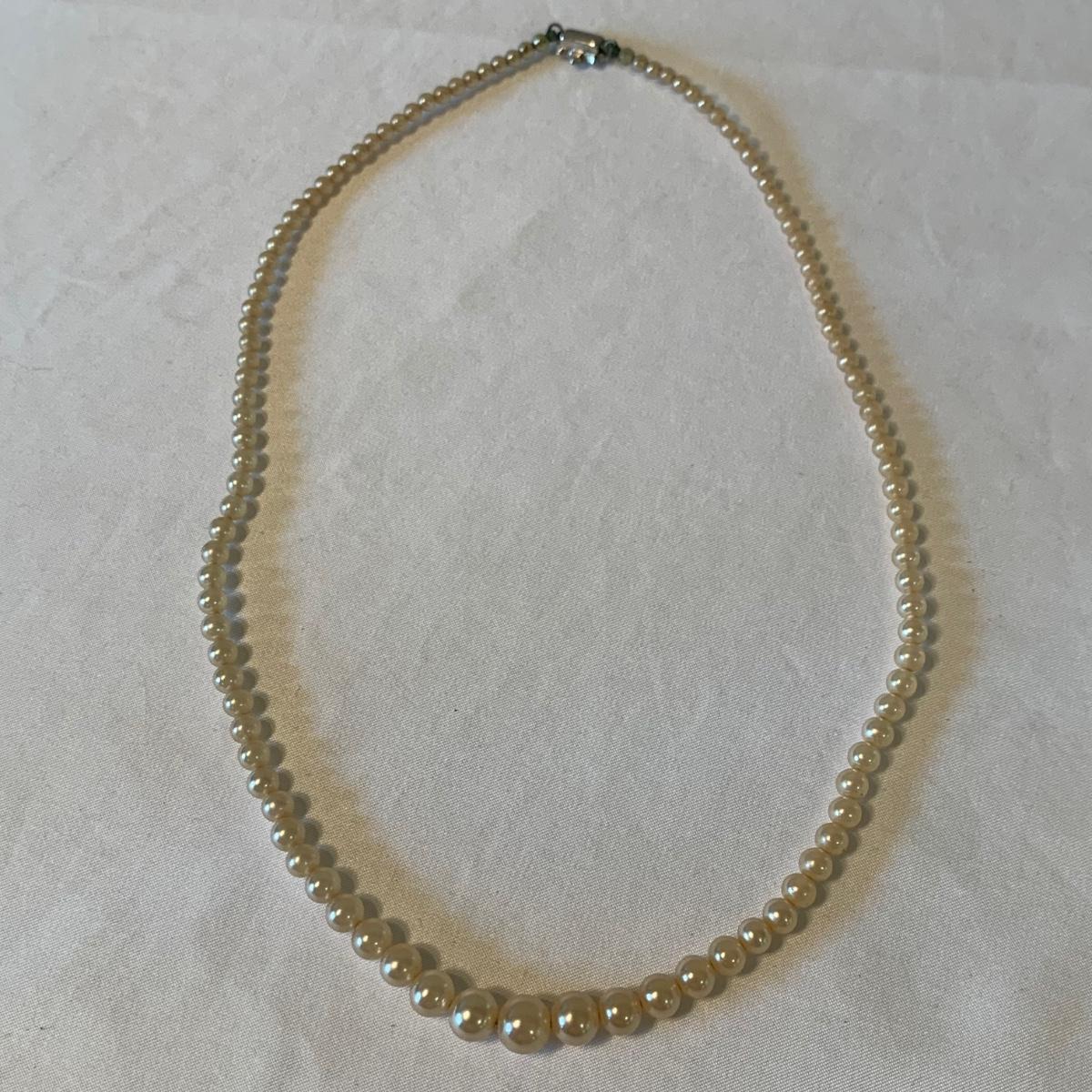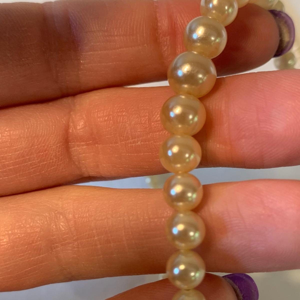 Cameo jewelry set includes a pendant, a pair of clip-on earrings, and a pin. They seem like they are made of a plastic or light resin material. The pearl necklace is 18”. We cannot verify if the pearls are real or not. Note the gemstone missing from the clasp.