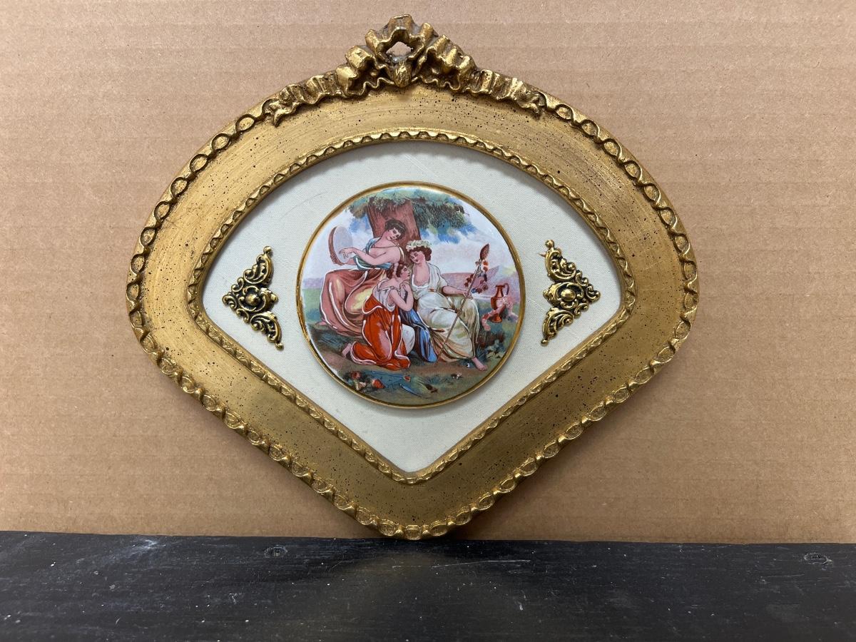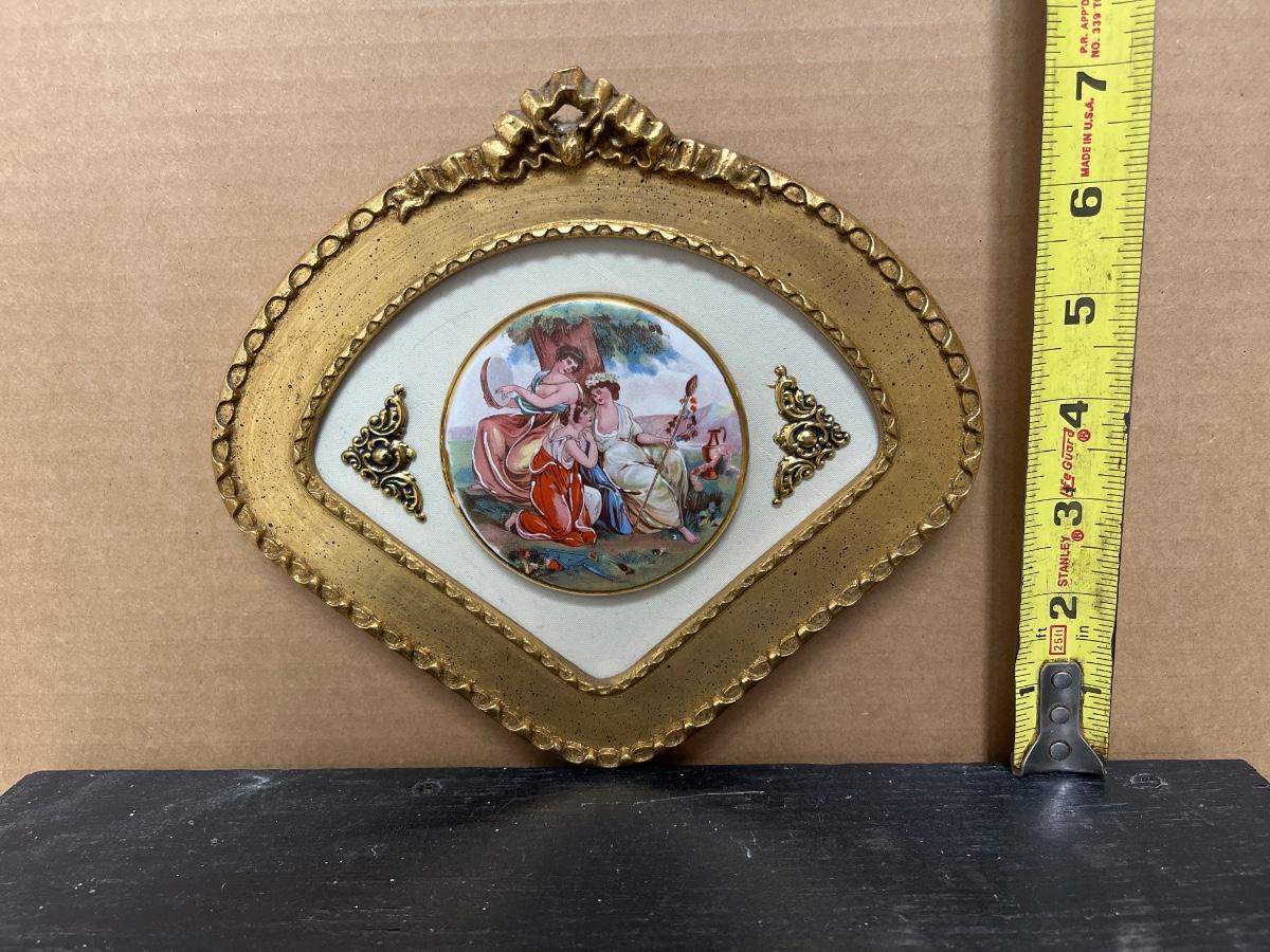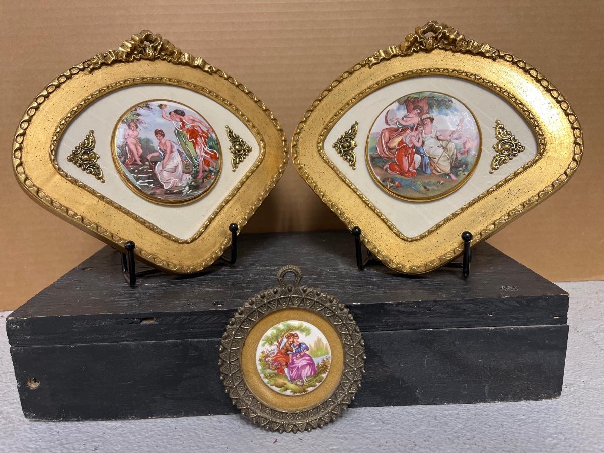 Pair of Sungott porcelain cameos and Fargonard cameo wall hanging