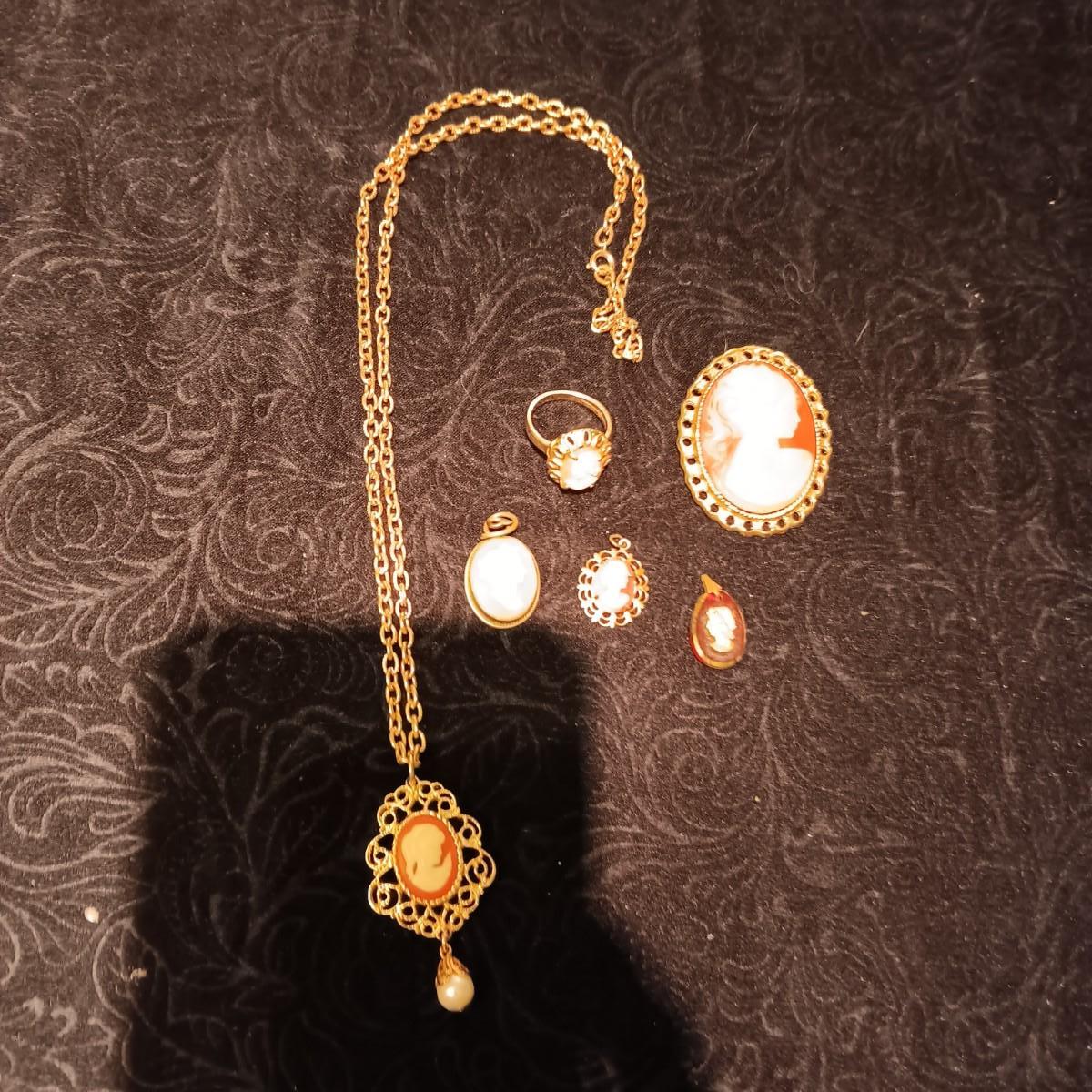 CAMEO NECKLACE, RING, PENDANTS AND PIN