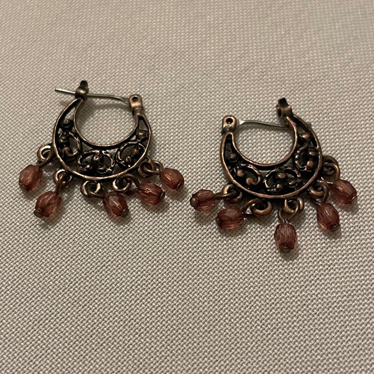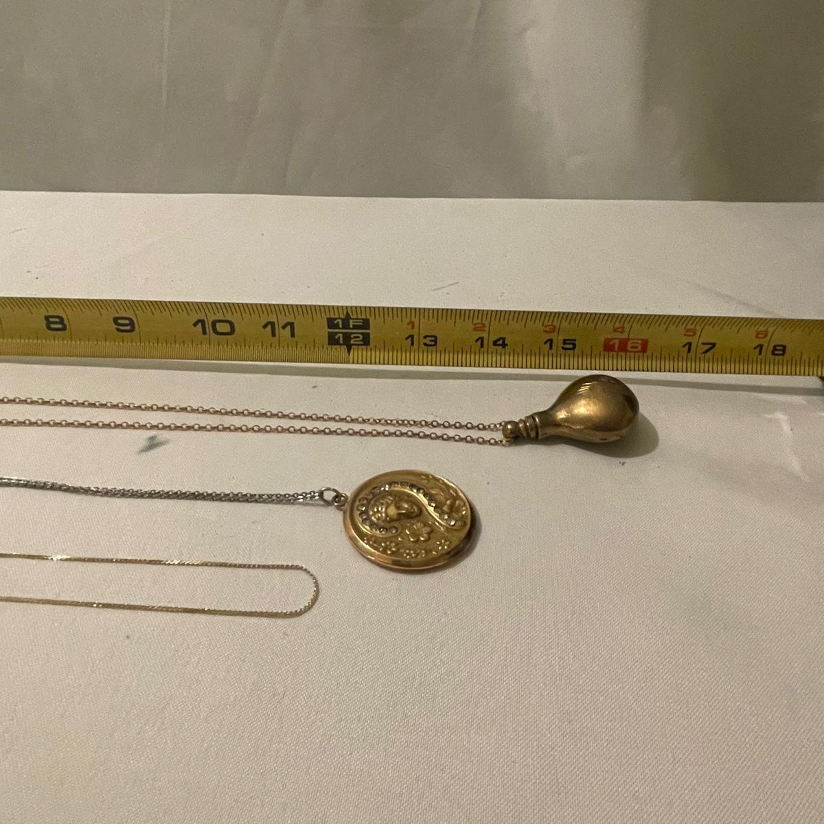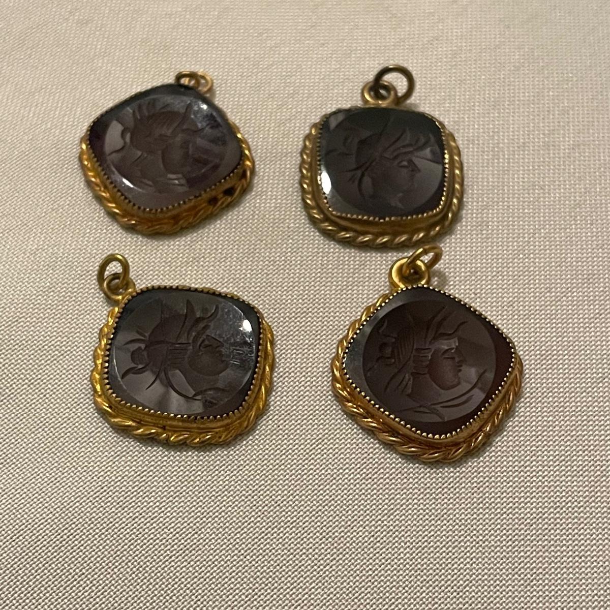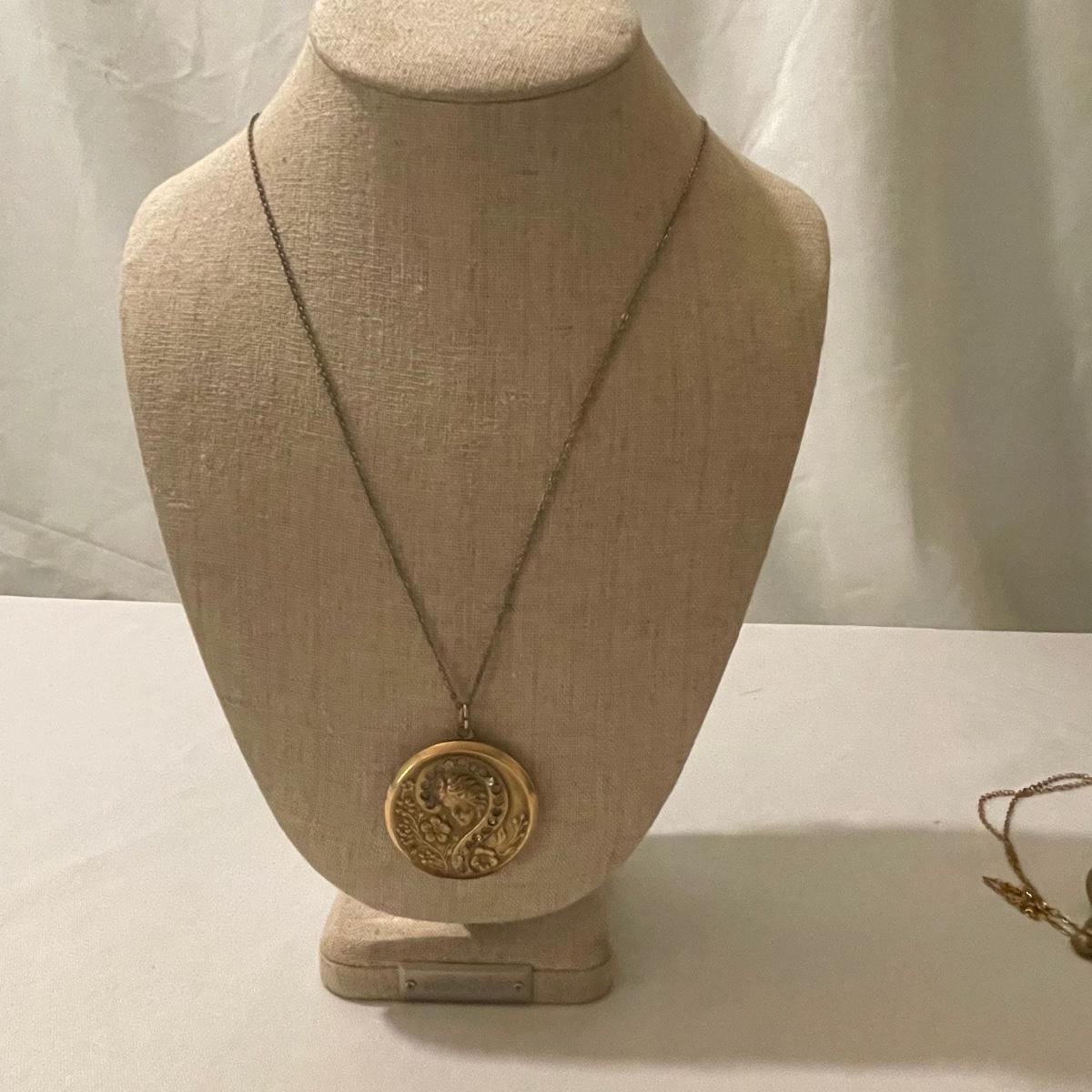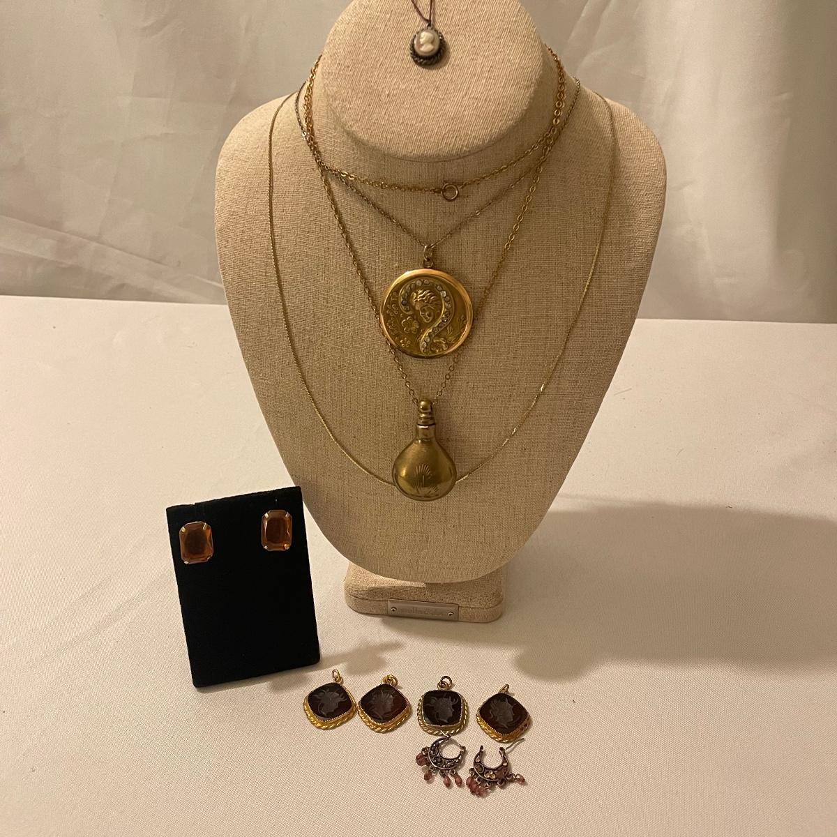 Three necklaces, five pendants including the cameo pendant and two pairs of earrings for pierced ears make up this assortment of gold colored jewelry. Please note the four red and gold pendants are all identical.