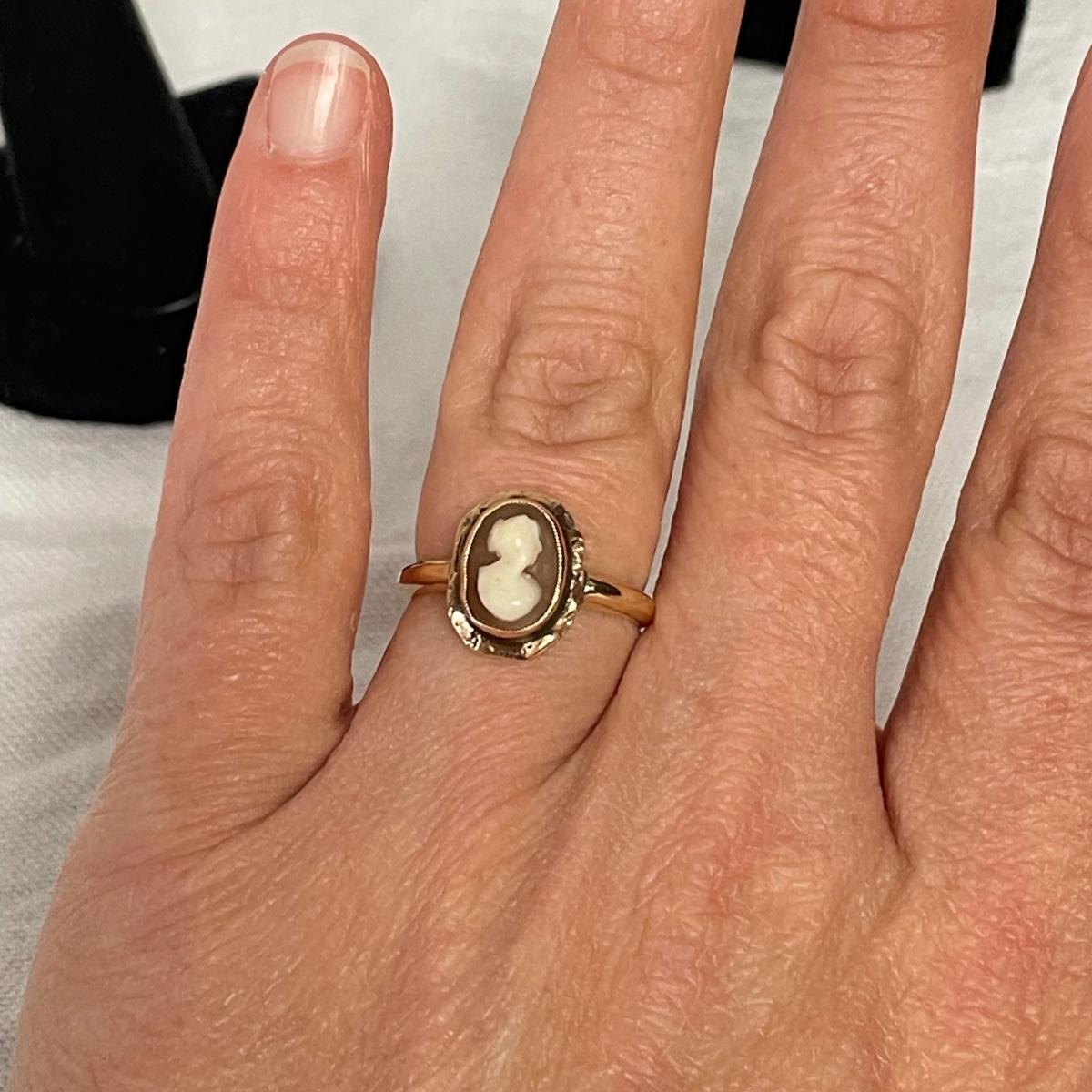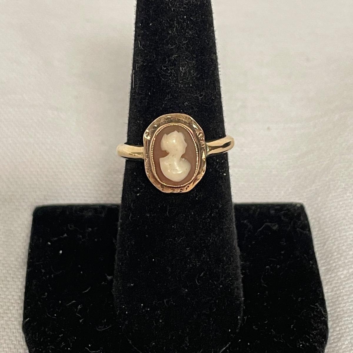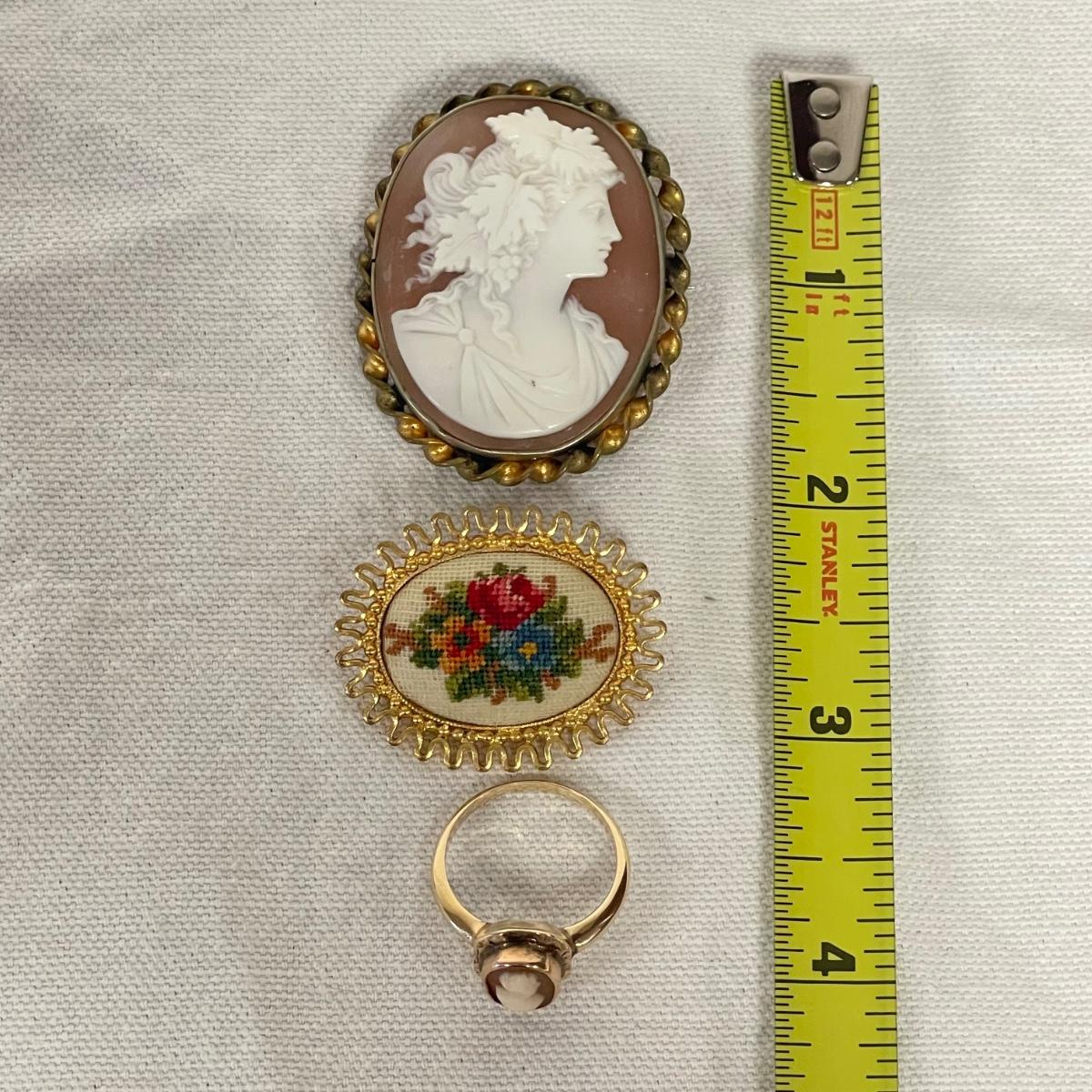 A lovely Cameo brooch and ring pair, both with pale mauve backgrounds, the centers appear to be hand carved. The ring has a very pronounced K stamp, but no other known markings. Lot also includes a miniature needlepoint style “petit point” brooch. See images. Shipping available. All sales are final. No returns or refunds. Please bid accordingly.