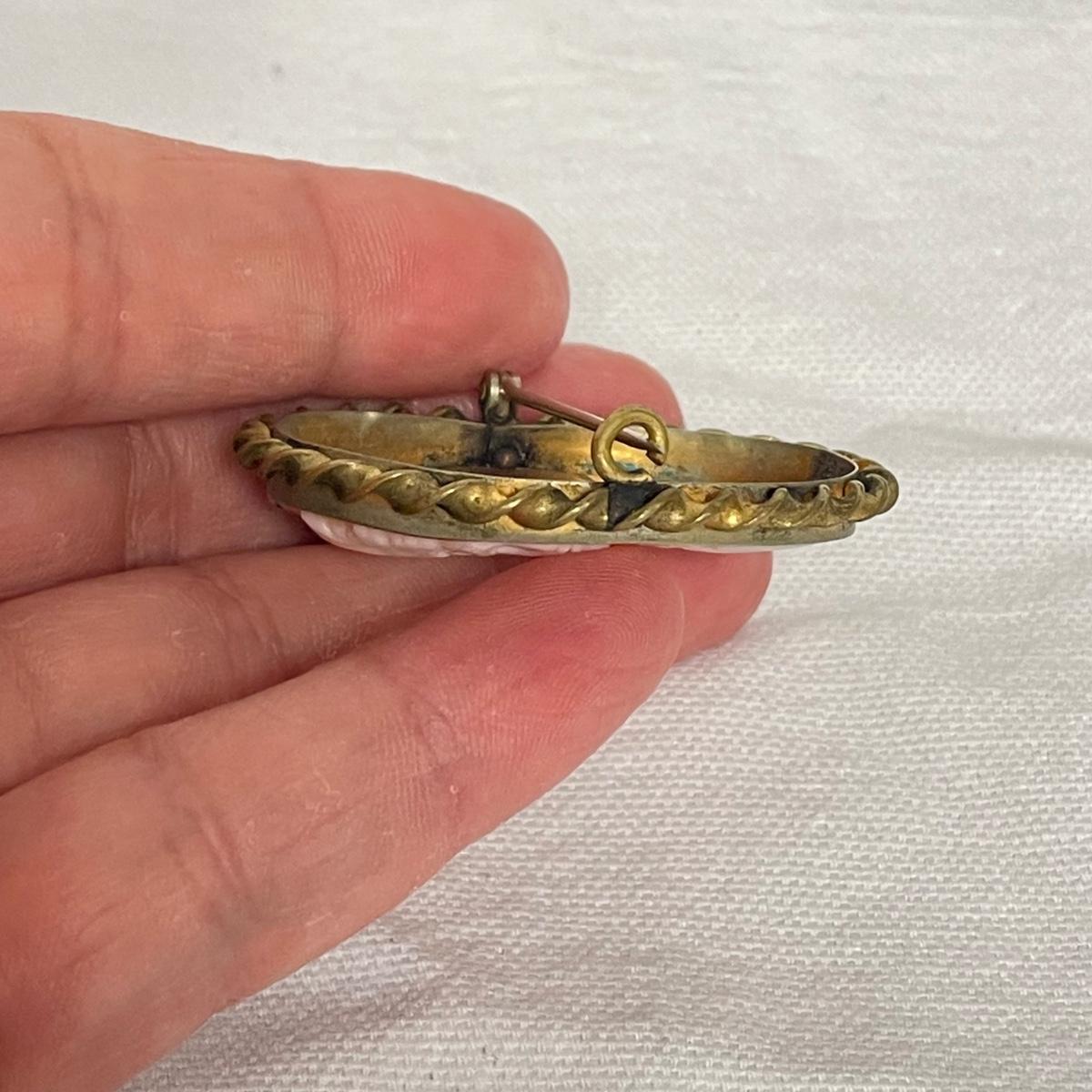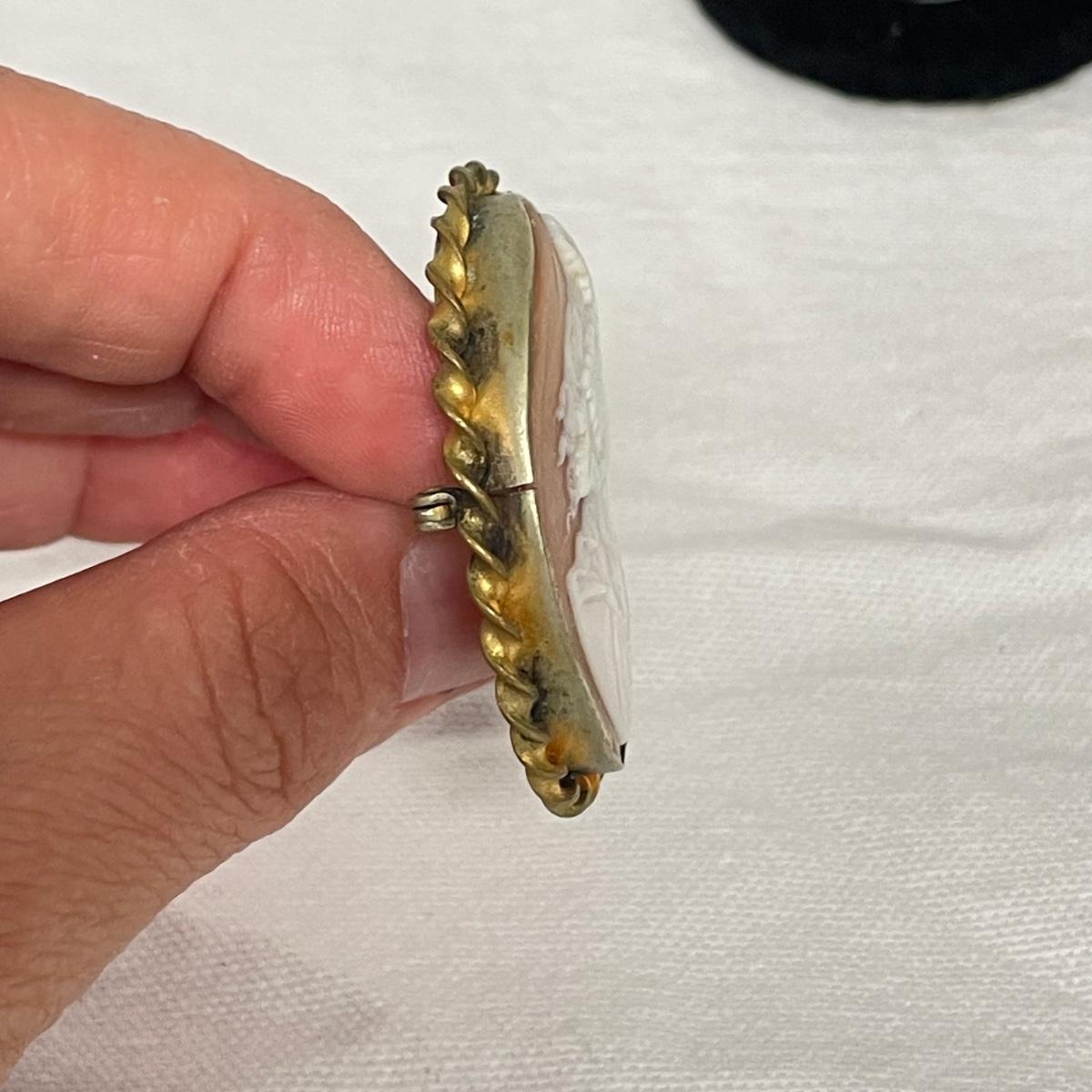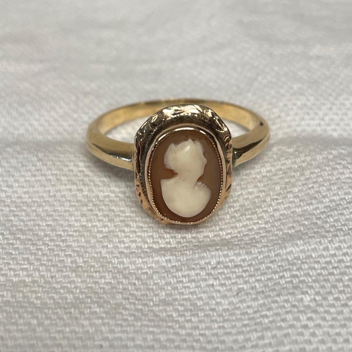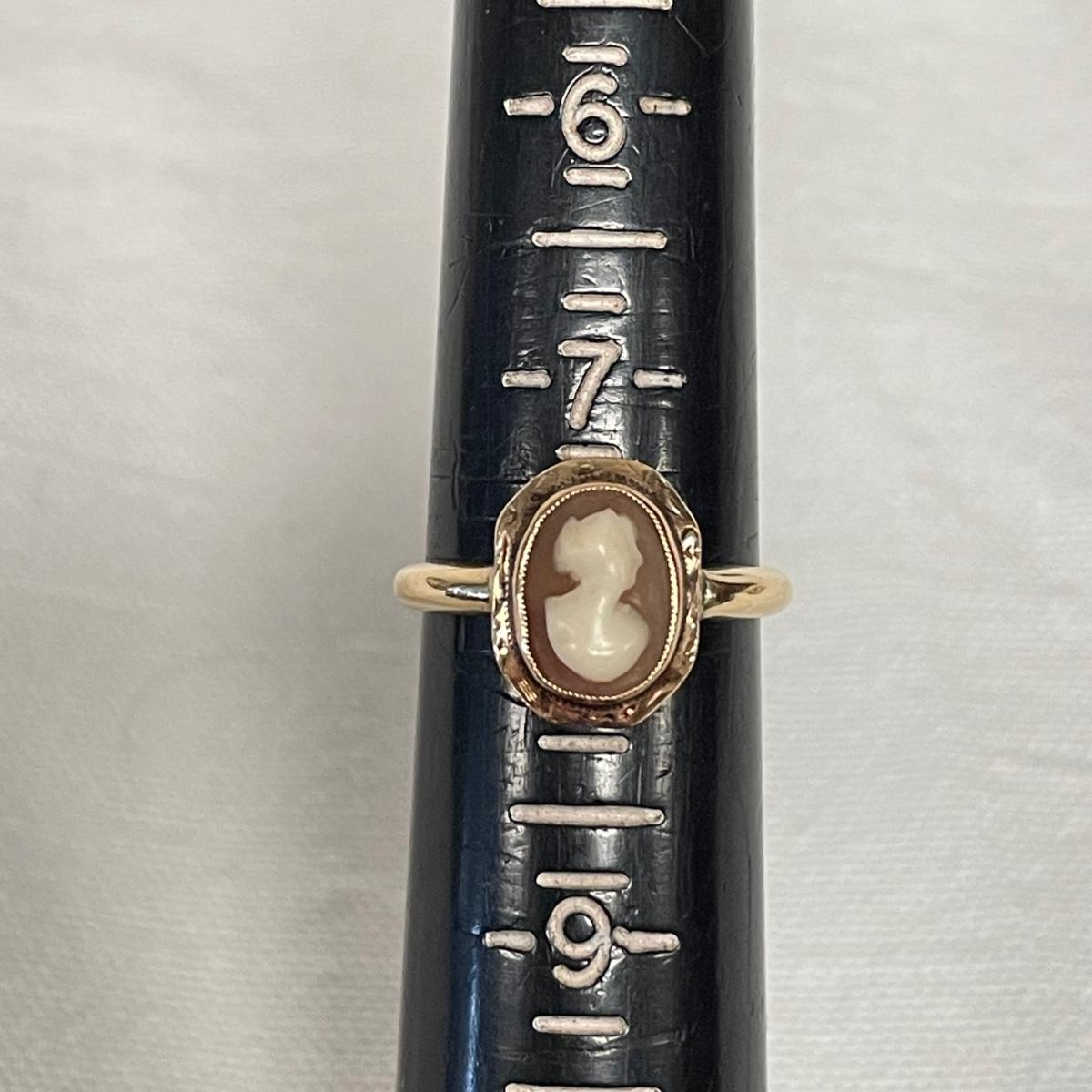 A lovely Cameo brooch and ring pair, both with pale mauve backgrounds, the centers appear to be hand carved. The ring has a very pronounced K stamp, but no other known markings. Lot also includes a miniature needlepoint style “petit point” brooch. See images. Shipping available. All sales are final. No returns or refunds. Please bid accordingly.