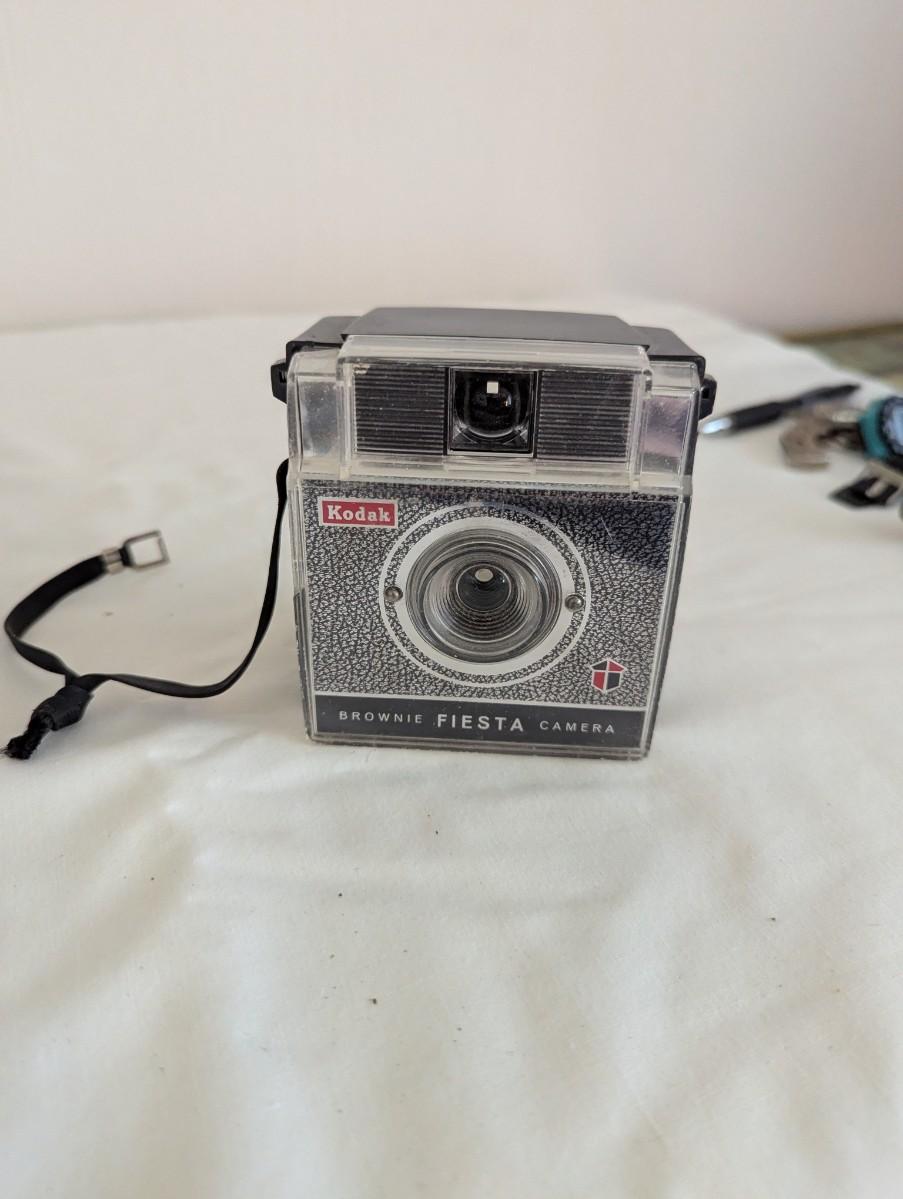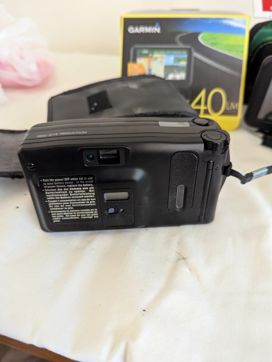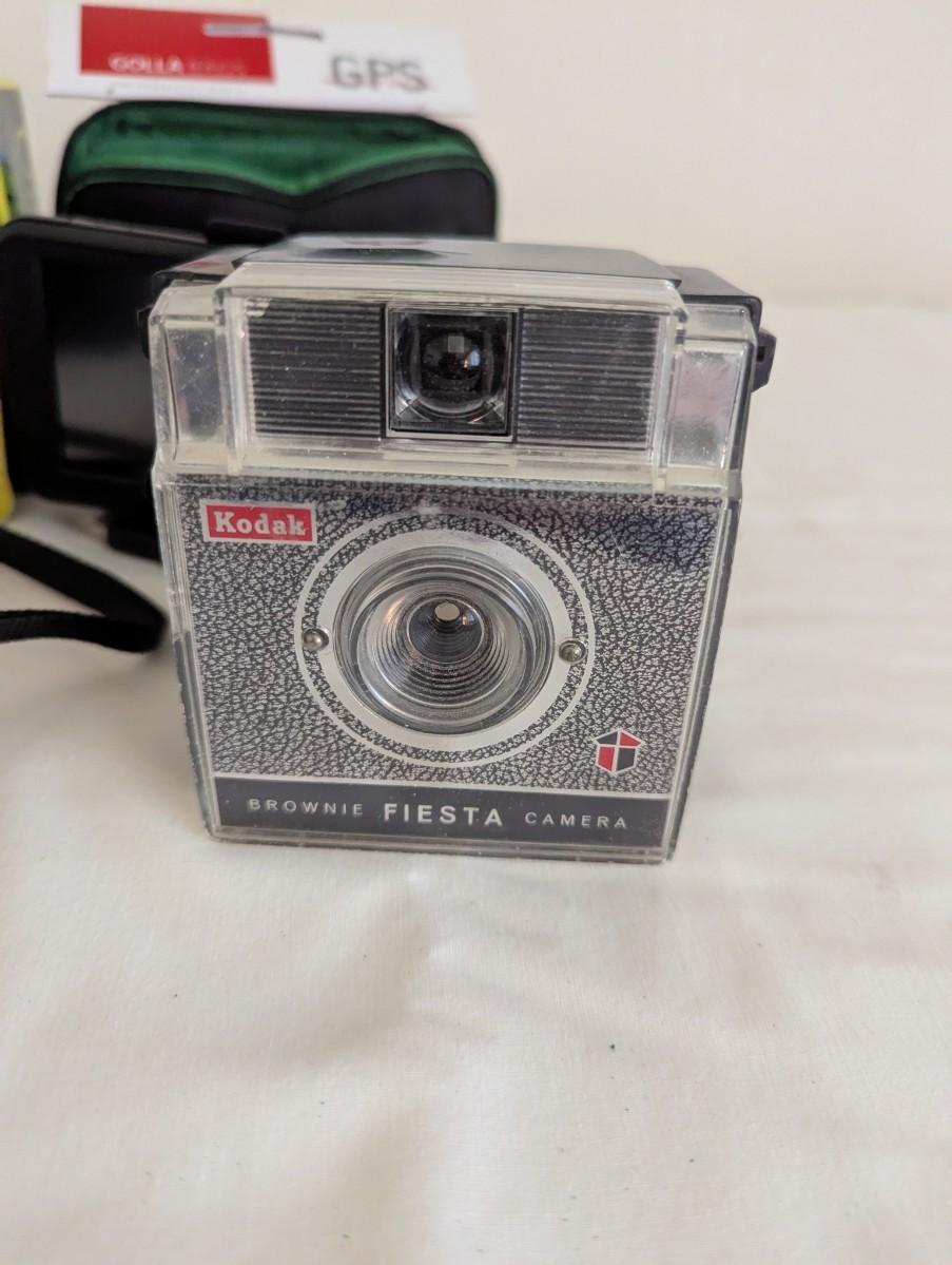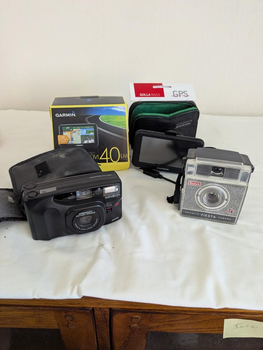 Kodak Brownie Fiesta Camera, Minolta Action Zoom Camera, Garmin, and Garmin Case.