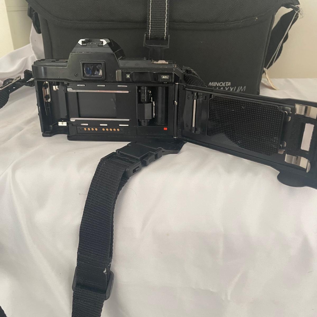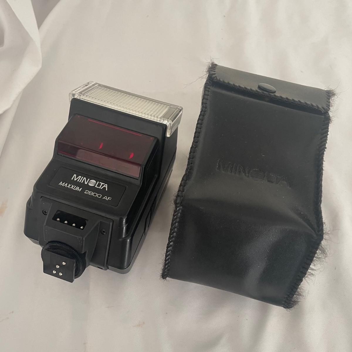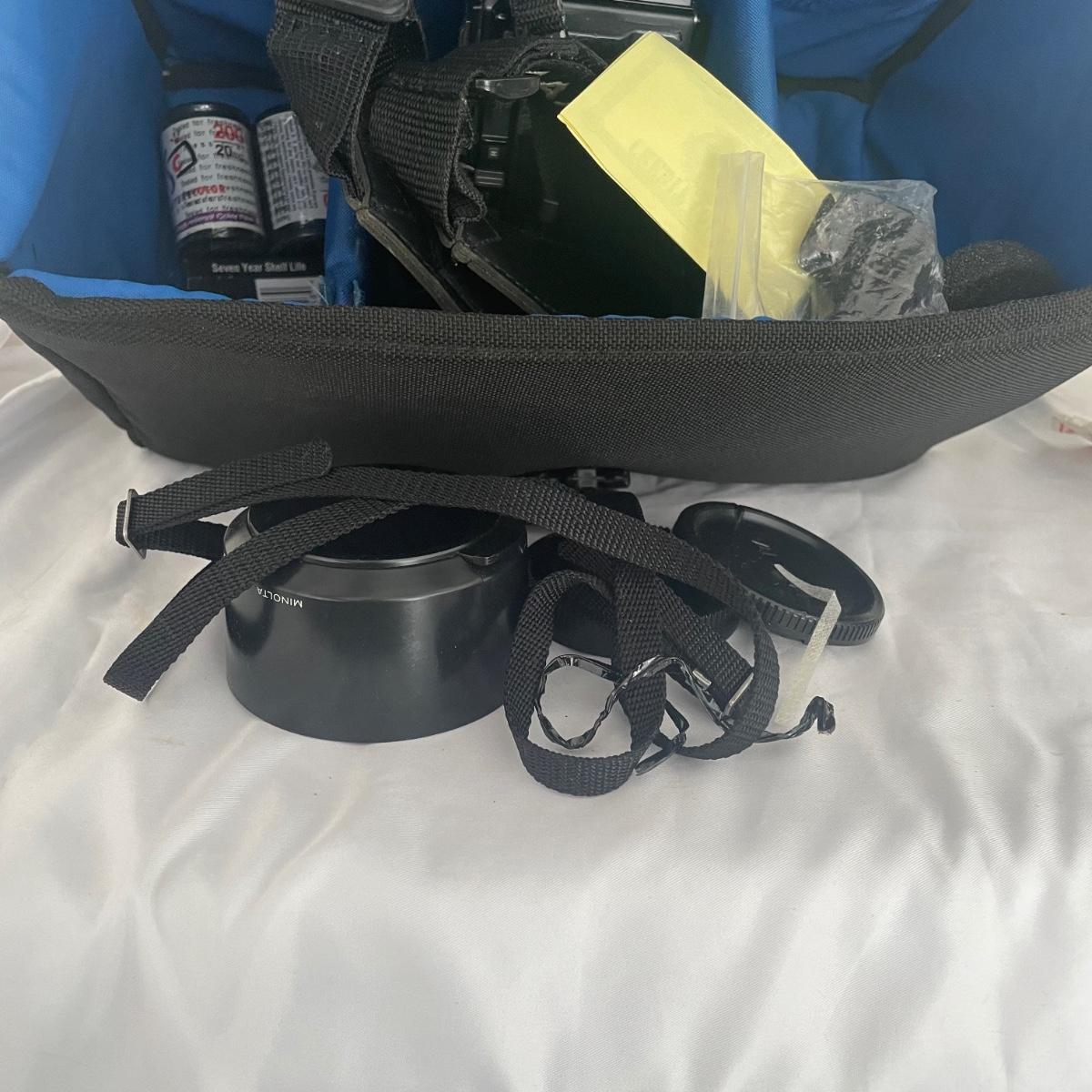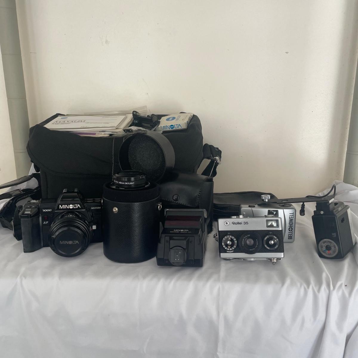 Lot includes Minolta Maxxum 7000, Minolta 100-200 lens and 2800 flash, Vivitar 252 flash, Rollei 35 mm camera, Bell Howell 35 mm camera, case and more. Cameras were not tested.