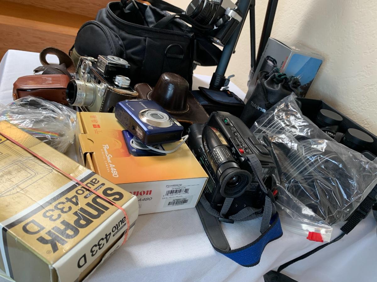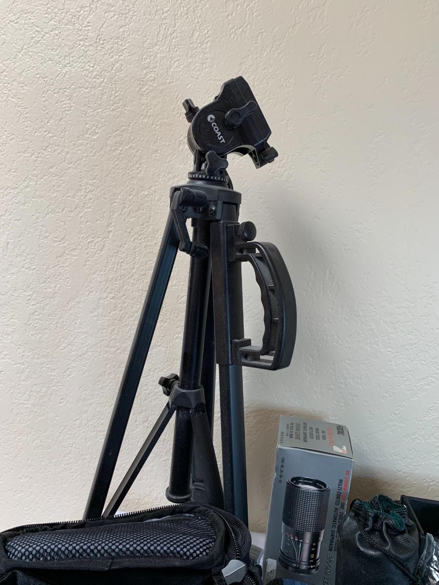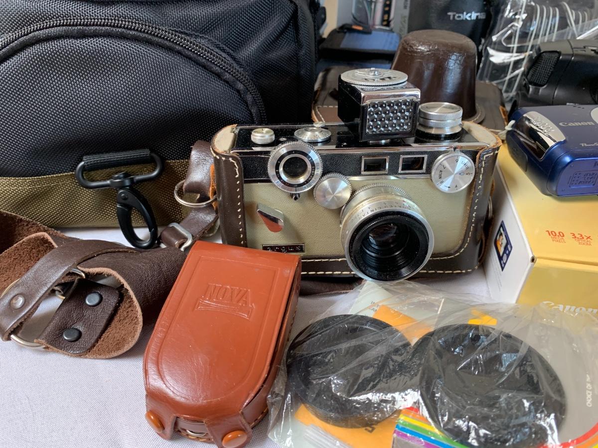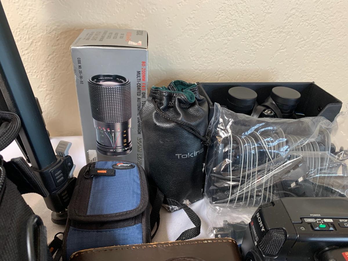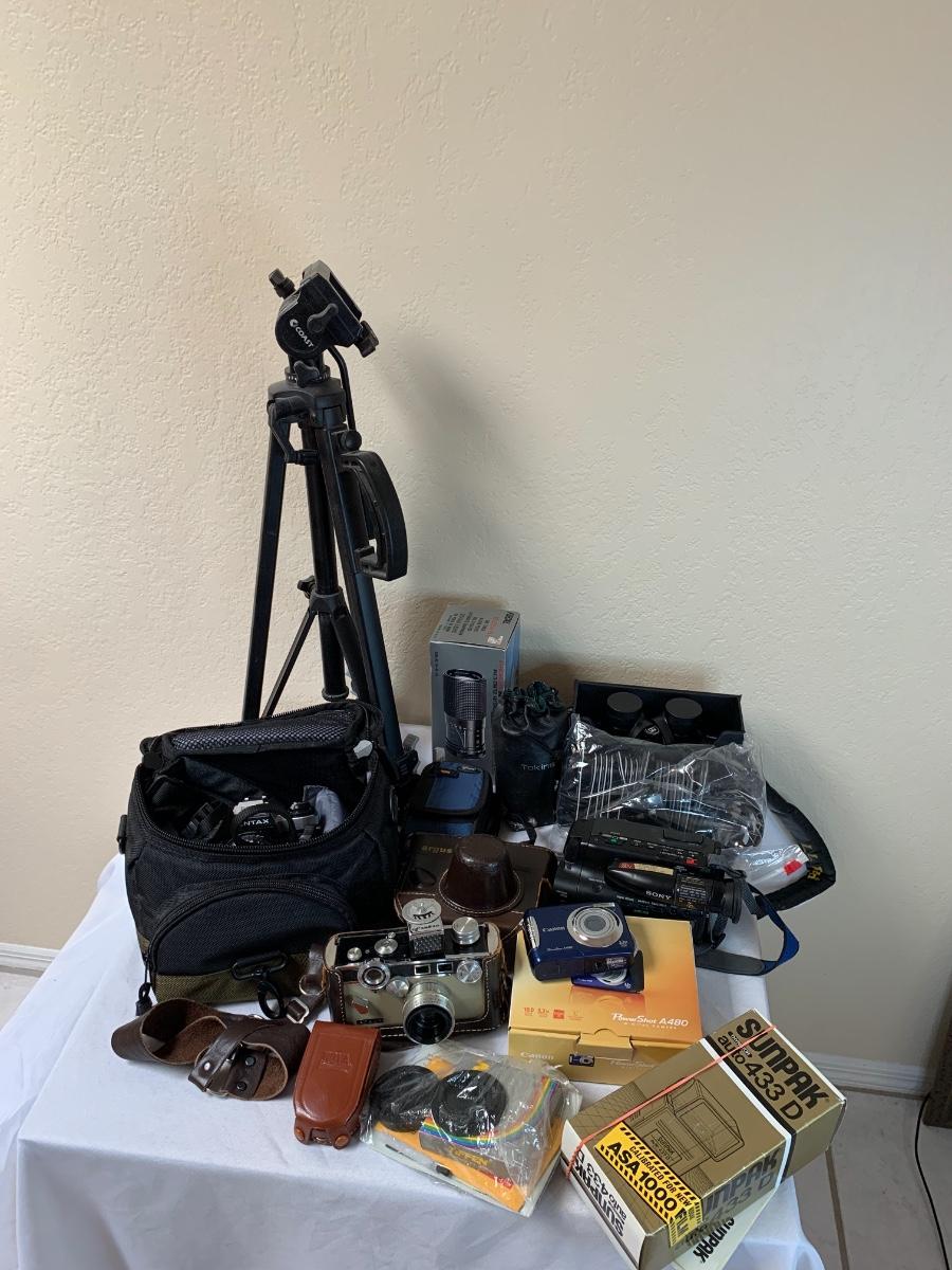 Assorted camera lot including one Argus LC3 camera, One coast tripod, Pentax program plus with cannon camera bag, Focal for Pentax 80-200 mm lens, Bushnell 7 by 35 binoculars, Sony video 8 handycam with bag and accessories. All in good to great condition, none tested****