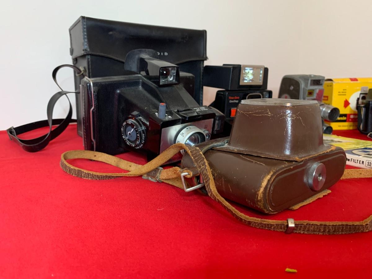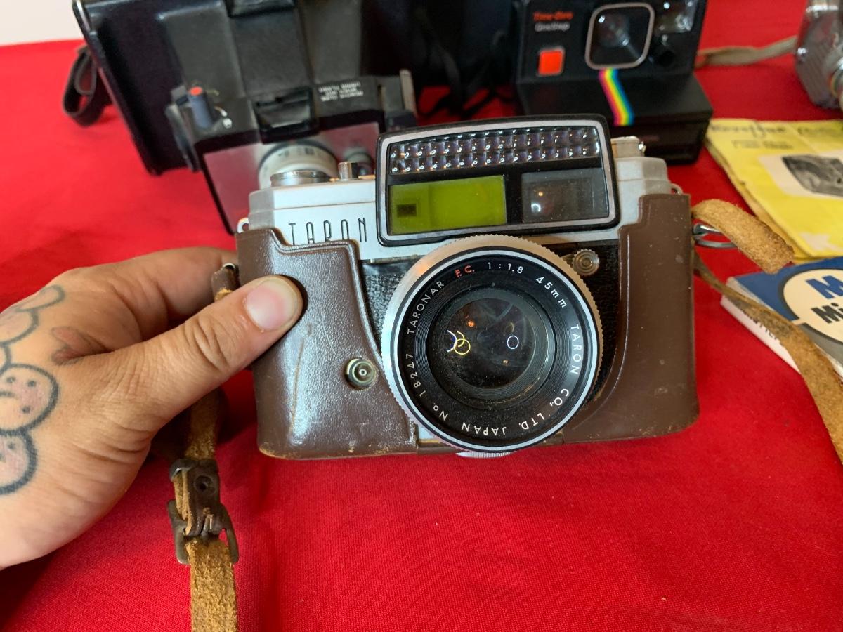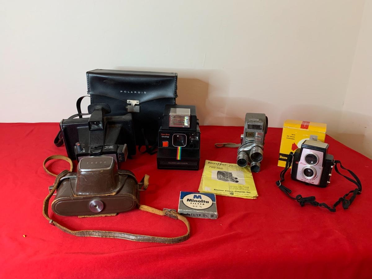 Lot includes various vintage cameras including Polaroid land cameras, Keystone KA-1C, Kodak Brownie Star Flex, Taron, and a Minolta Filter.