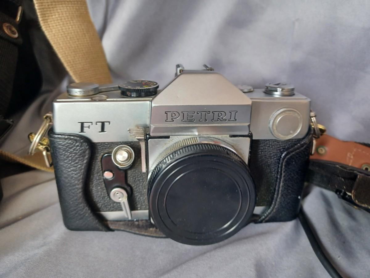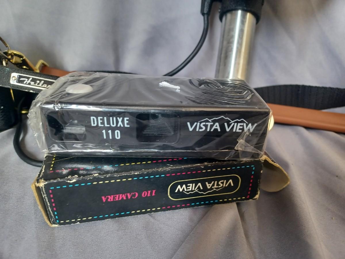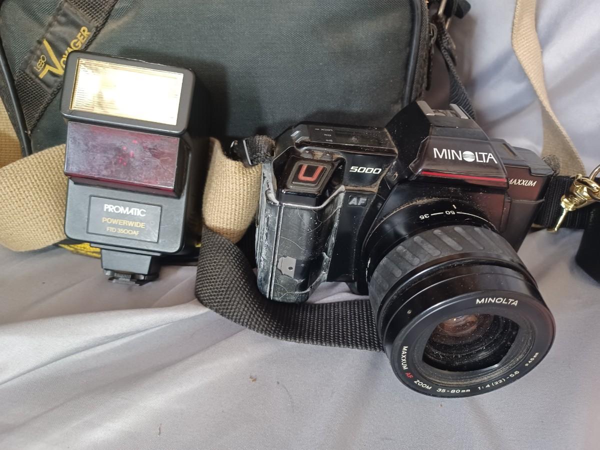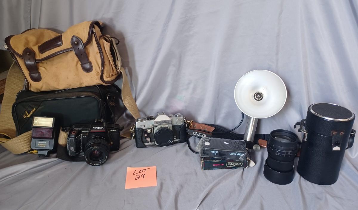 Cameras and 2 bags. Minolta Maxxum 5000 with Promatuc flas, Petri FT, Vista view deluxe 110 camera, and Vintage Heiland flash and lens
