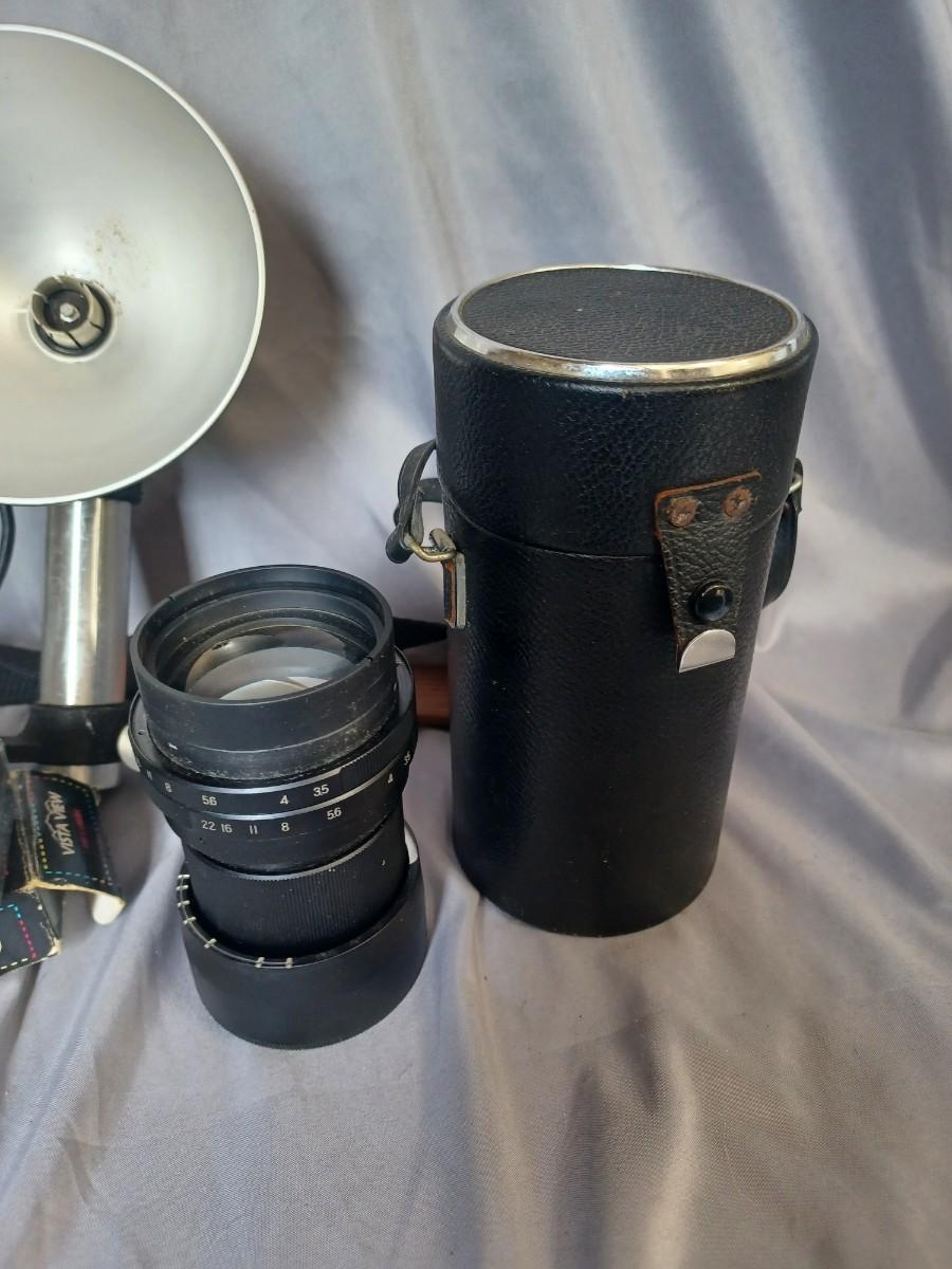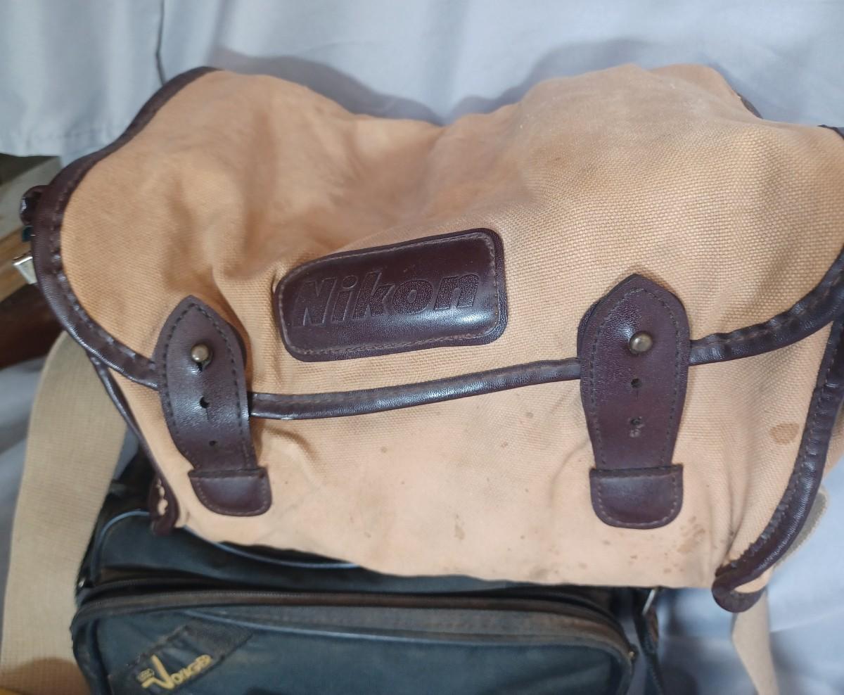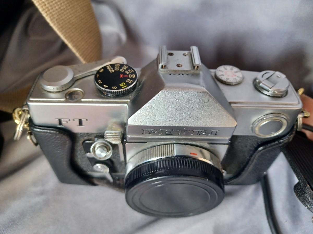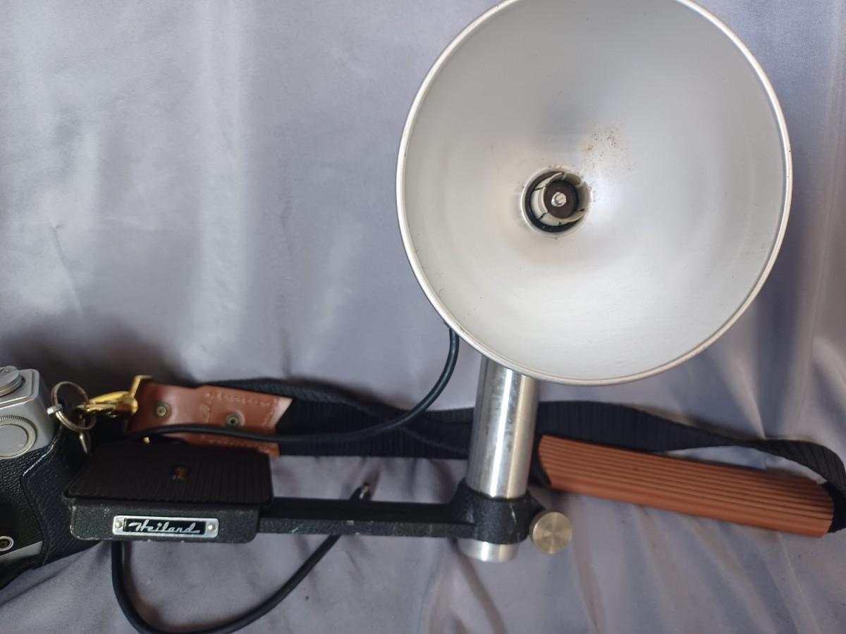 Cameras and 2 bags. Minolta Maxxum 5000 with Promatuc flas, Petri FT, Vista view deluxe 110 camera, and Vintage Heiland flash and lens
