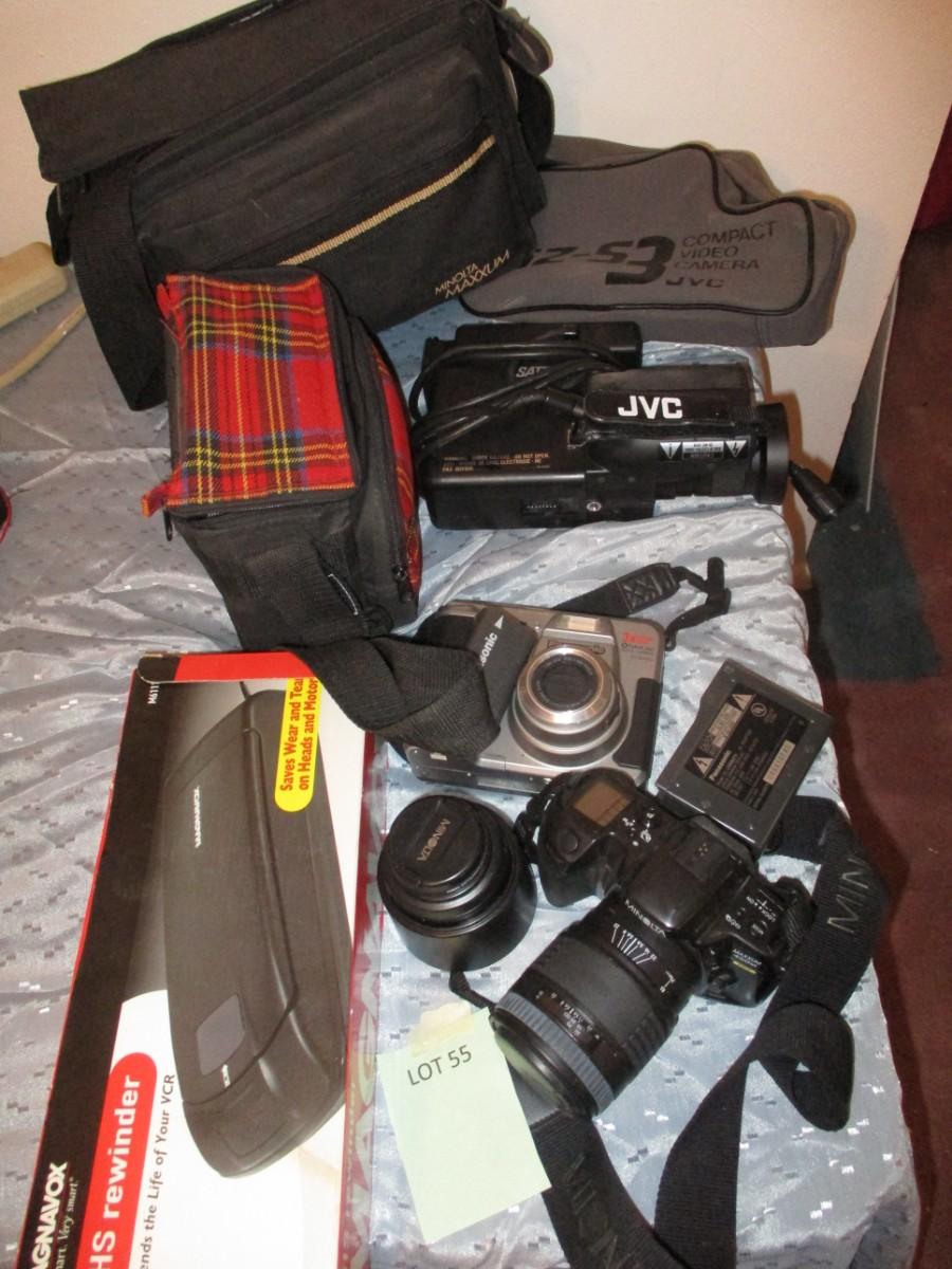 Minolta, Panasonic. JVC Video Recorder. Vhs Rewinder. Camara Bags. Lens. Can't guarantee any work.