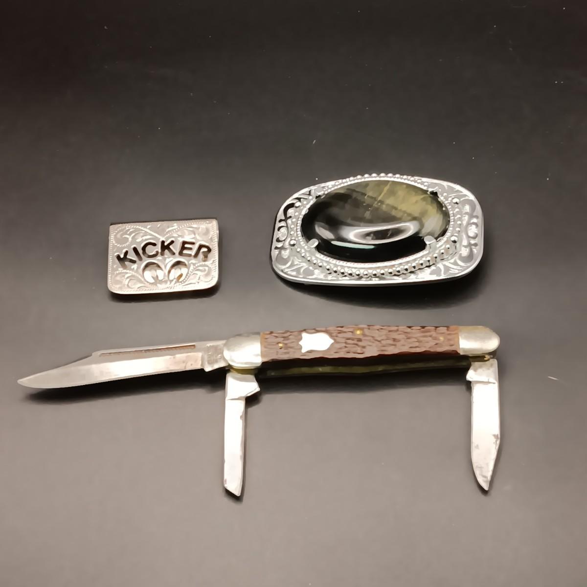 CAMILLUS POCKET KNIFE, BELT BUCKLE & A HIP CLIP