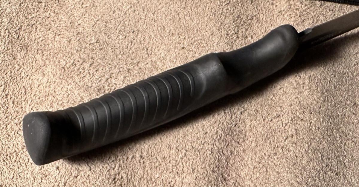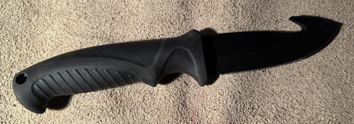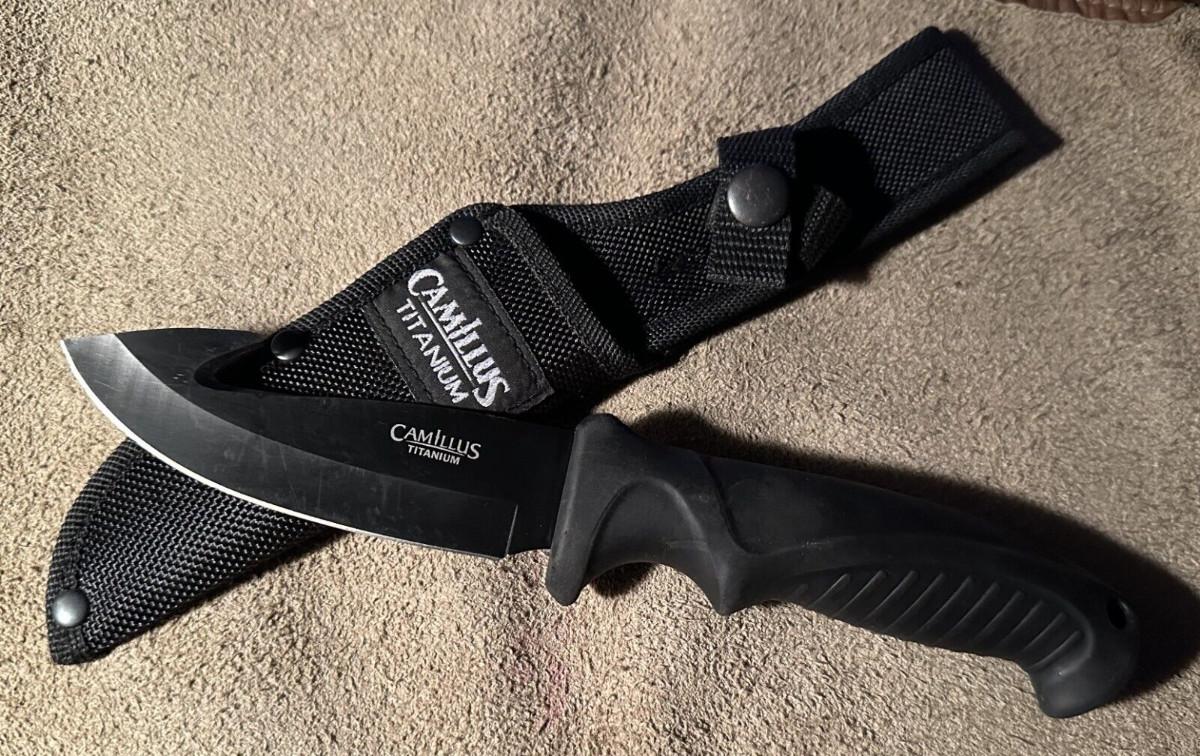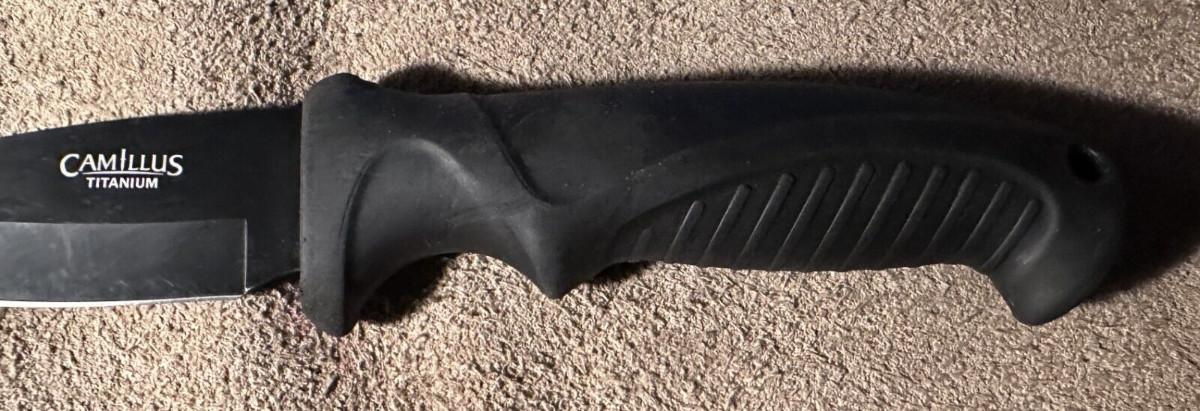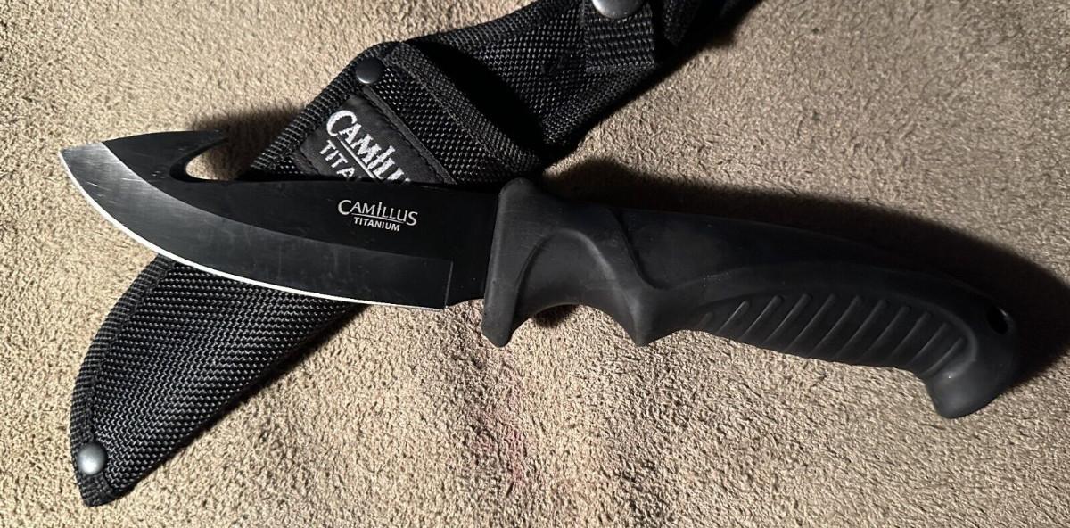 With very light use here is a USA made Camillus Titanium Gut Hook fixed blade hunting knife..9 3/4" overall length..4 3/8" blackened blade...Nice edge..Ergonomic rubber grip..includes a durable Camillus sheath.