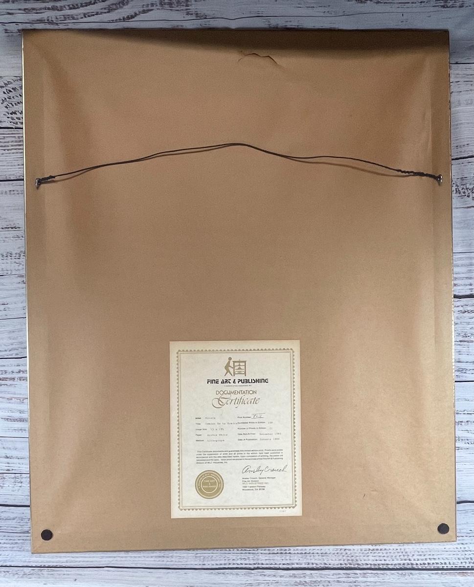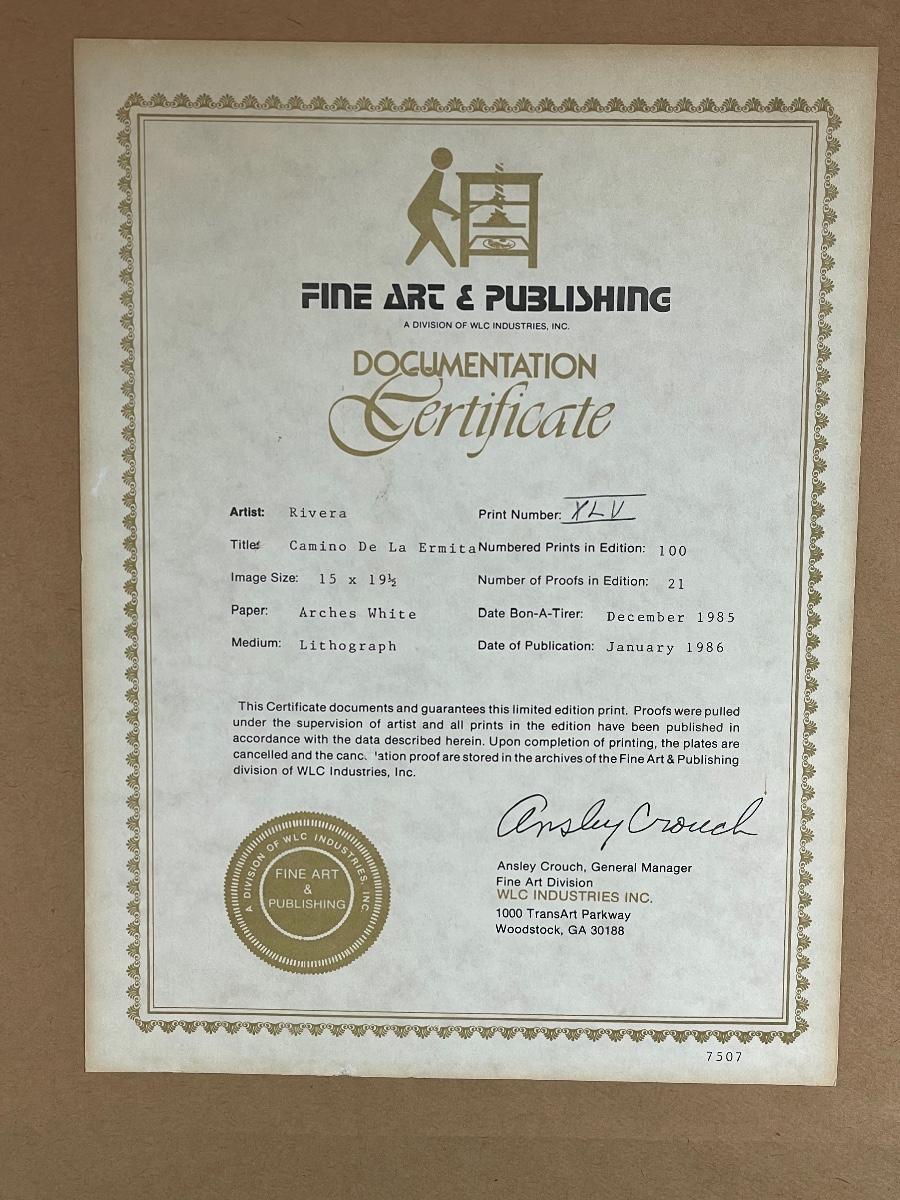 Item is in great condition. On the glass there is little to no scratches. The backing has a rip. The artist of this lithograph was Rivera and it was published on January 1986. This painting is approximately 29” tall.